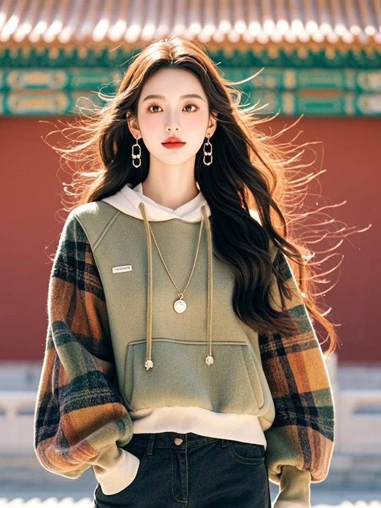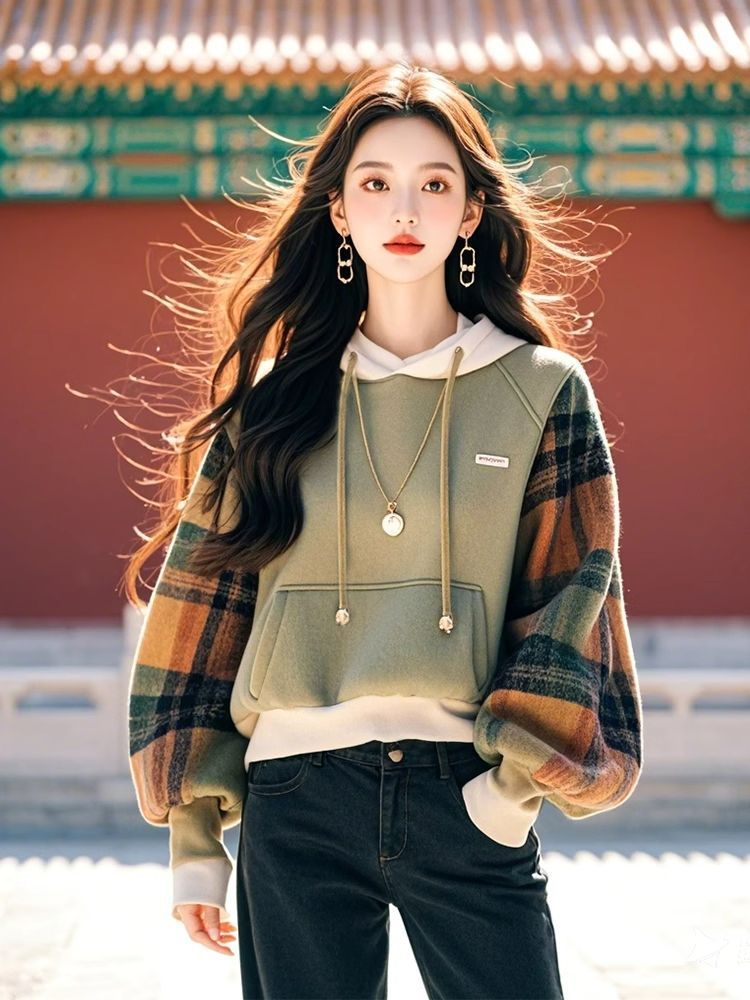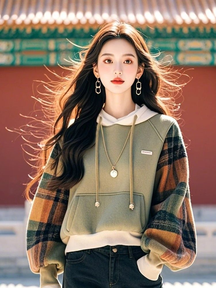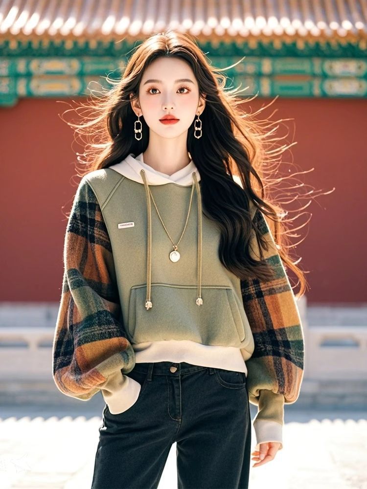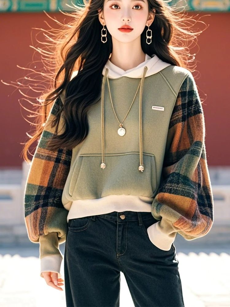 2024 겨울 새로운 폭발 미국 게으른 세련된 디자인 센스 녹색 격자 무늬 바느질 후드 기모 땀 여성