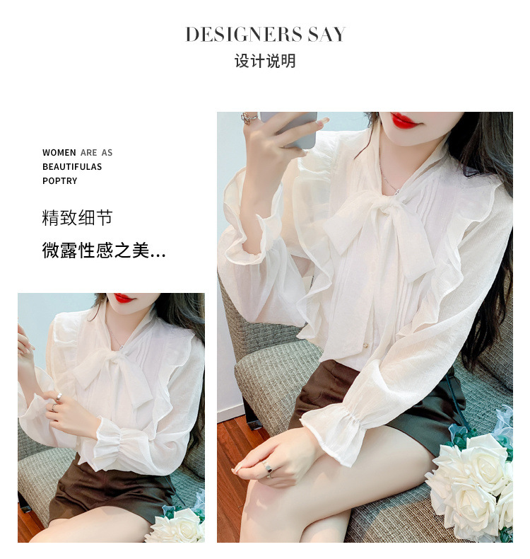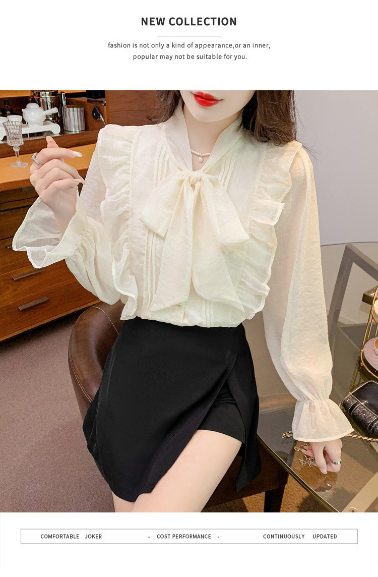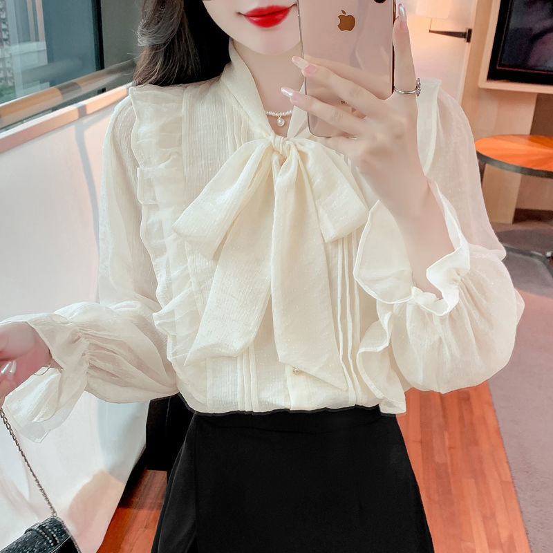 벨벳 리본 셔츠 여성용 2025 가을 겨울 신상 루즈핏 달콤한 쉬폰 셔츠 벨소매 셔츠 다용도 상의