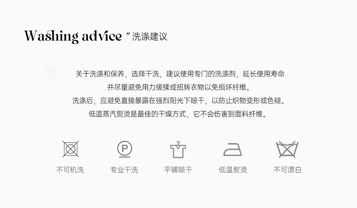 温馨提示: 一.服装正常 先涤手洗或机洗都可以,不论撞色、单色都不可以长时间浸泡,随浸随洗,防止沾色或褪色; 【洗涤说明/晾晒方式:建议手洗、冷水洗、随浸随洗】彩色不要用强! 二.不可刷洗、绞拧或用力搓揉,防止面料起毛起球; 三.深颜色针织磨毛、卫衣抓绒面料,水洗时会有轻微浮毛现象,属于面料特性,不影响穿着; 四.高品质毛呢、双面毛呢面料,清洁时需到专业干洗机构处理,不建议手洗或机洗,防止缩水变形,悬挂保存,定期晾晒,注意防霉防虫; 五.所有可脱卸的部位都要分开洗涤,防止沾色或其他问题