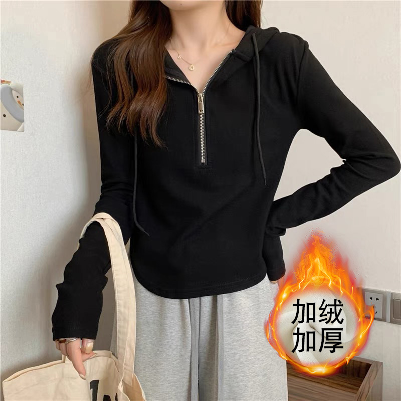 가을과 겨울 새 기모 후드 긴팔 스웨터 여성 디자인 센스 니쉬 쇼트 탑 작은 내베이스 셔츠