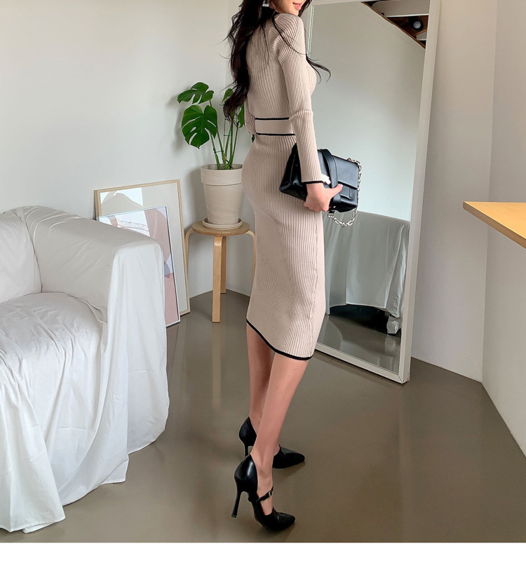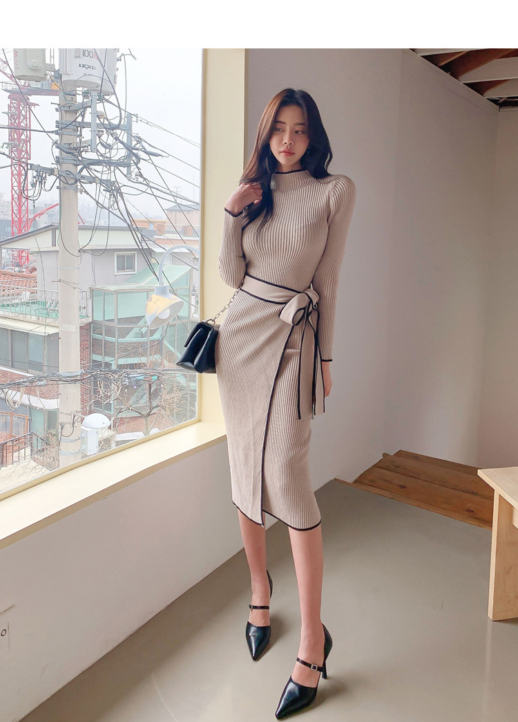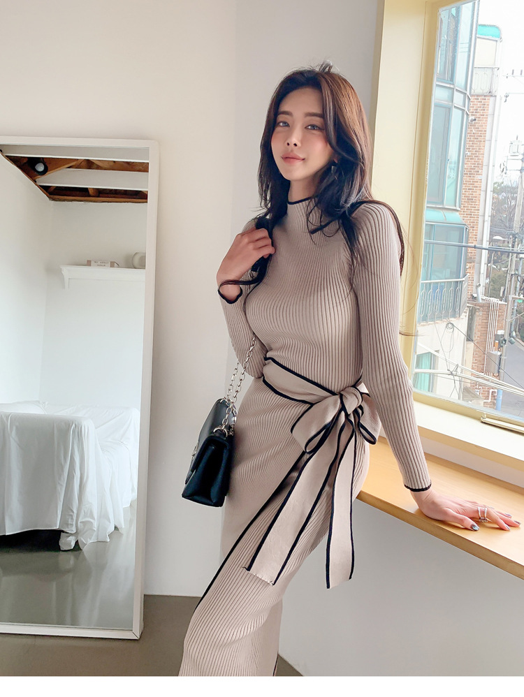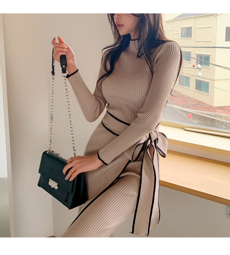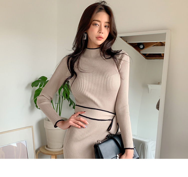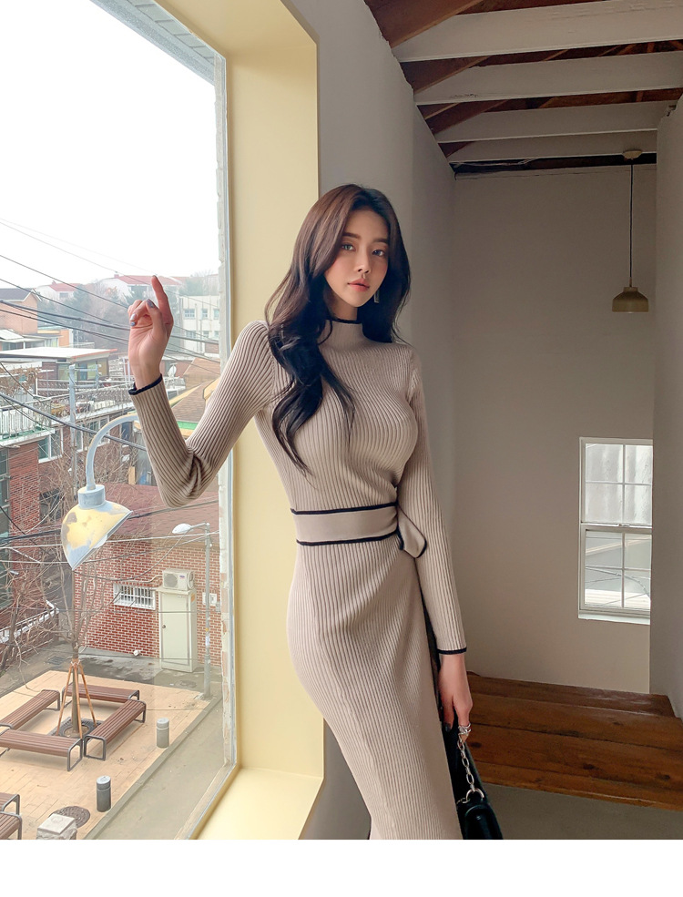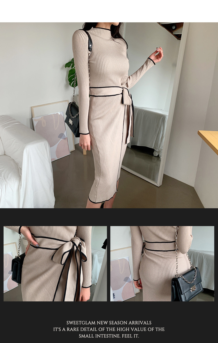 한국 세련된 가을과 겨울 빈티지 틈새 반 터틀넥 슬림 핏 우아한 색상 매칭 중간 길이 스트랩 니트 원피스 여성스토어 가기