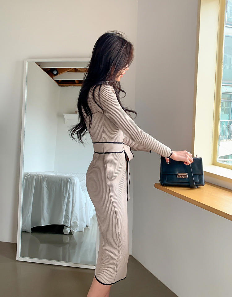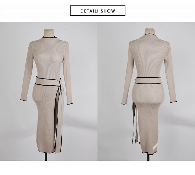 한국 세련된 가을과 겨울 빈티지 틈새 반 터틀넥 슬림 핏 우아한 색상 매칭 중간 길이 스트랩 니트 원피스 여성