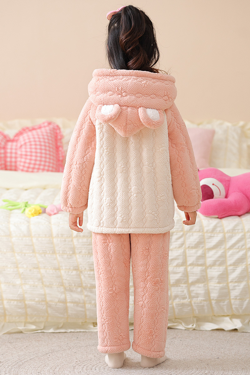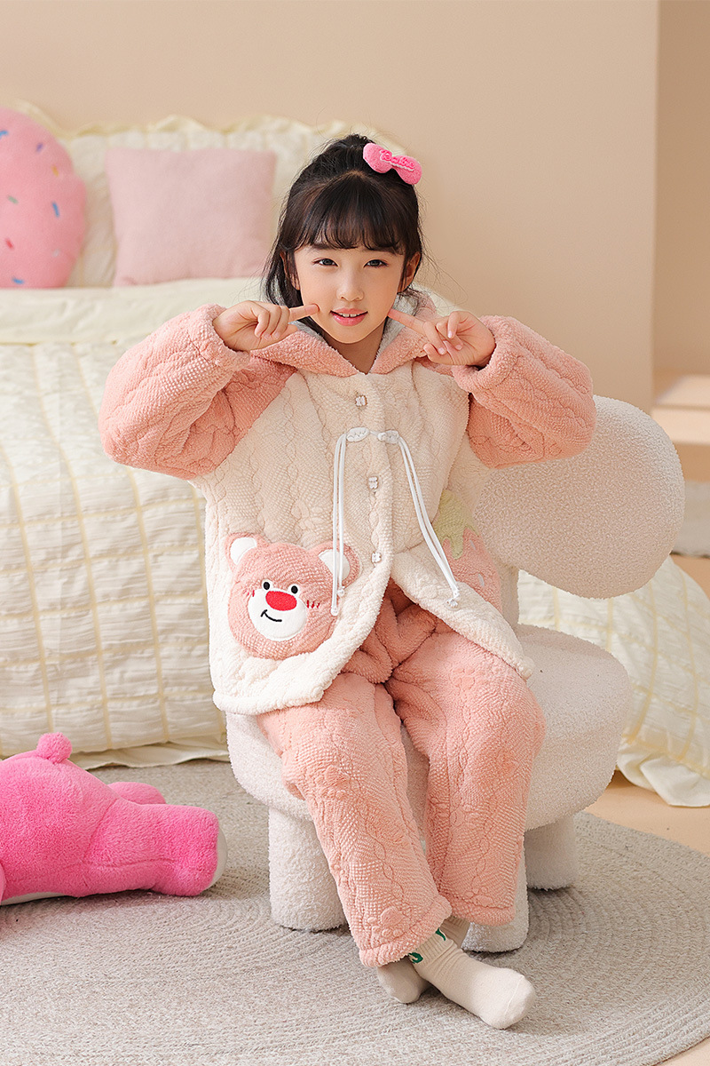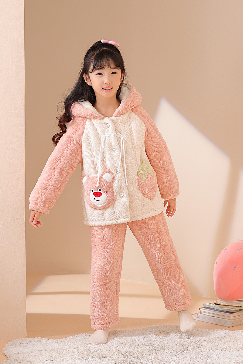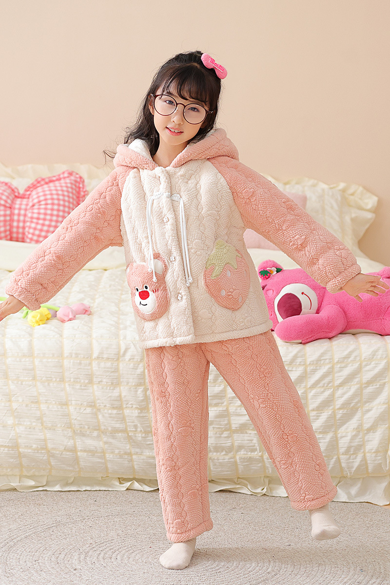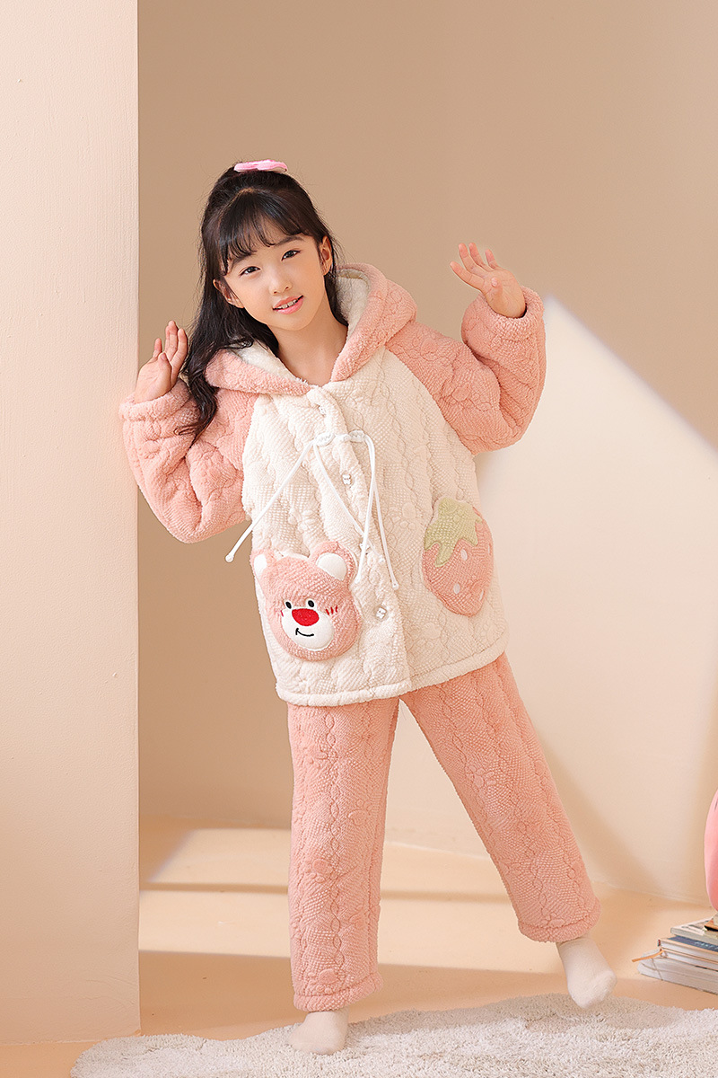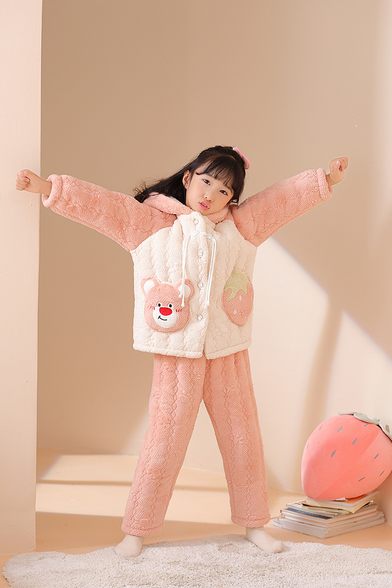 핑크 곰 어린이 잠옷 겨울 플란넬 3 층 퀼트 아이들의 집 옷 세트 머리카락