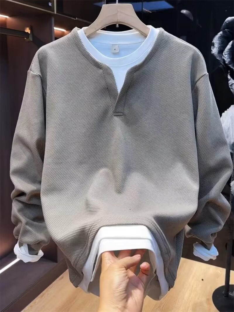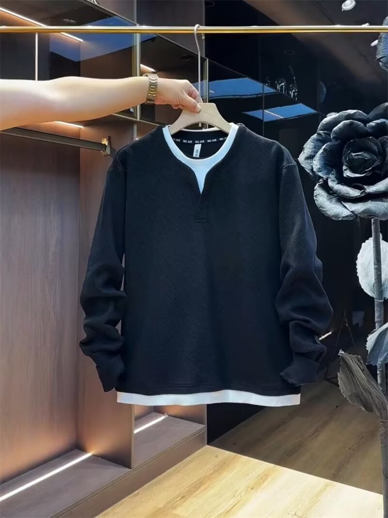 가을 새로운 남성 가짜 2 피스 캐주얼 스웨터 트렌디 패션 풀오버 긴팔 베이스 셔츠 슬림-핏 올 매치 티셔츠스토어 가기