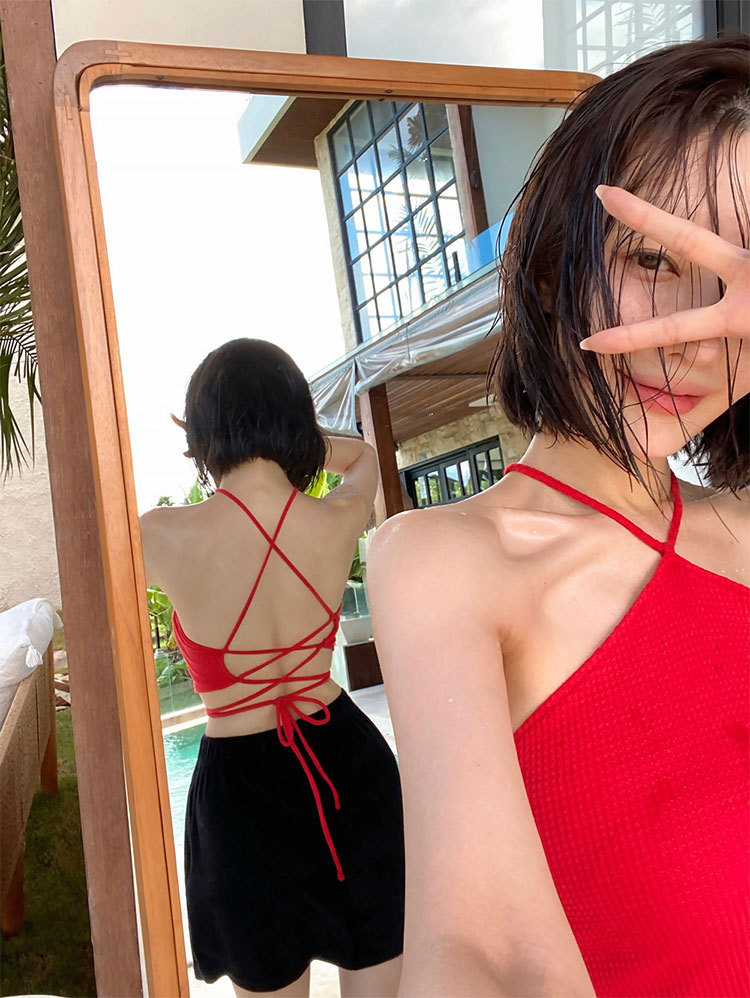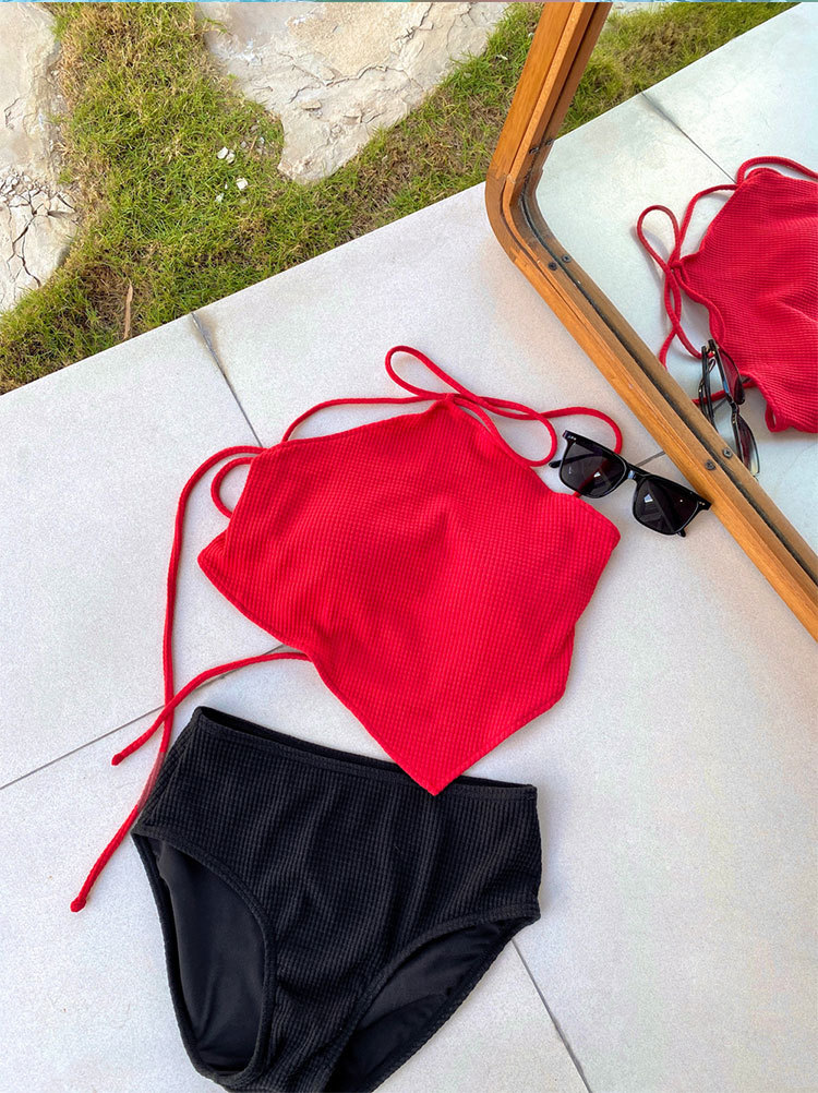 2025 한국 신형 대외 무역 배꼽 벨트 섹시한 홀터넥 스트랩 스플릿 비키니 하이 웨이스트 여성용 온천 크로스 보더 수영복