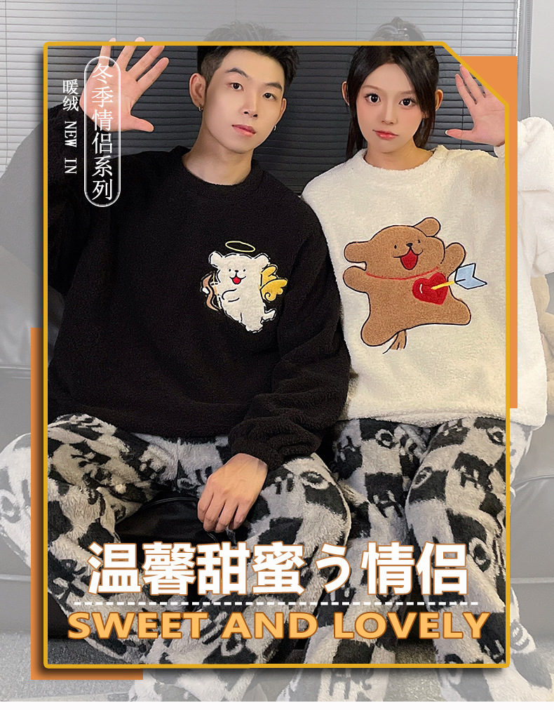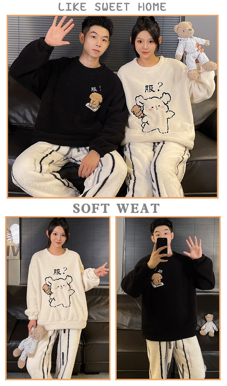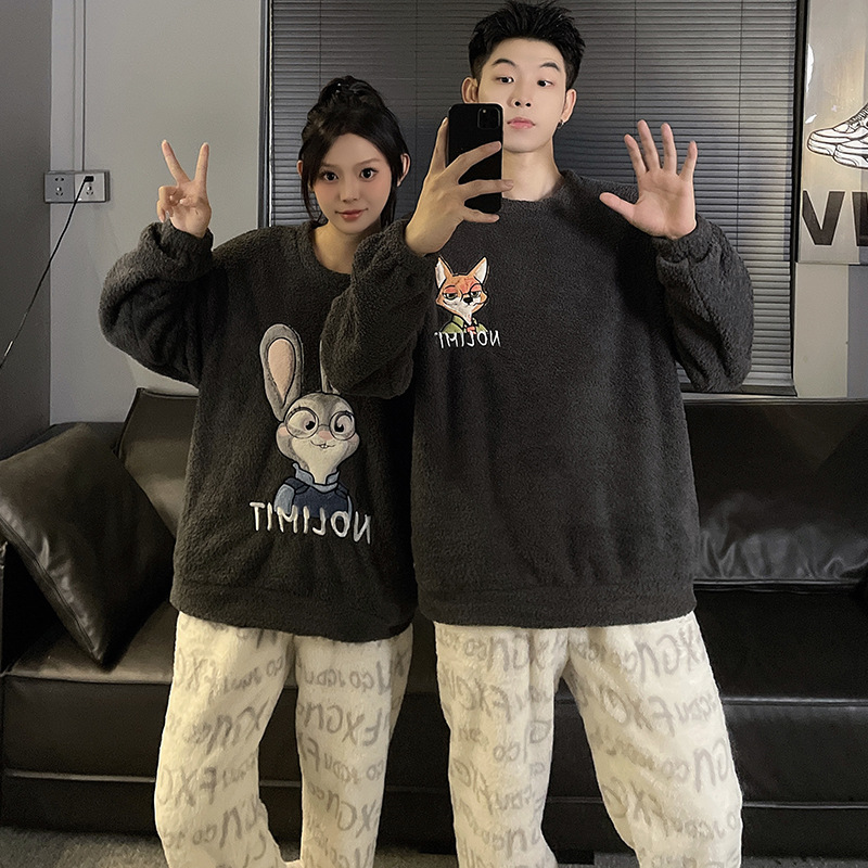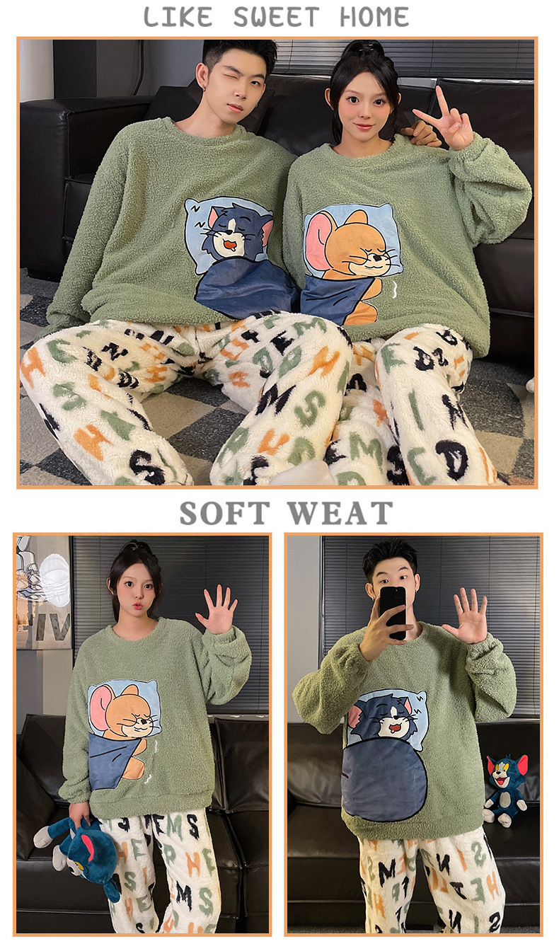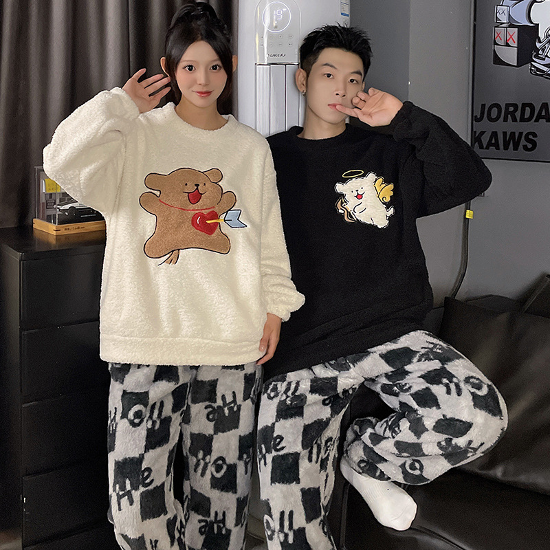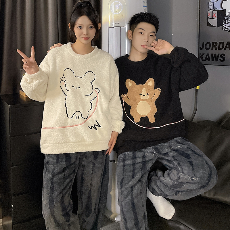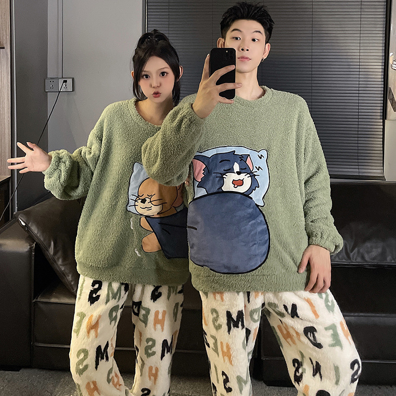 산호 벨벳 커플 잠옷 여성의 가을과 겨울 기모 두꺼운 만화 귀여운 플란넬 남성 홈 의류 세트스토어 가기