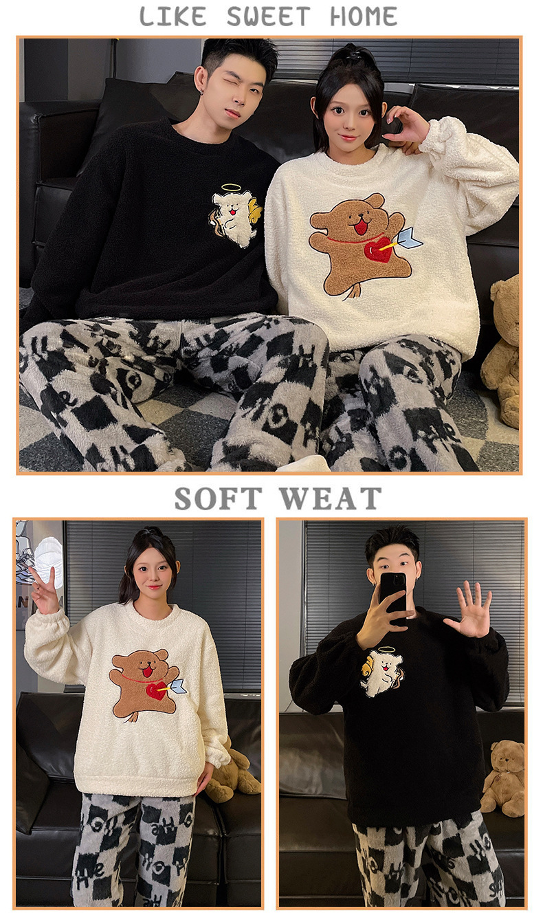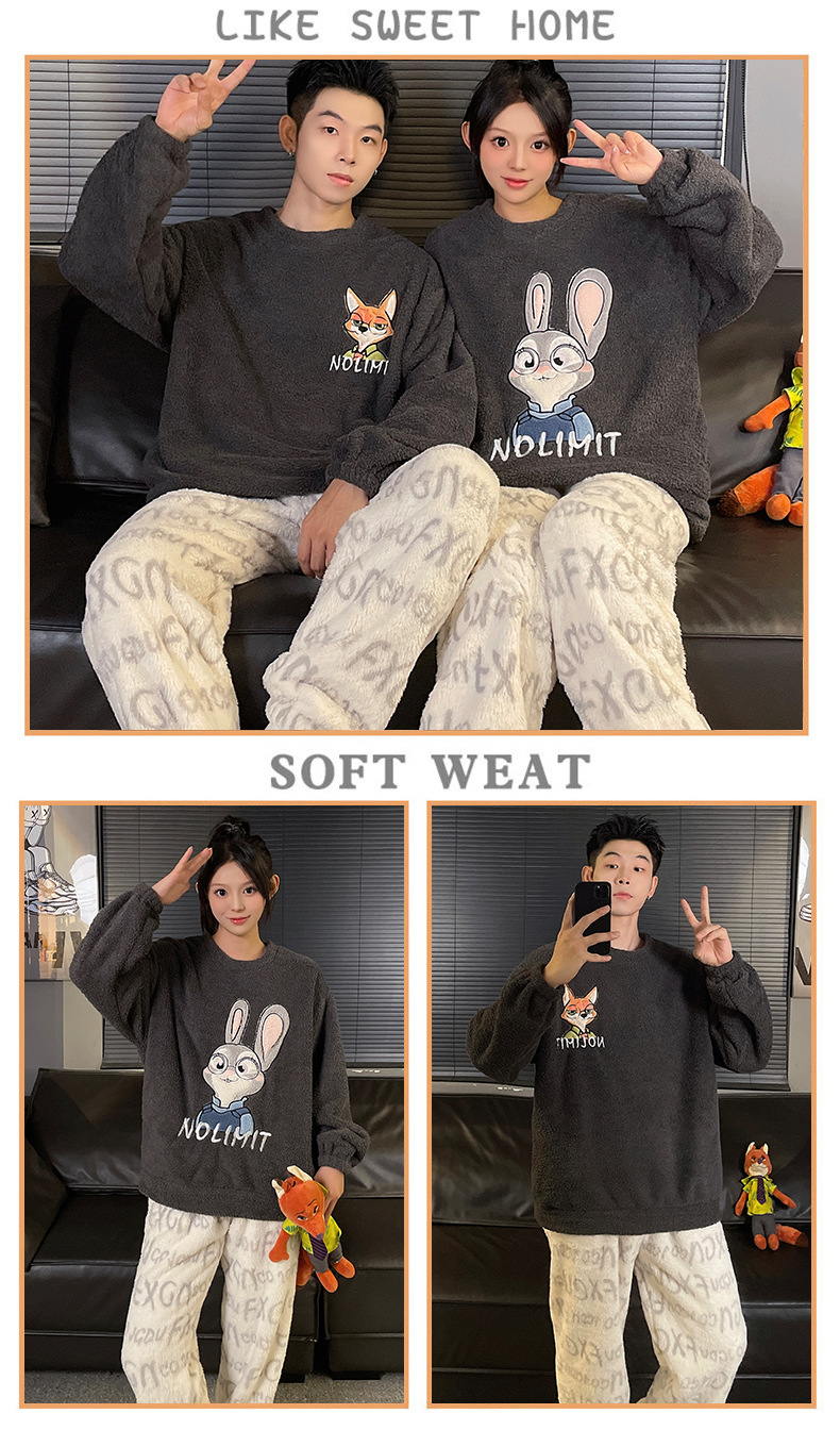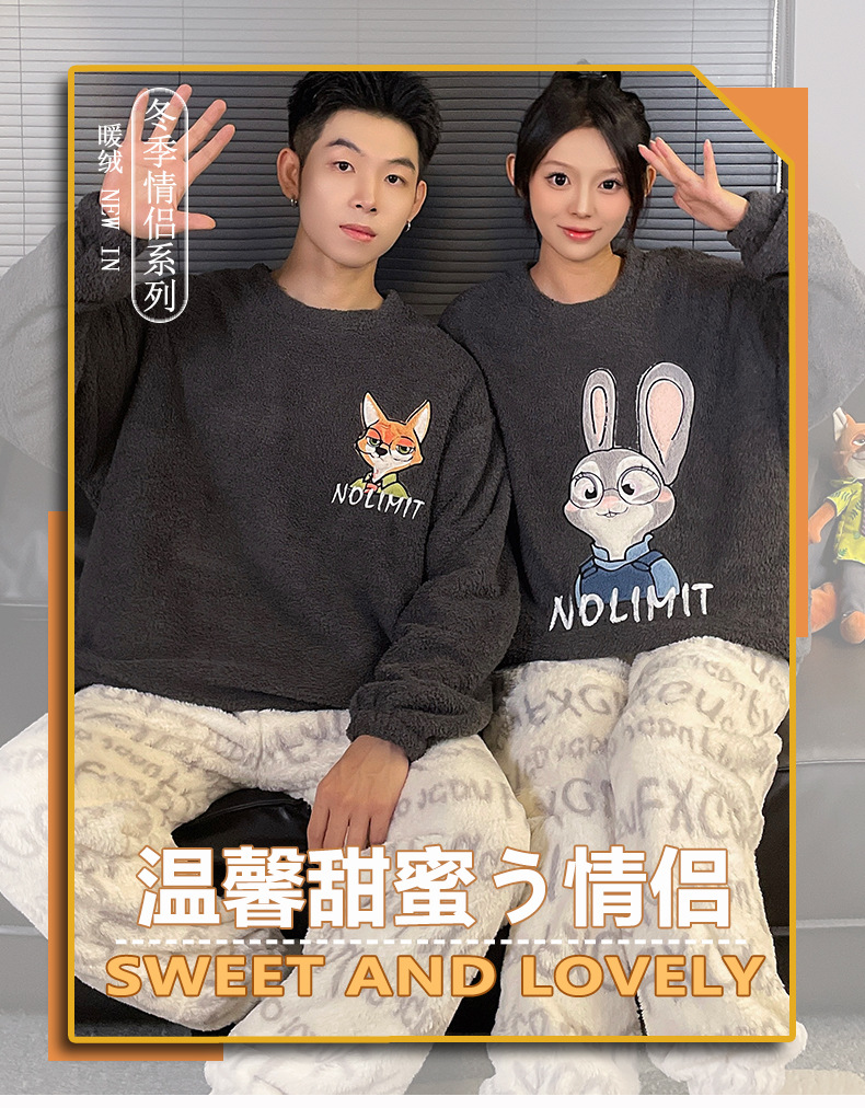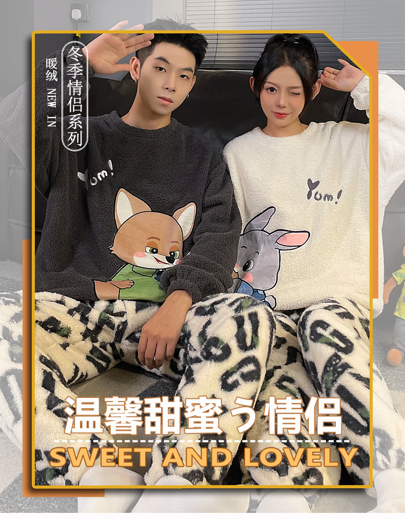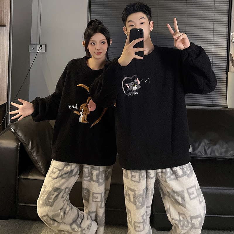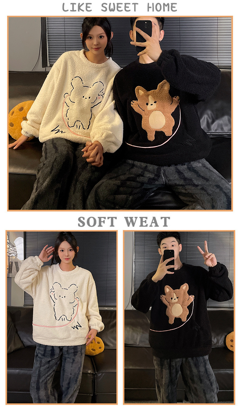 산호 벨벳 커플 잠옷 여성의 가을과 겨울 기모 두꺼운 만화 귀여운 플란넬 남성 홈 의류 세트스토어 가기