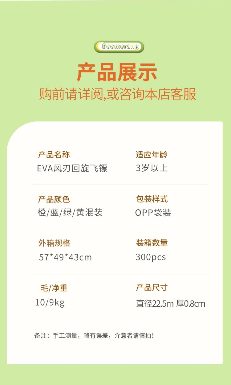 注意:回旋镖要达到回旋效果,需要多加练习,不是轻易就能达到回旋效果,或者轻易就能回到手里,这款是益智行产品,可以先行看下视频,不要买回去说自己不会玩,或者没想象的好就退货,这样退货运费请自行承担,在意勿拍!!