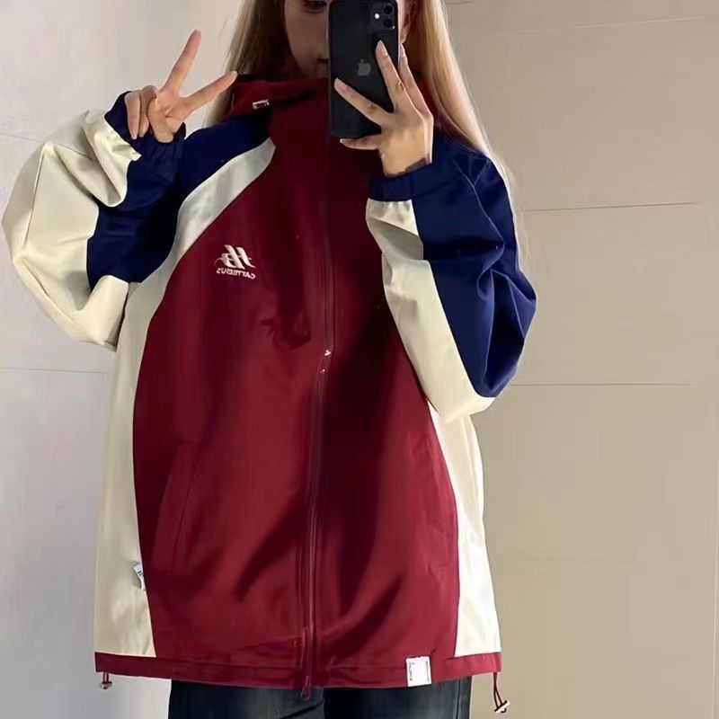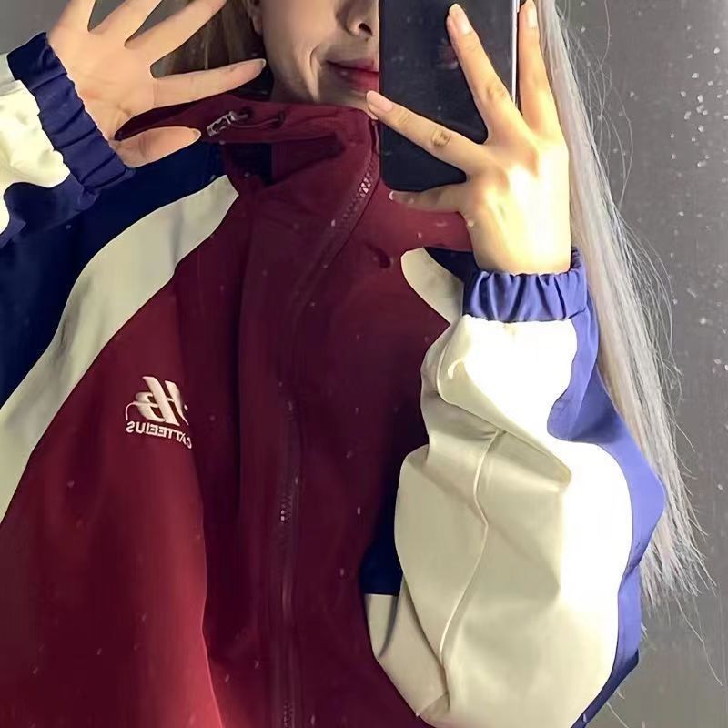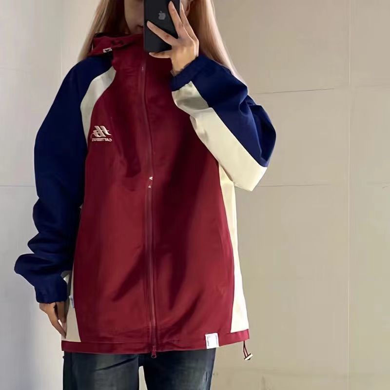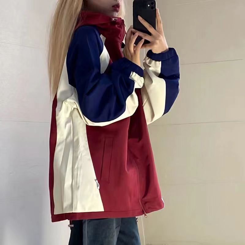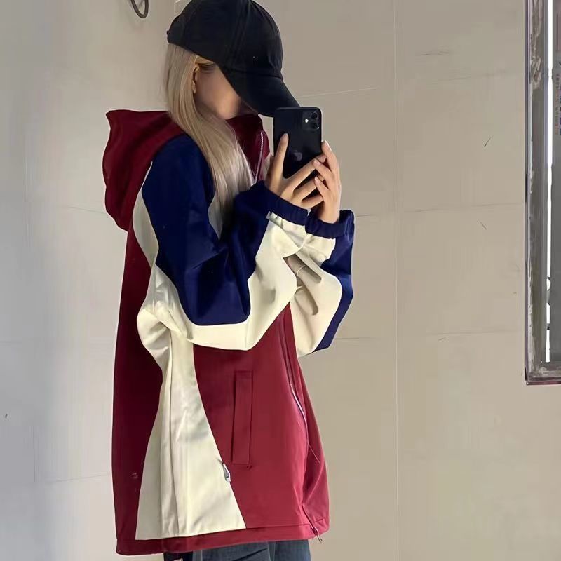 아메리칸 스트리트 레트로 봄과 가을 새로운 야외 커플 충전 의류 후드 컬러 매칭 재킷 여성 스포츠 재킷 탑