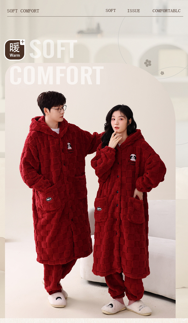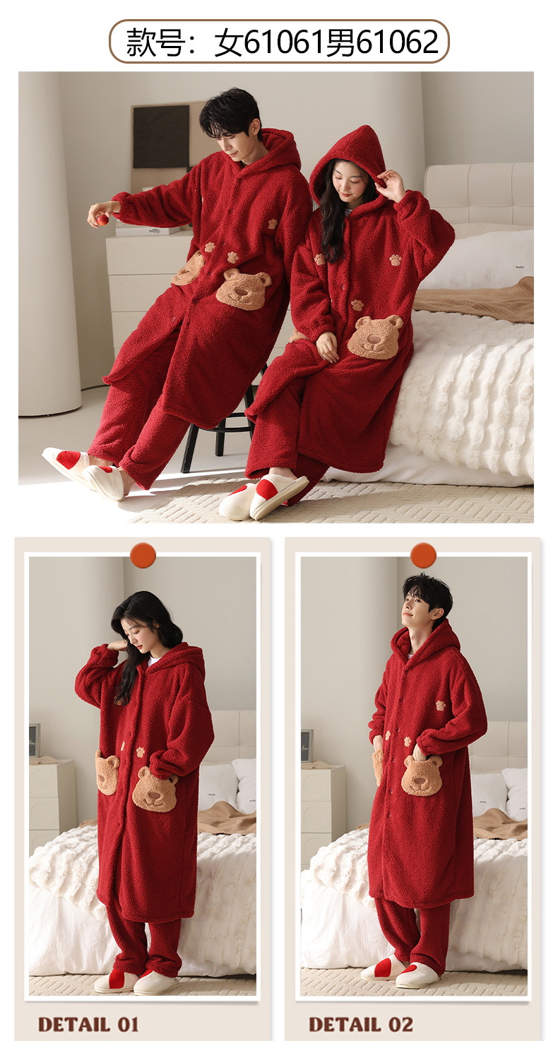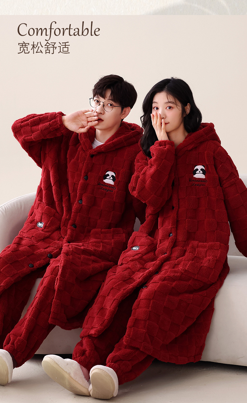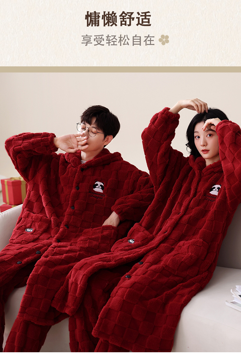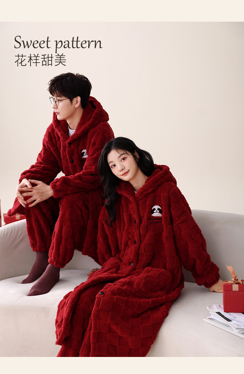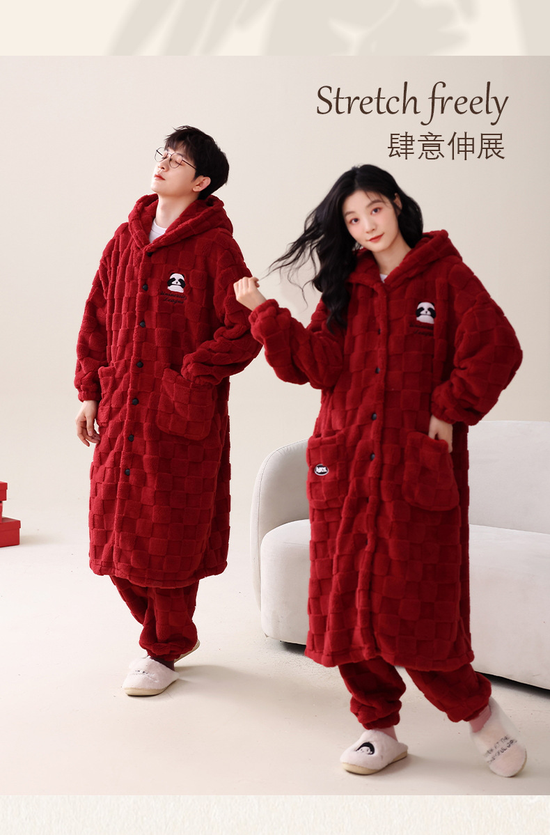 빨간 커플 잠옷 여성의 가을과 겨울 기모 두꺼운 플란넬 바지 파자마 남자 결혼식 신혼 후드 세트