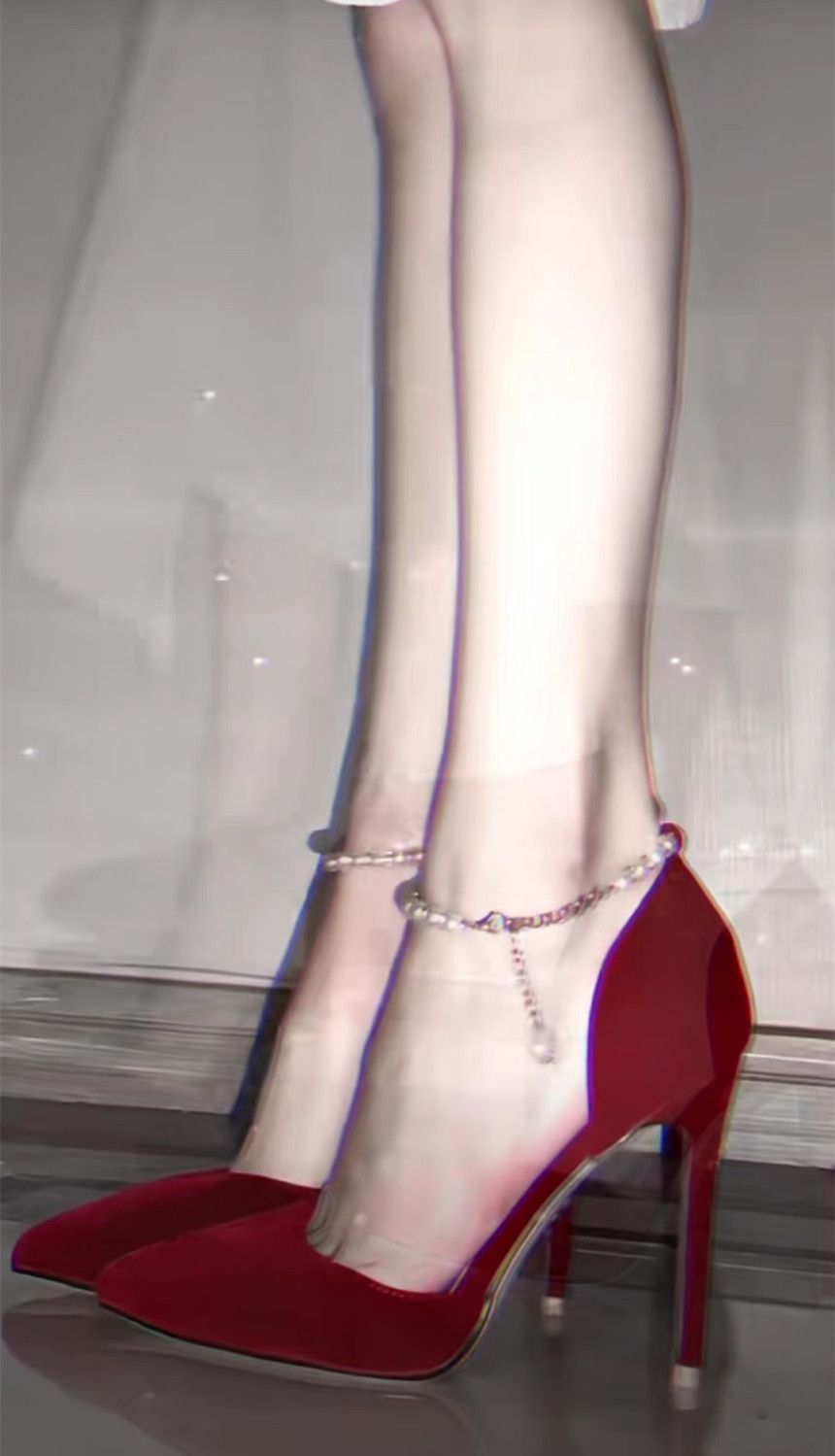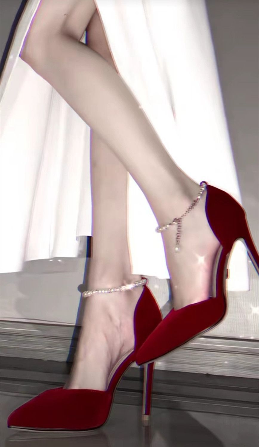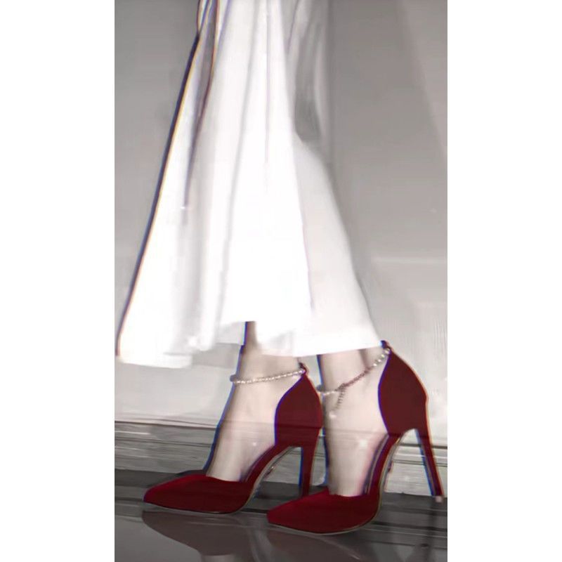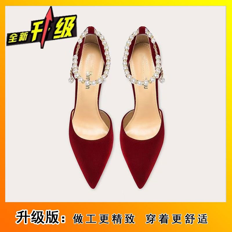 빨간색 단일 레이어 신발 2024 가을 새로운 진주 스틸레토 힐 디자인 센스 스트랩 틈새 프랑스 뾰족한 발가락 하이힐 신발스토어 가기