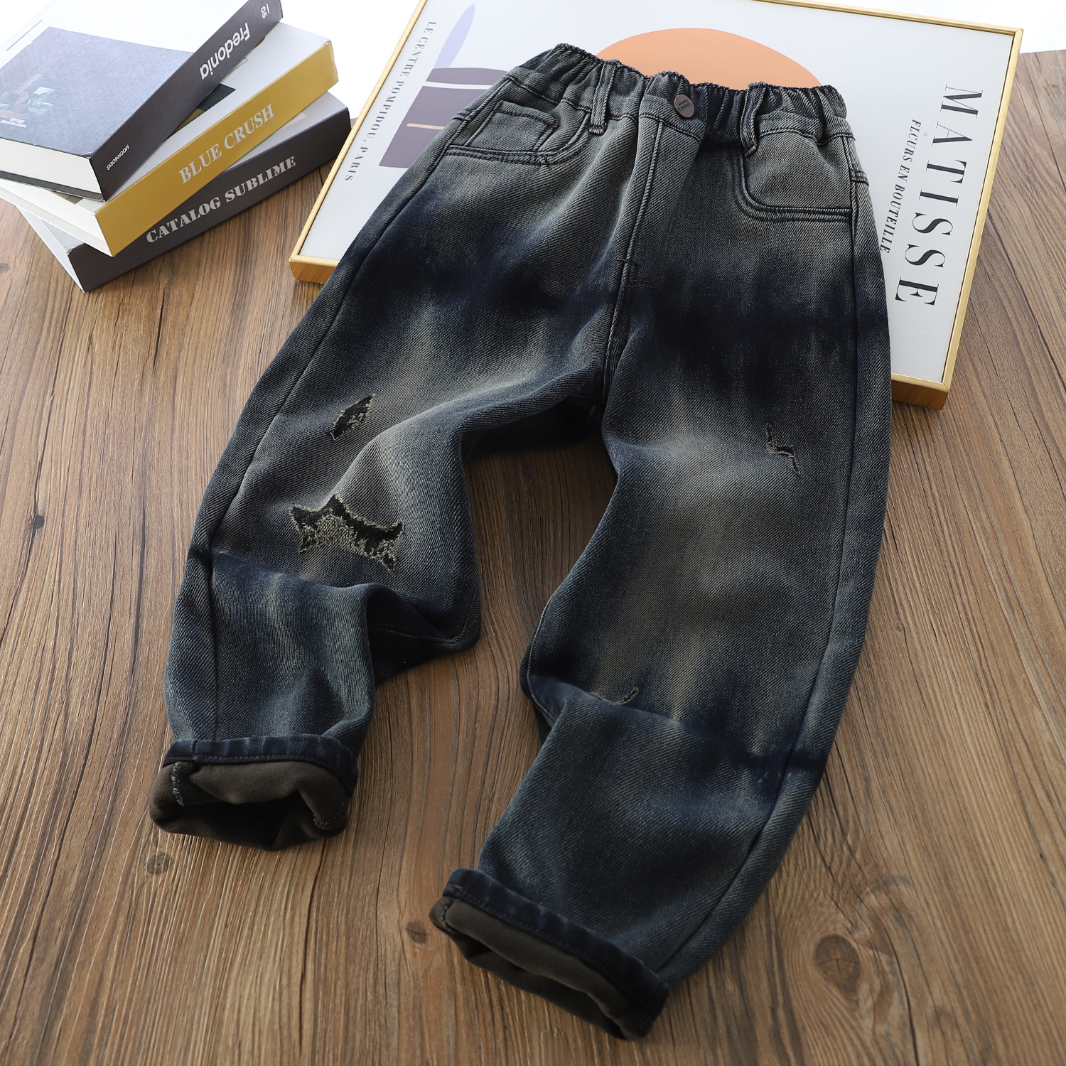 2024冬季新款 男童中大童做旧加绒保暖牛仔休闲裤
