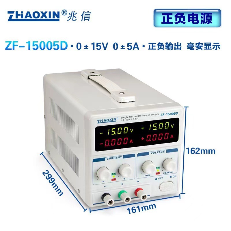 兆信ZF-15005D 0-15V-0-5A 正负输出线性直流稳压可调电源 实脸开发维修 , 正负电源连续可调  串联输出 , 四位 LED 数字 显示