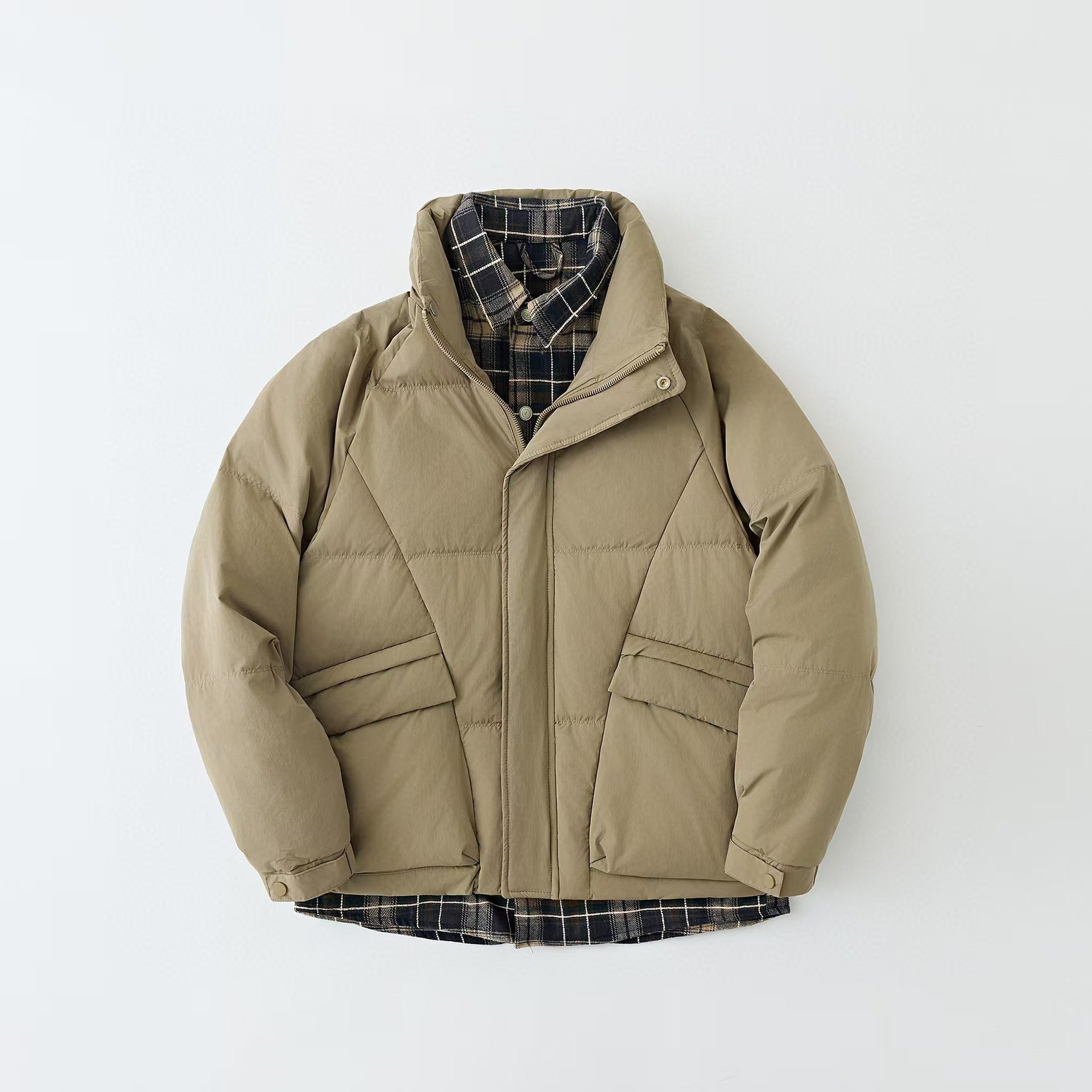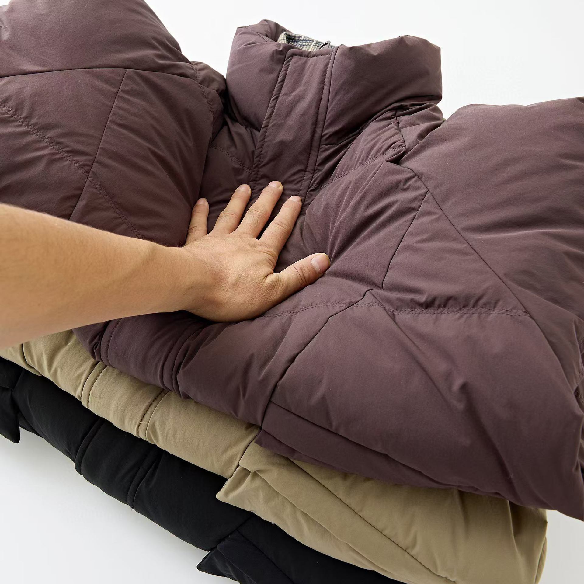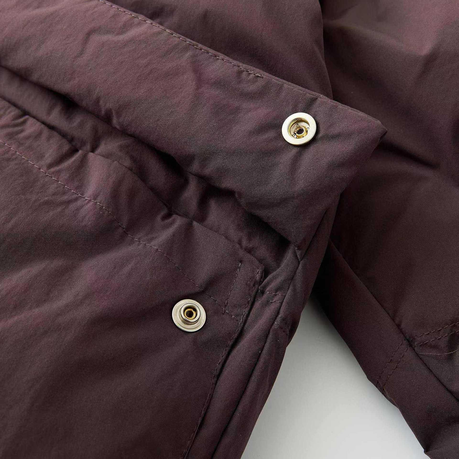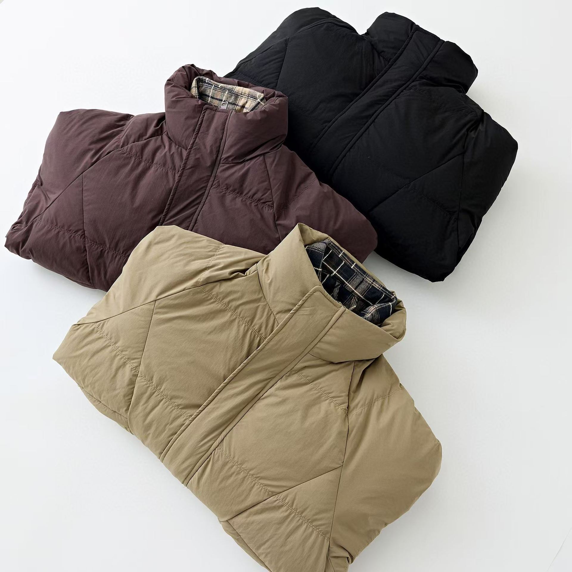内里白鸭绒填充,篙蓬松度,上身防峰保暖,立领设计,领口和袖口按扣调节,