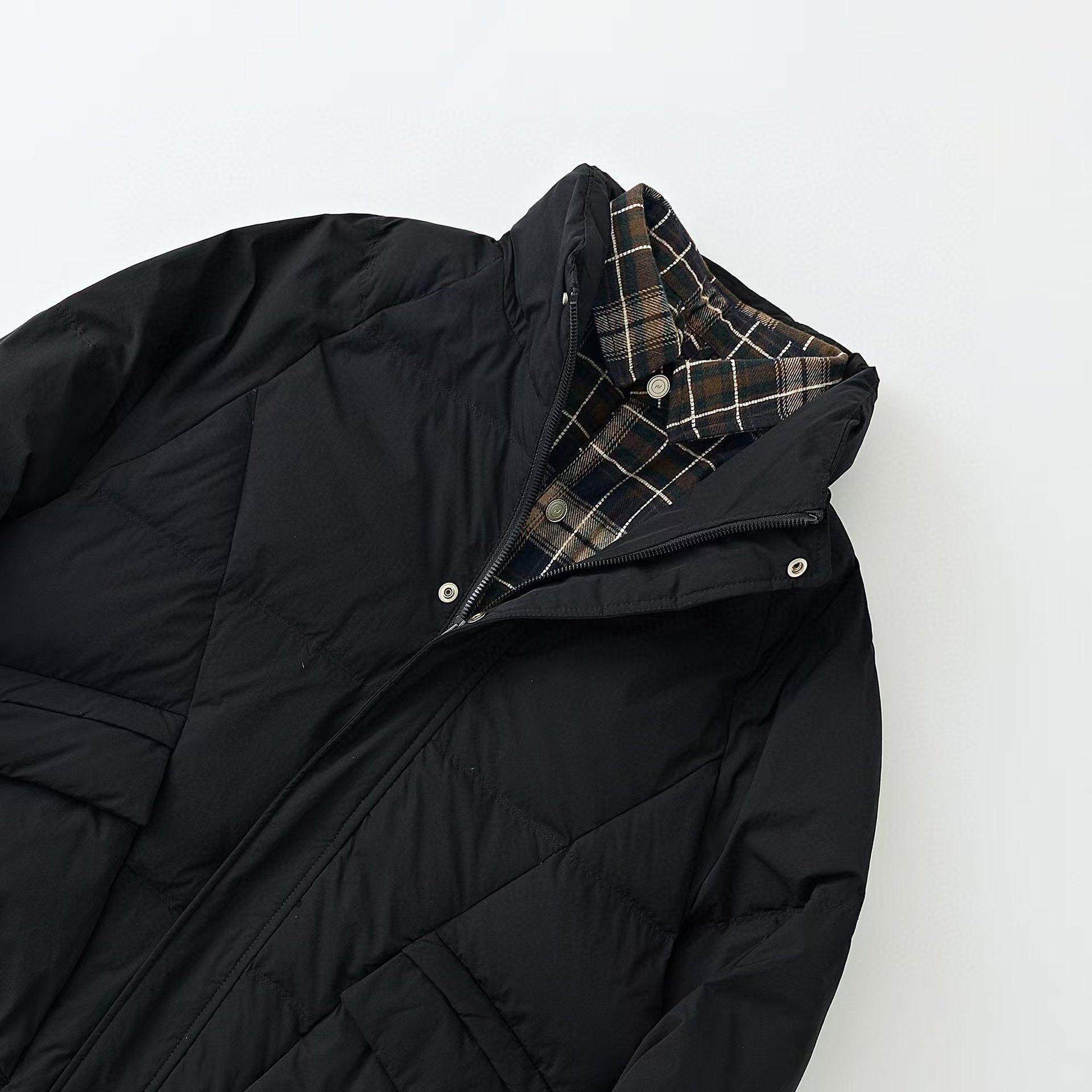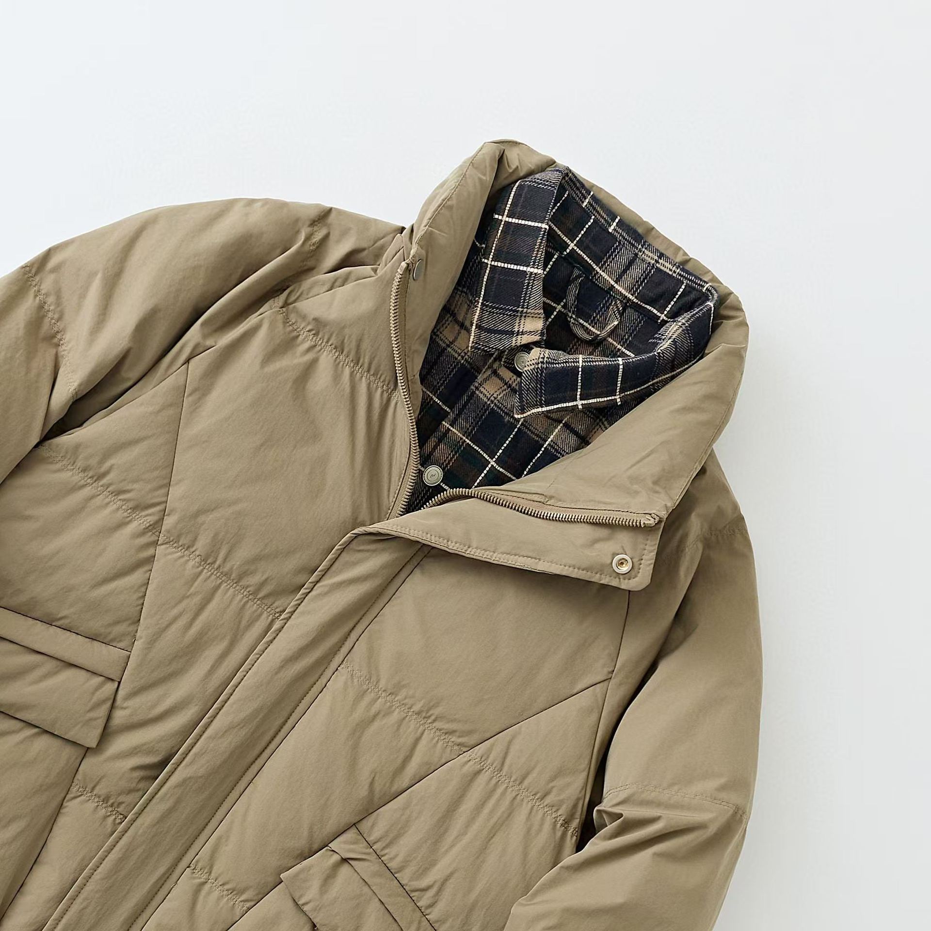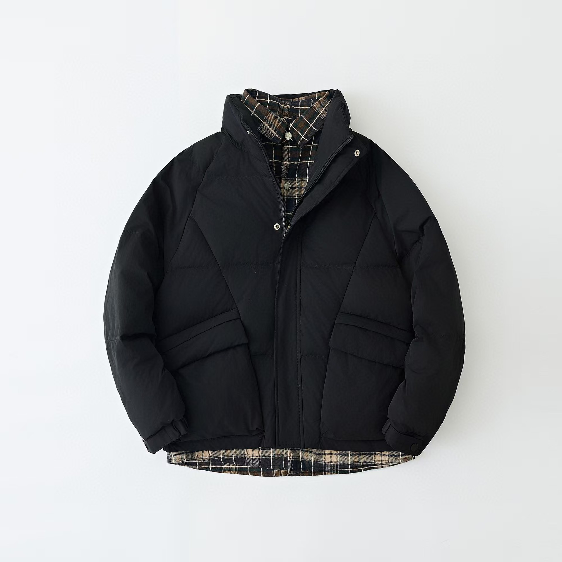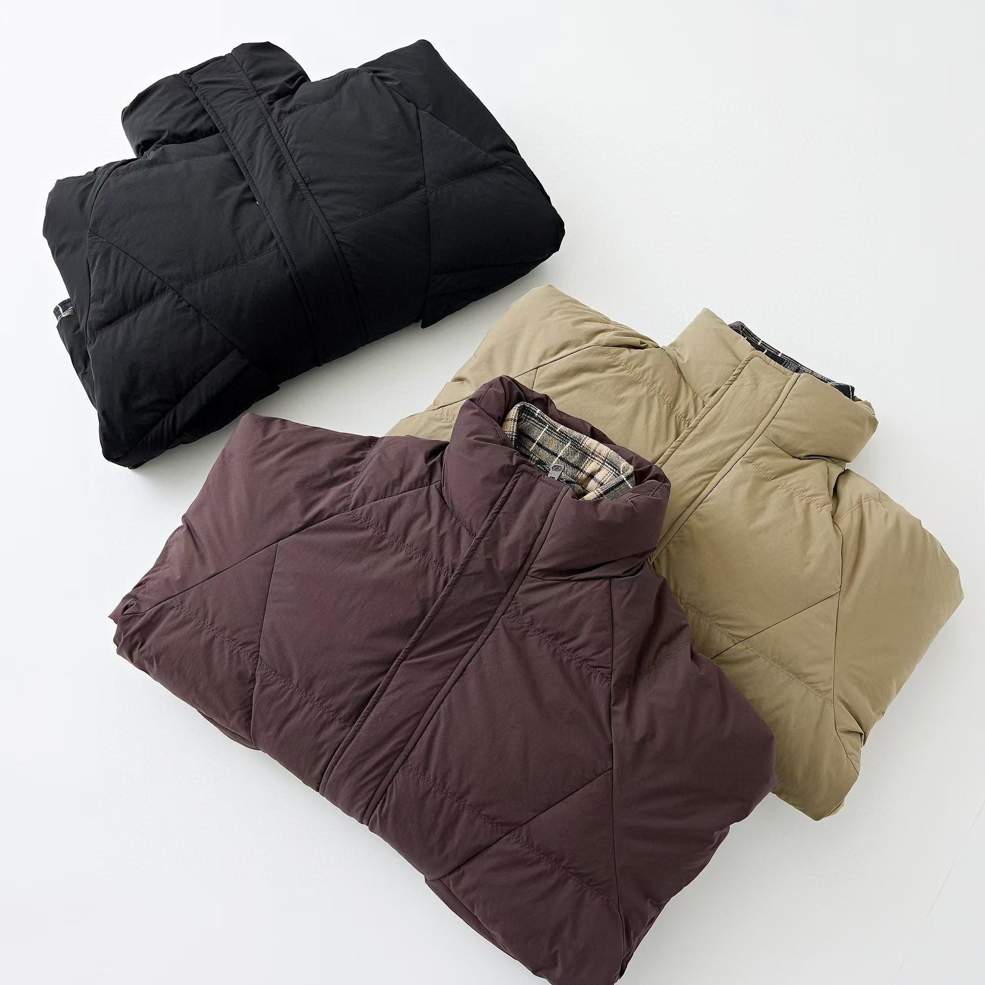 内里白鸭绒填充,篙蓬松度,上身防峰保暖,立领设计,领口和袖口按扣调节,