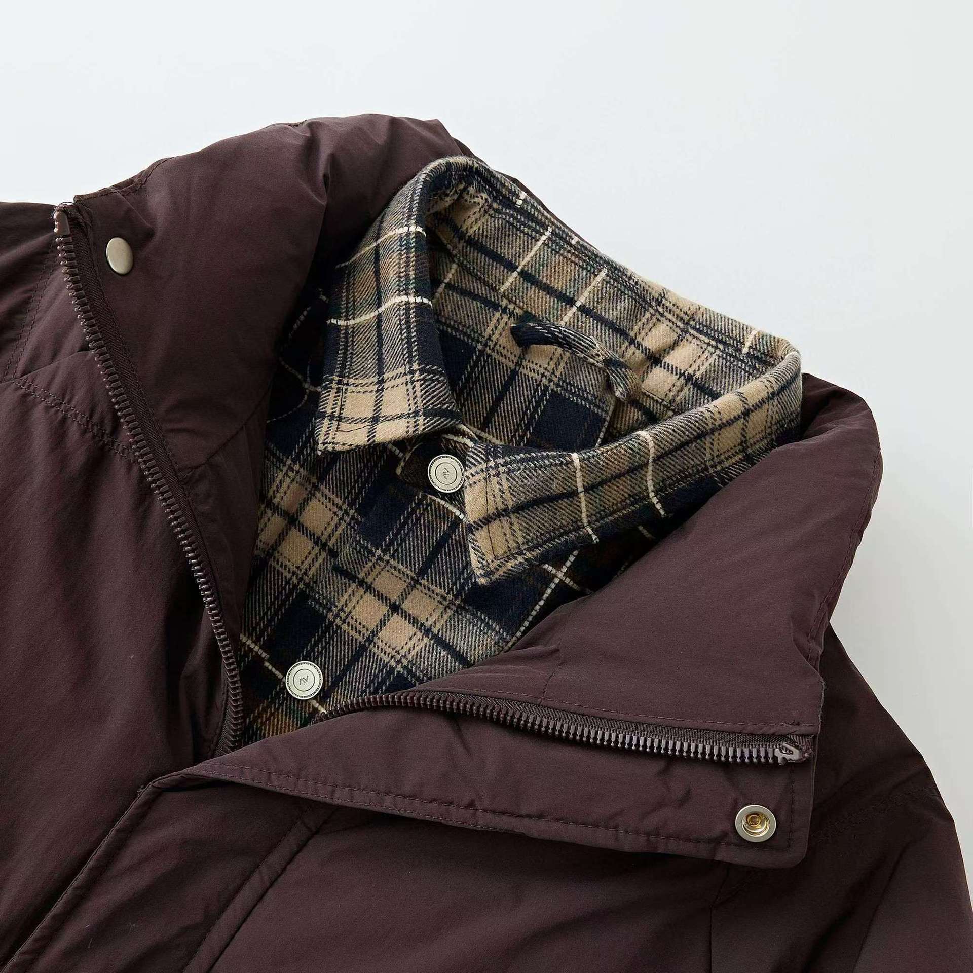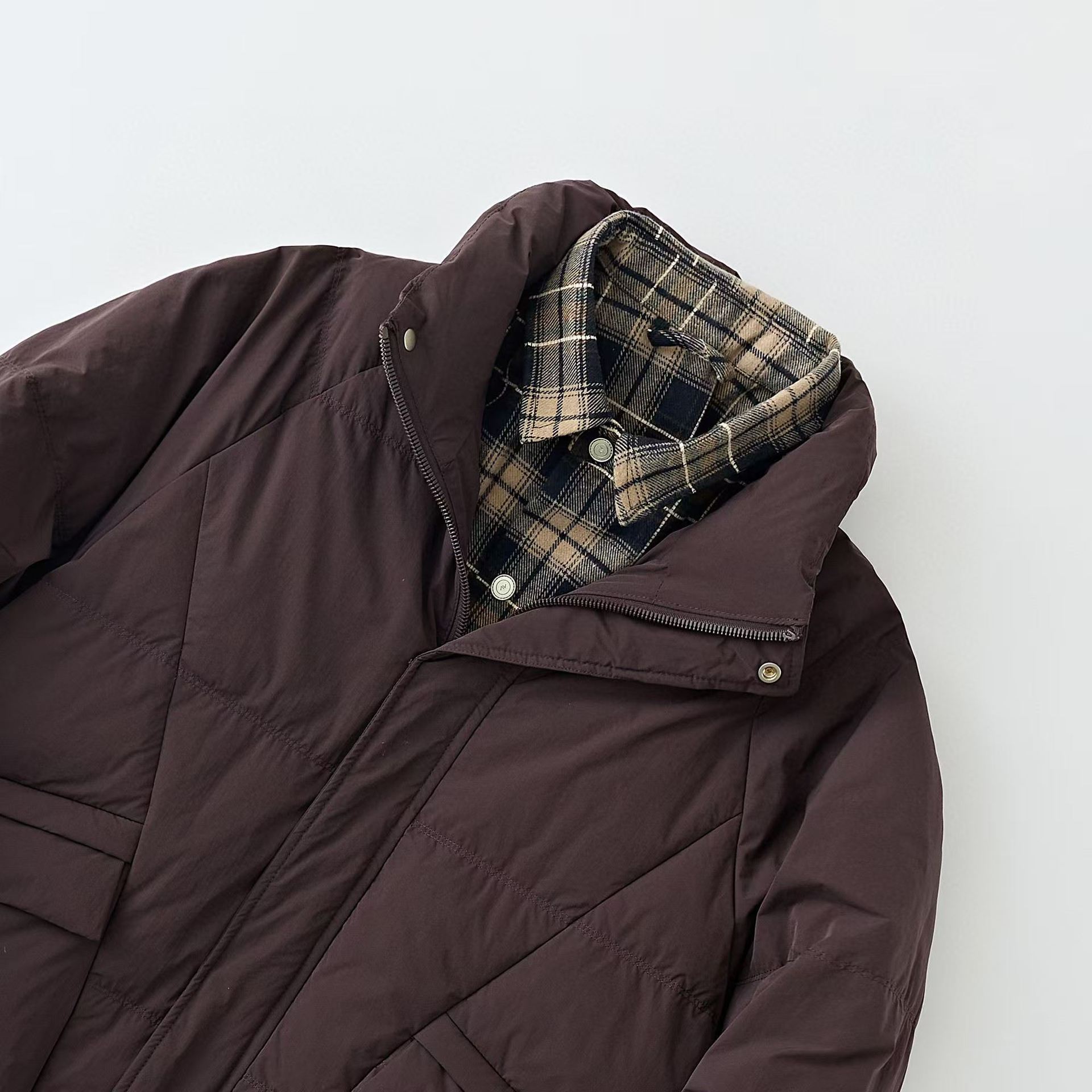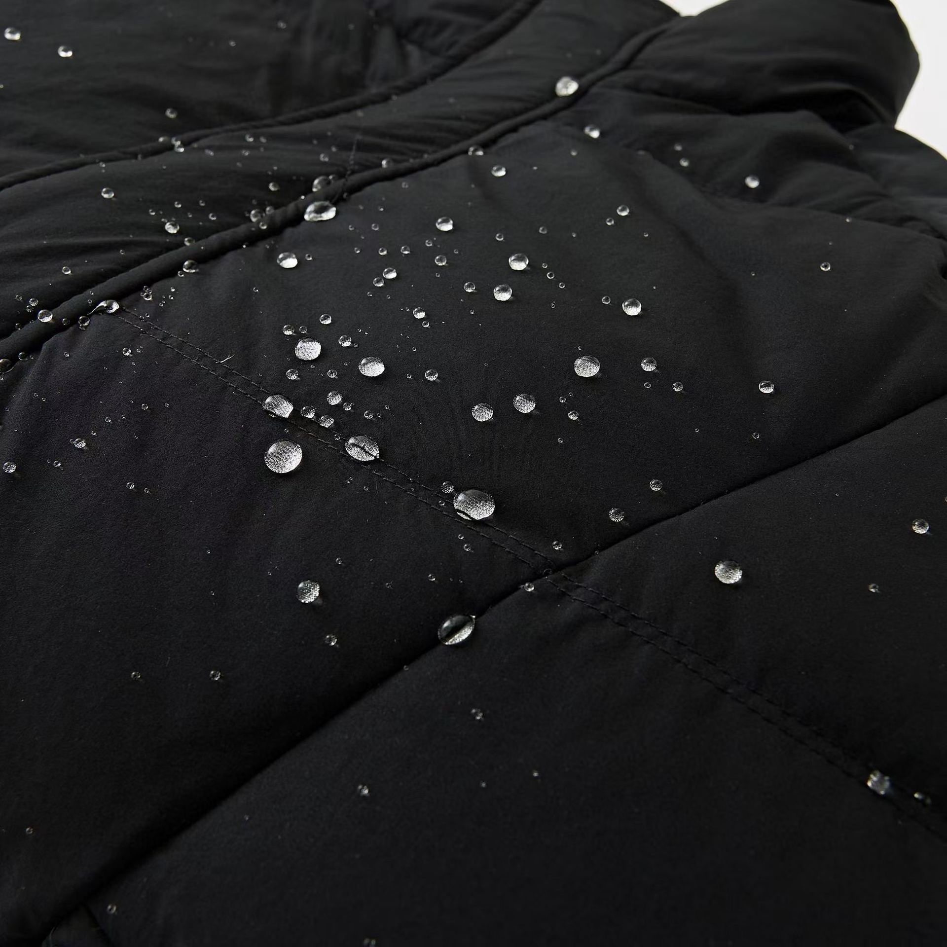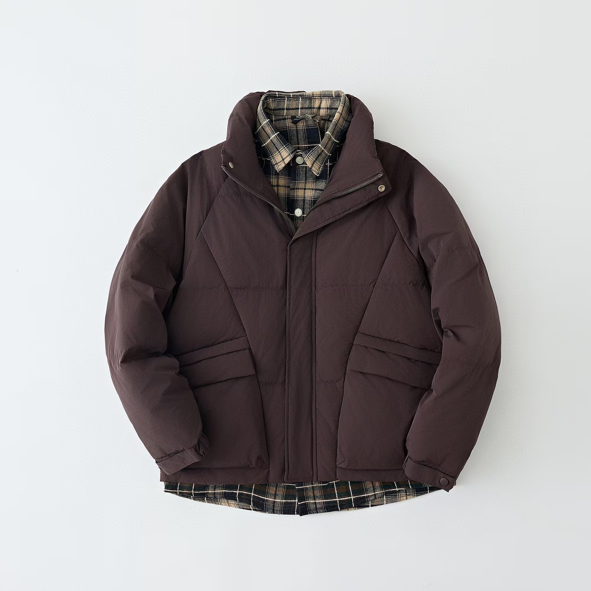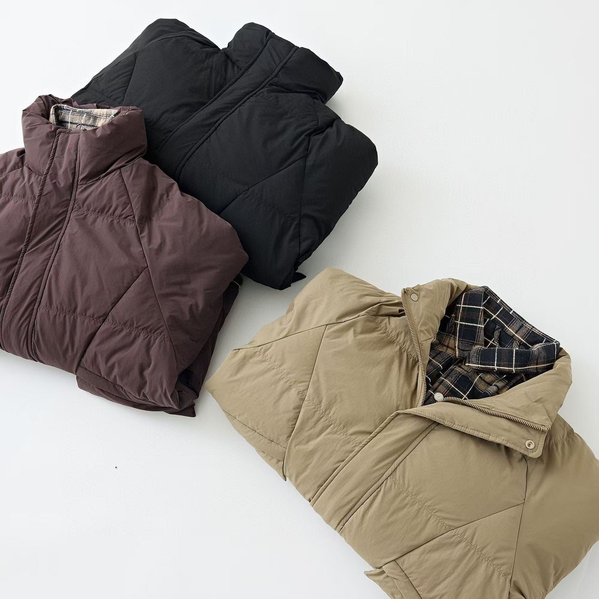 内里白鸭绒填充,篙蓬松度,上身防峰保暖,立领设计,领口和袖口按扣调节,