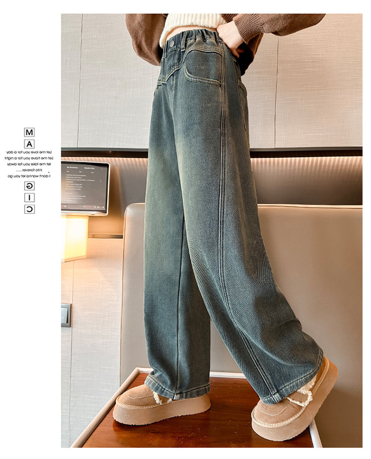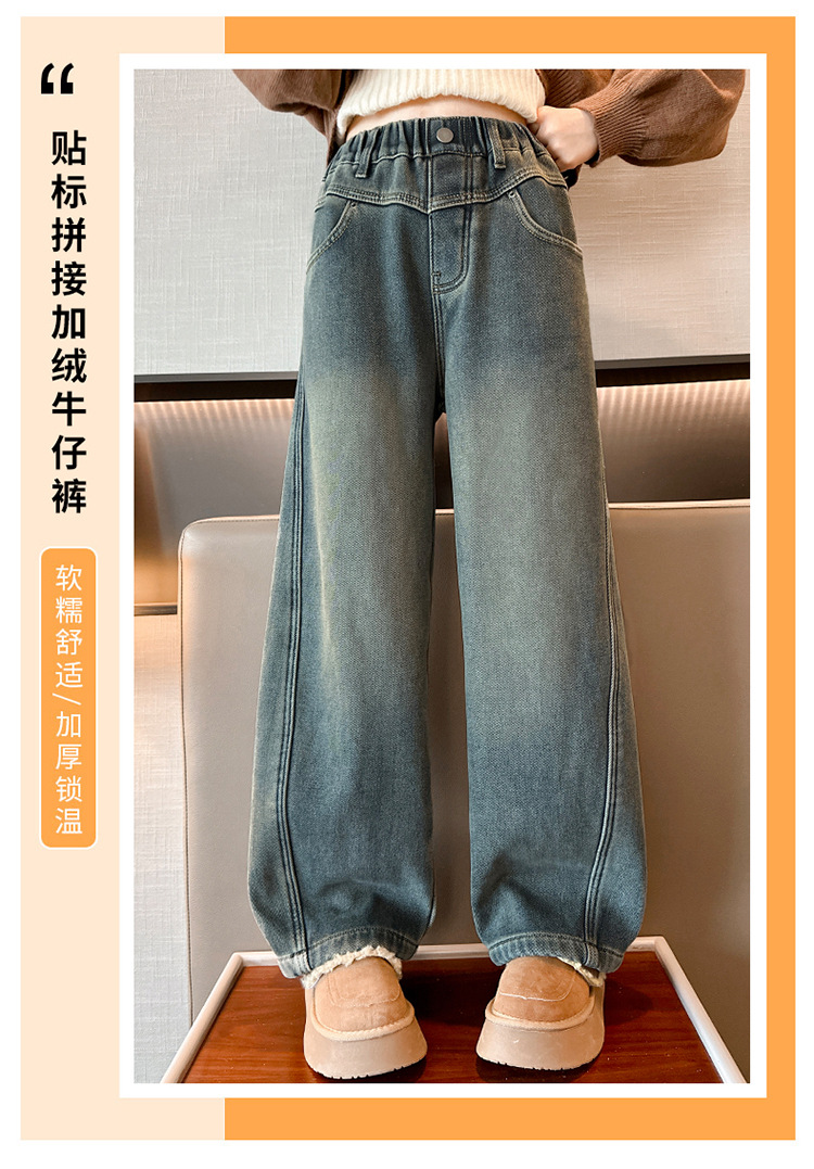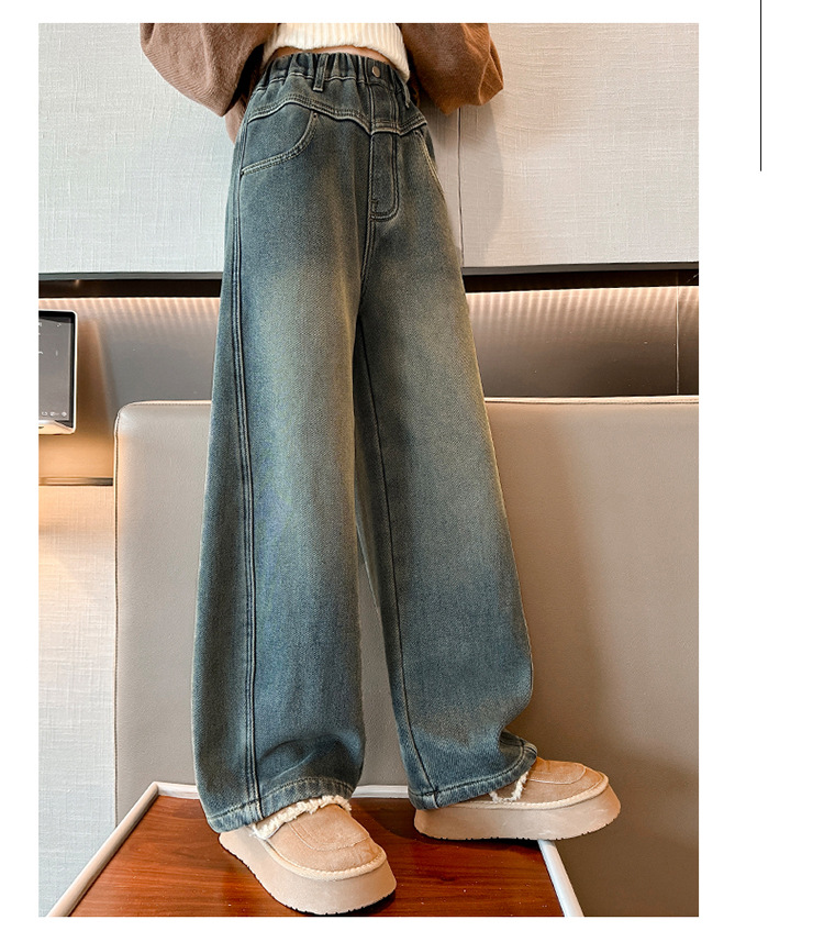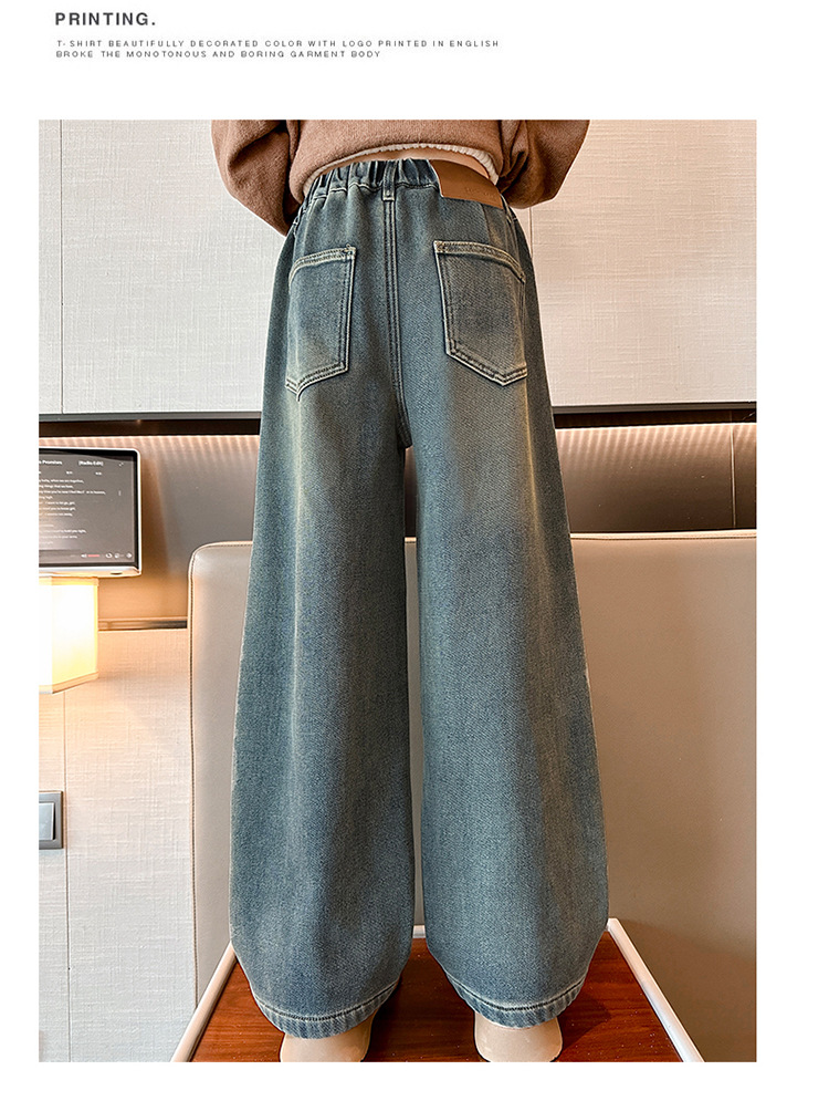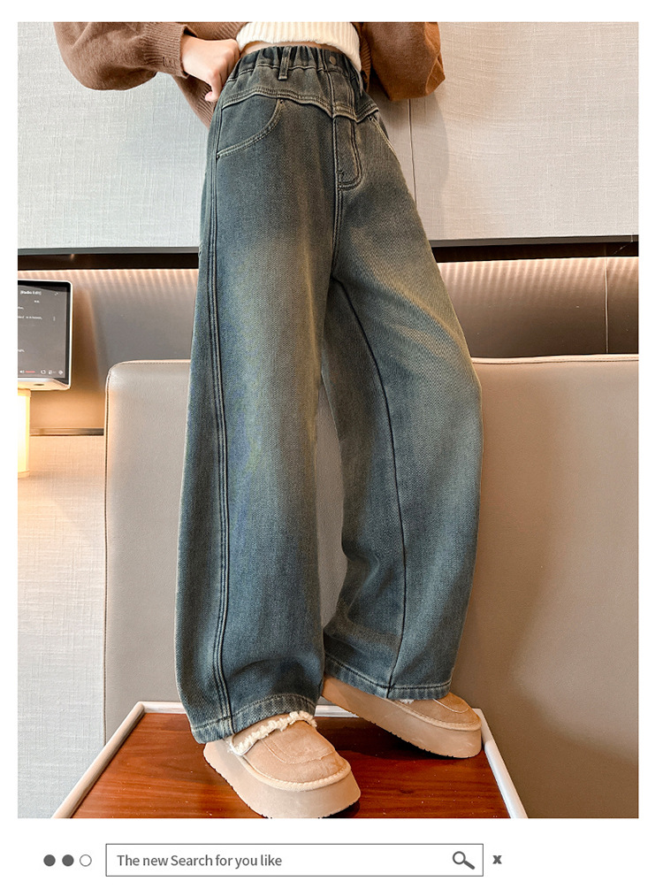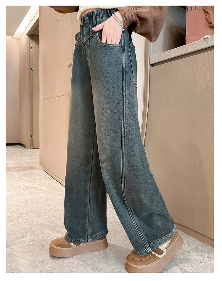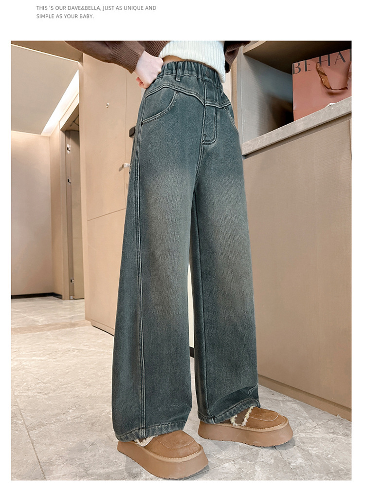 소녀의 겨울 기모 두꺼운 청바지 2024 중학교 어린이 캐주얼 느슨한 넓은 다리 바지 학생의 원피스 벨벳 바지스토어 가기