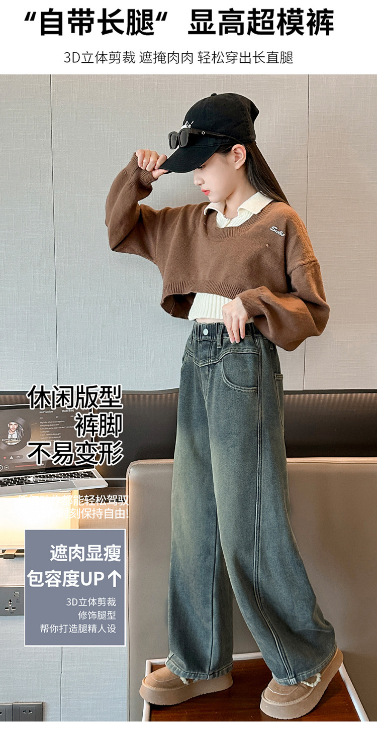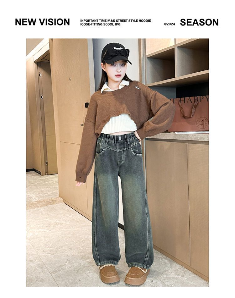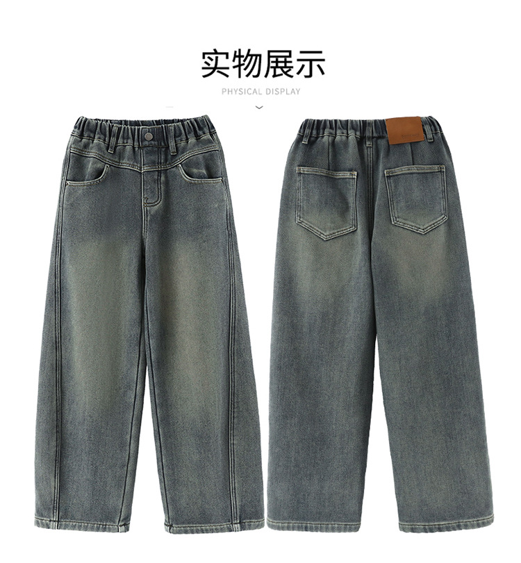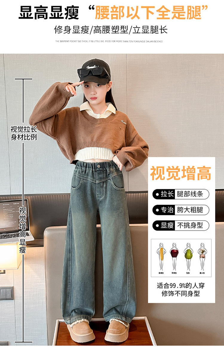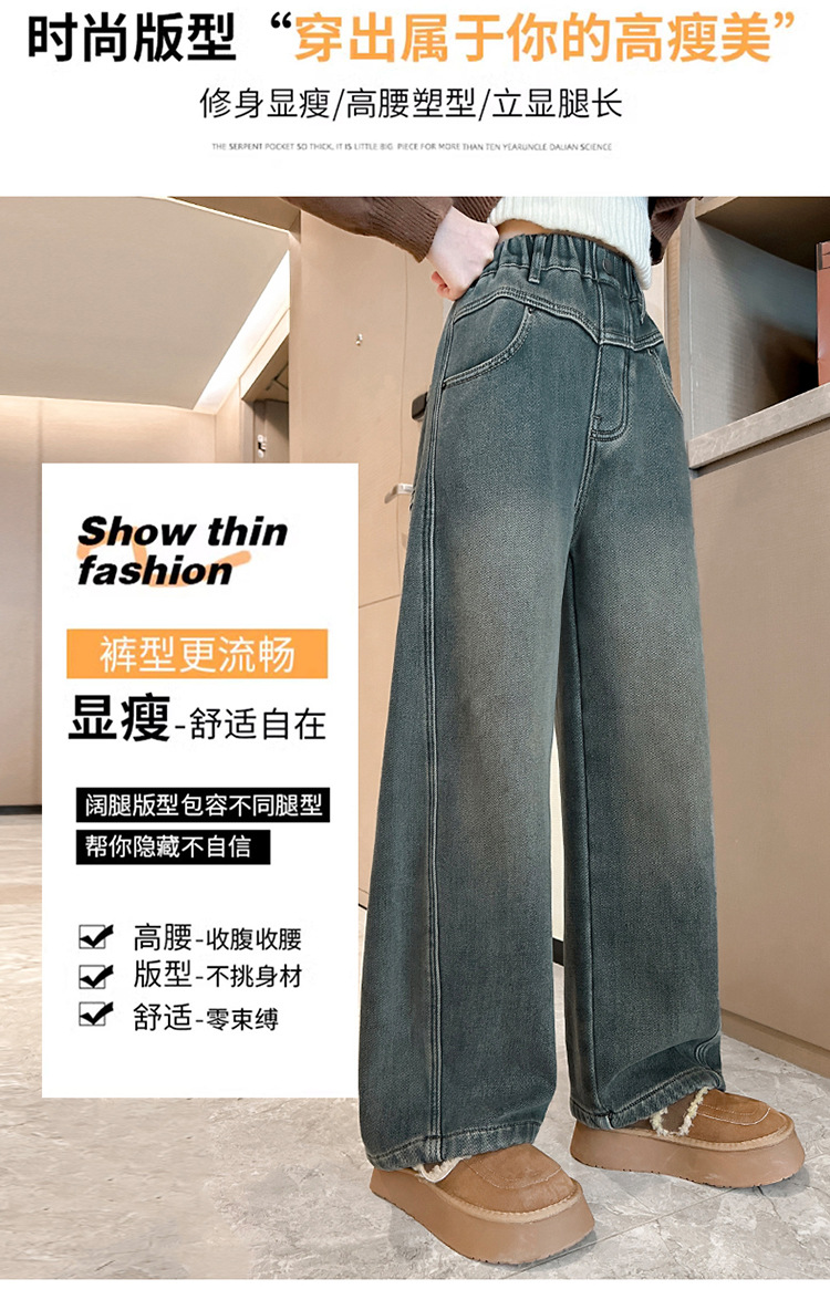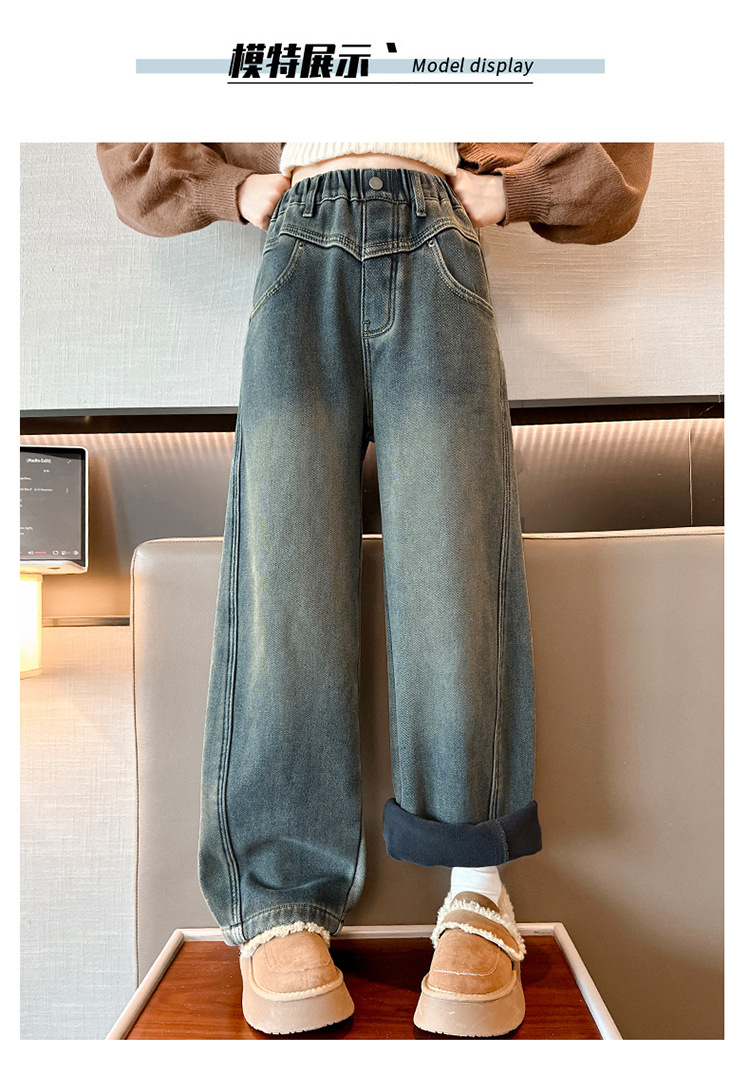 소녀의 겨울 기모 두꺼운 청바지 2024 중학교 어린이 캐주얼 느슨한 넓은 다리 바지 학생의 원피스 벨벳 바지스토어 가기