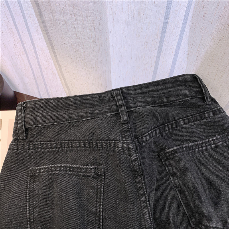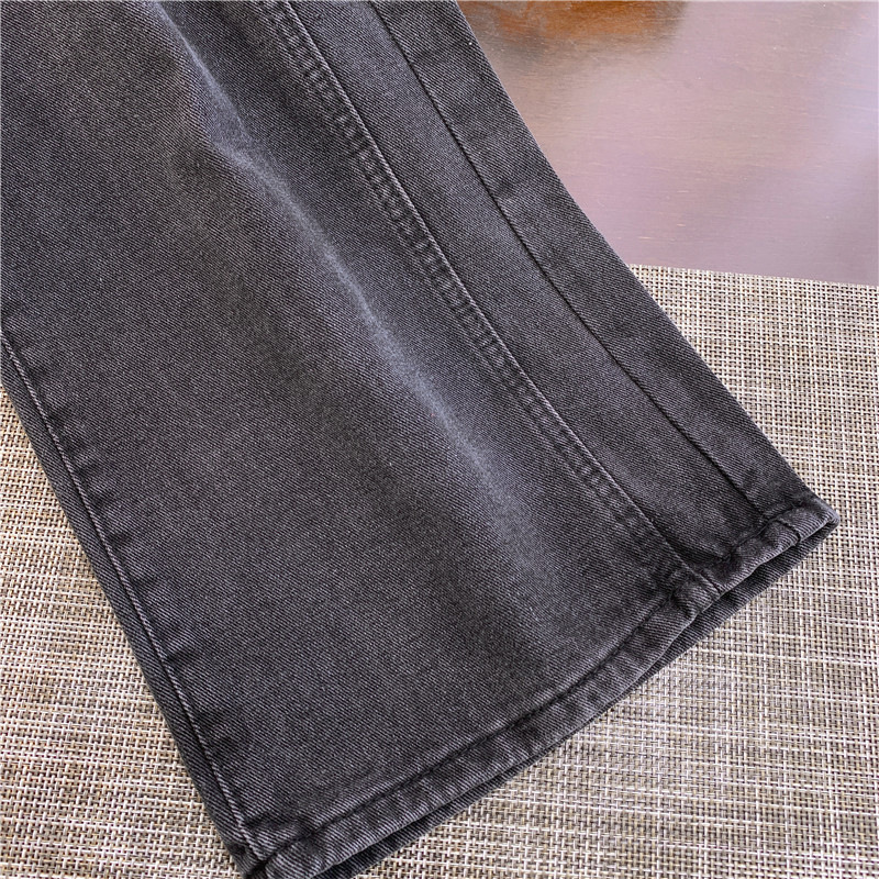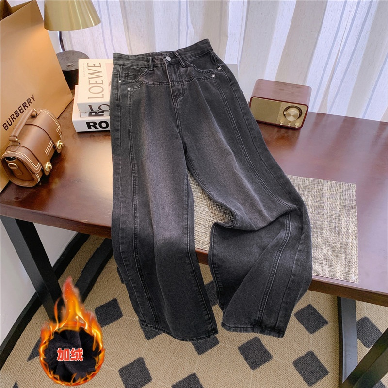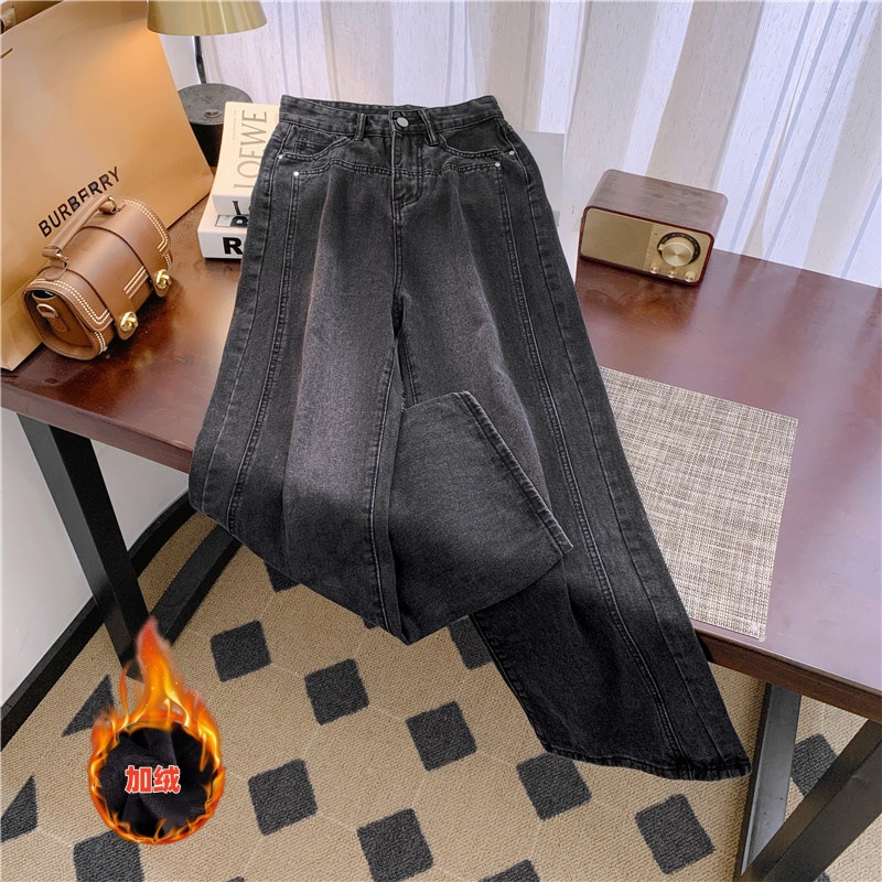 기모 배 모양의 넓은 다리 바지 가을 및 겨울 새로운 블랙 높은 허리 스트레이트 독특한 스티칭 올 매치 청바지 여성스토어 가기