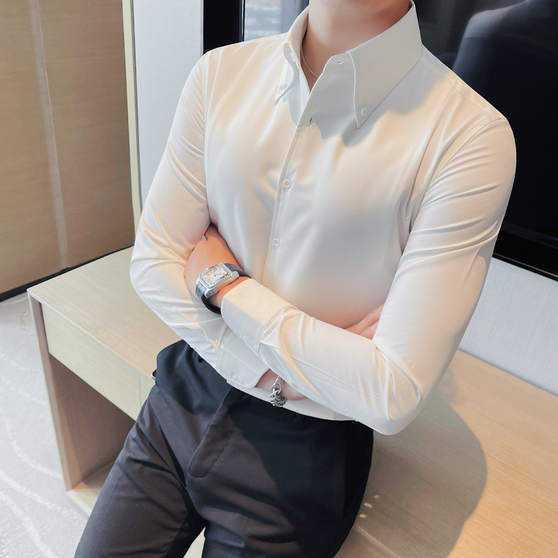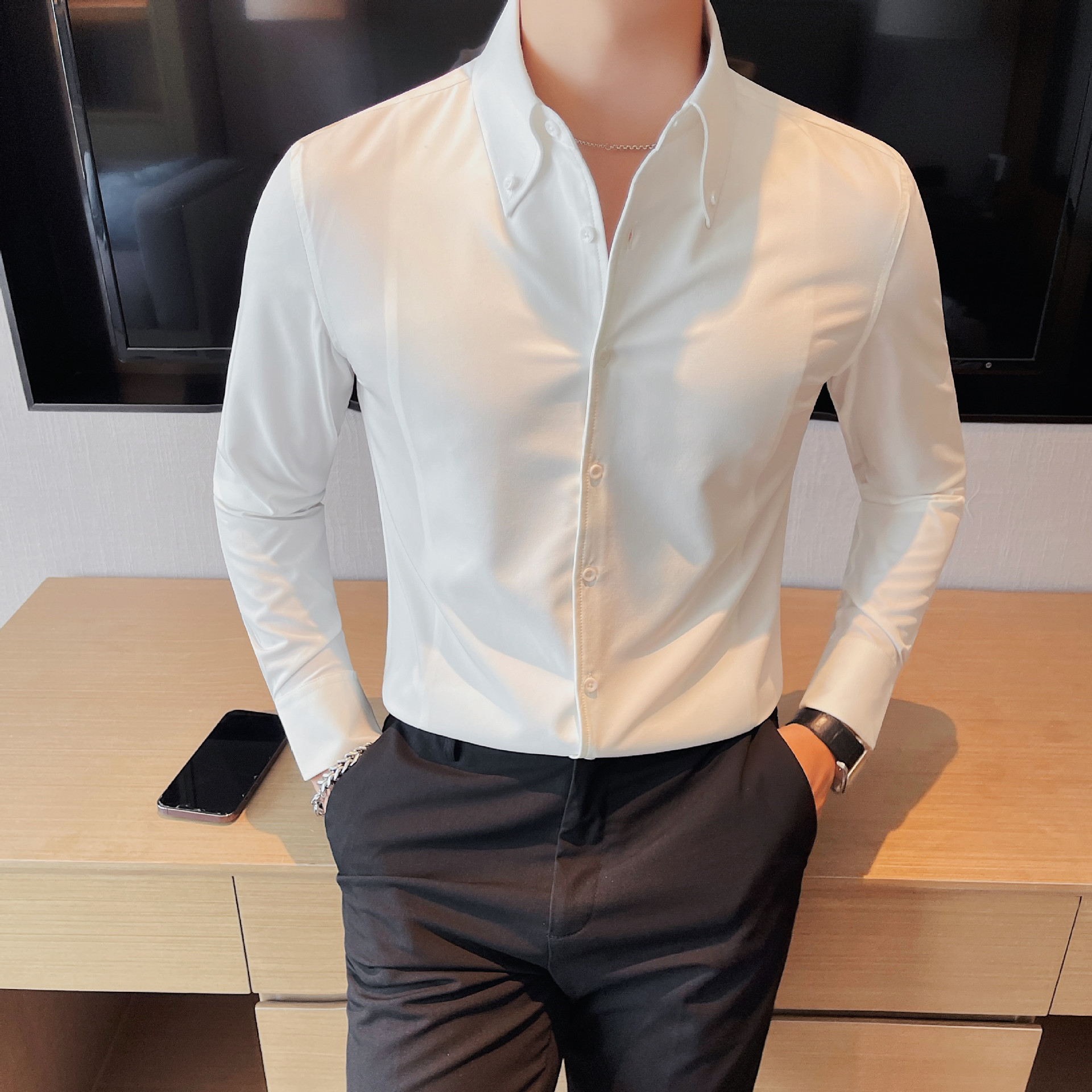 기모 따뜻한 프랑스 스타일 대형 포인트 칼라 긴팔 셔츠 슬림핏 솔리드 컬러 겨울 두꺼운 남성베이스 원피스 셔츠스토어 가기