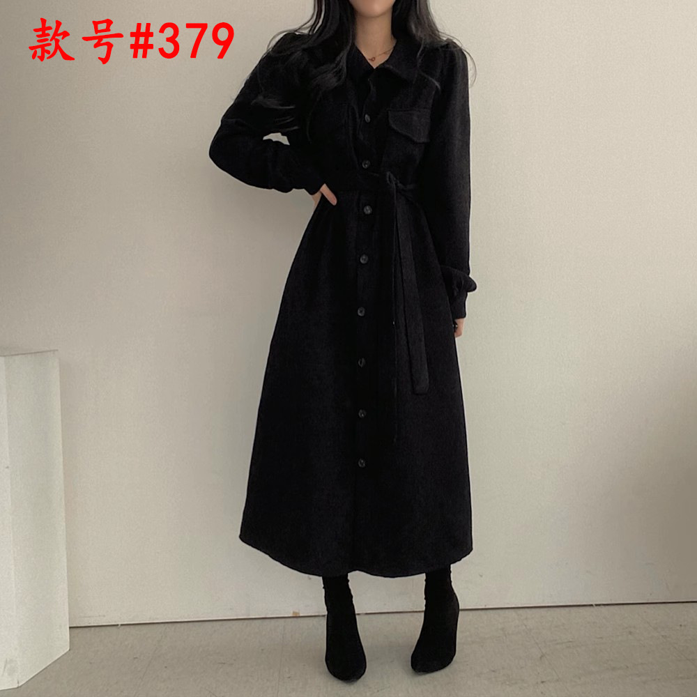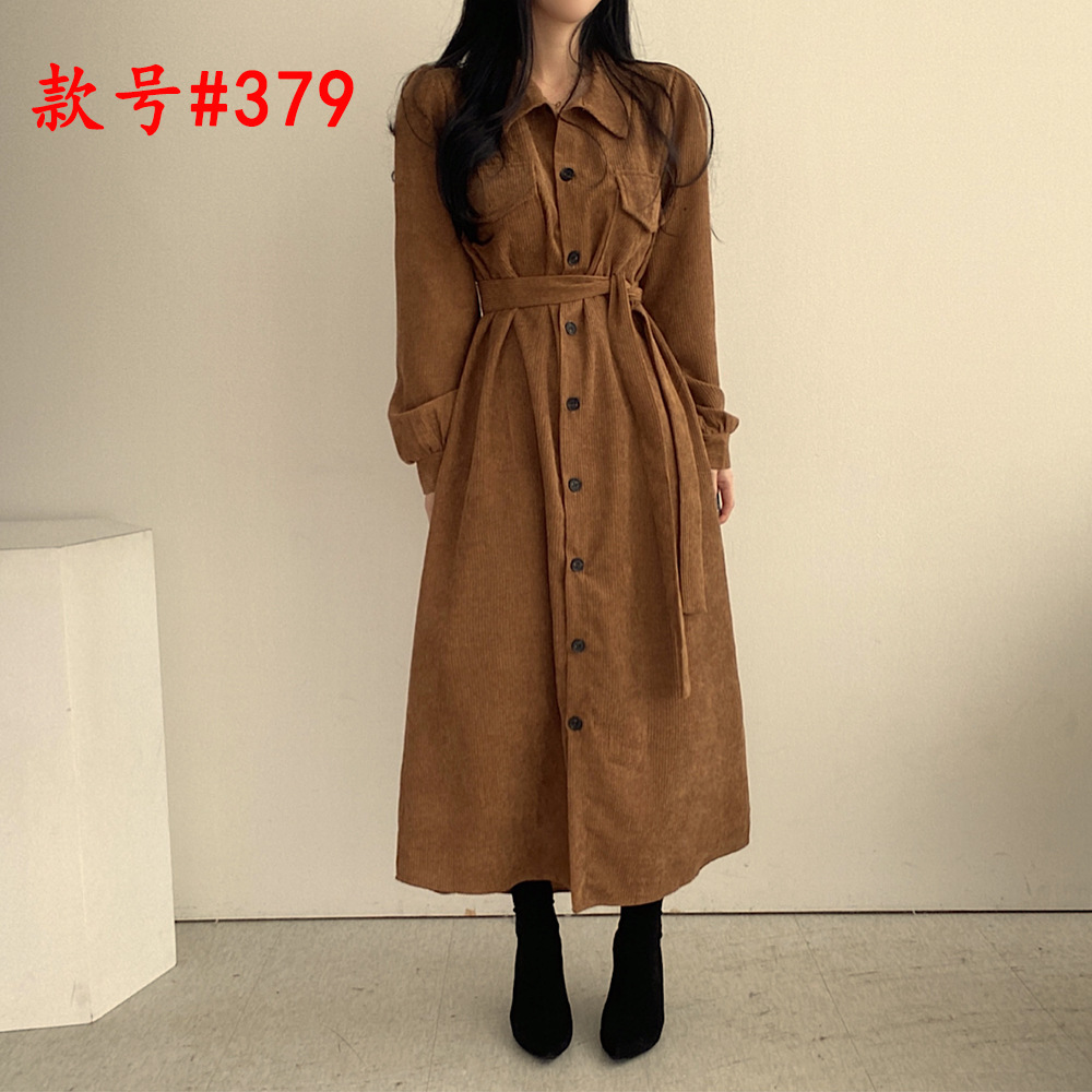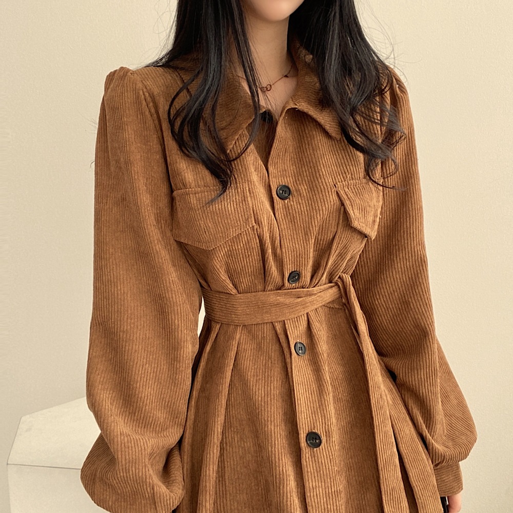 한국 스타일 세련된 가을과 겨울 프랑스 스타일 빈티지 옷깃 싱글 브레스트 버클 테이프 허리 긴 솔리드 컬러 코듀로이 원피스 여성