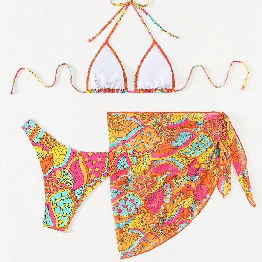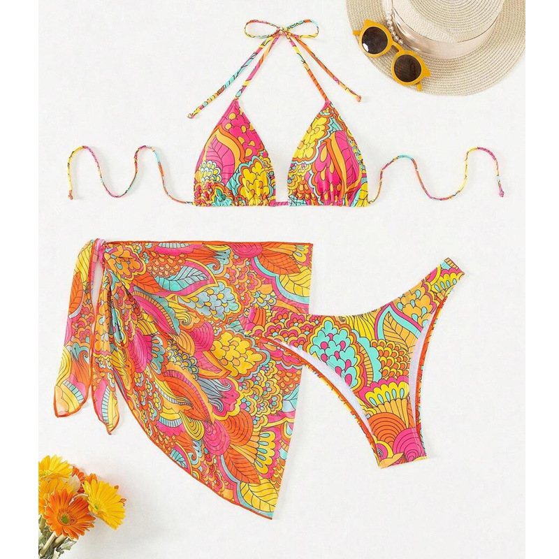 유럽과 미국 국경 인쇄 비키니 3 피스 레이스 업 수영복 여성 섹시한 백리스 바이킨 휴가 나는 수영복 도매