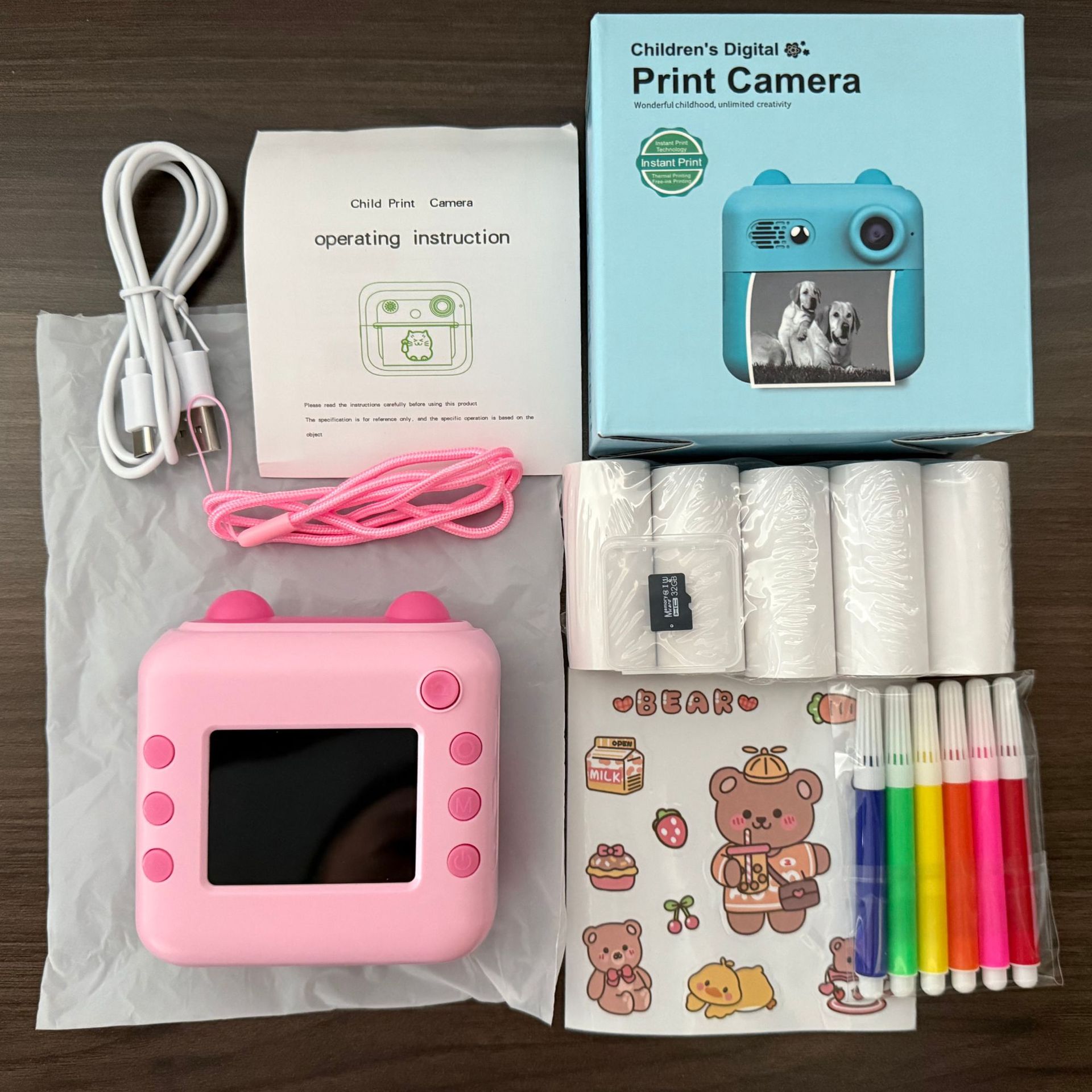 • 핑크 + 32G 메모리 카드 + 인화지 5롤 + 컬러풀한 펜 스티커