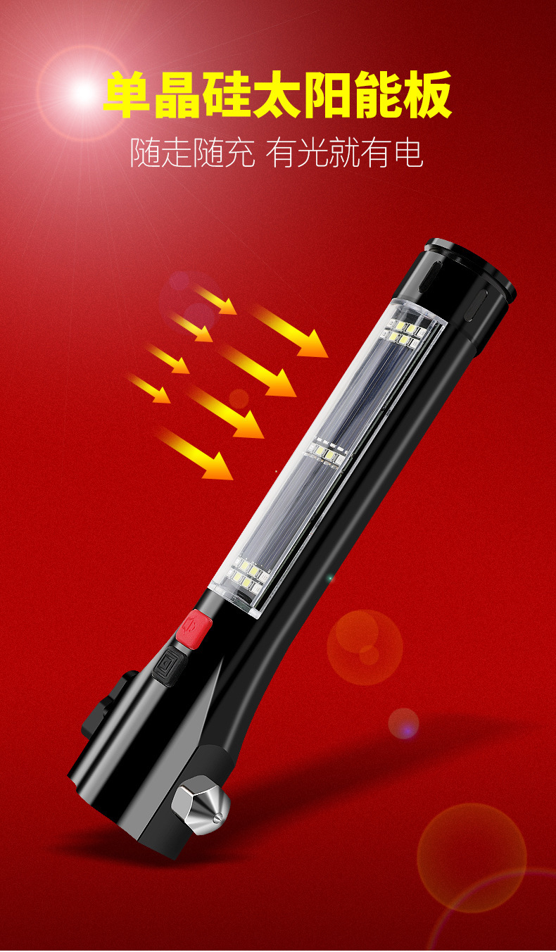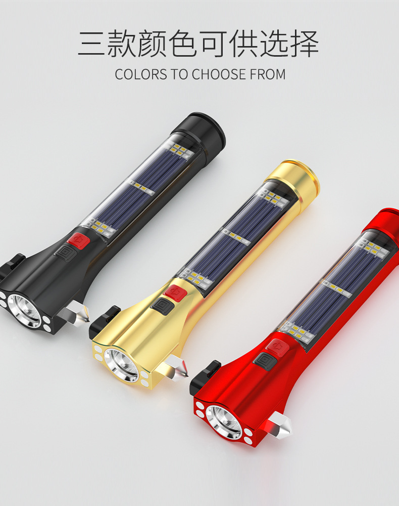 야외 자기 방어 다기능 차량 안전 망치 태양 충전 화재 비상 경보 작업 강한 손전등스토어 가기