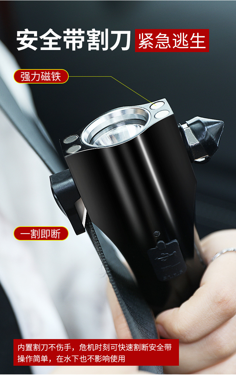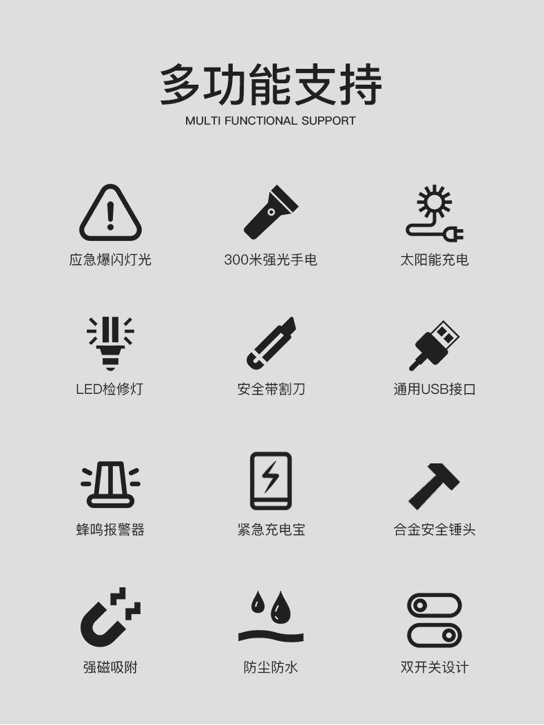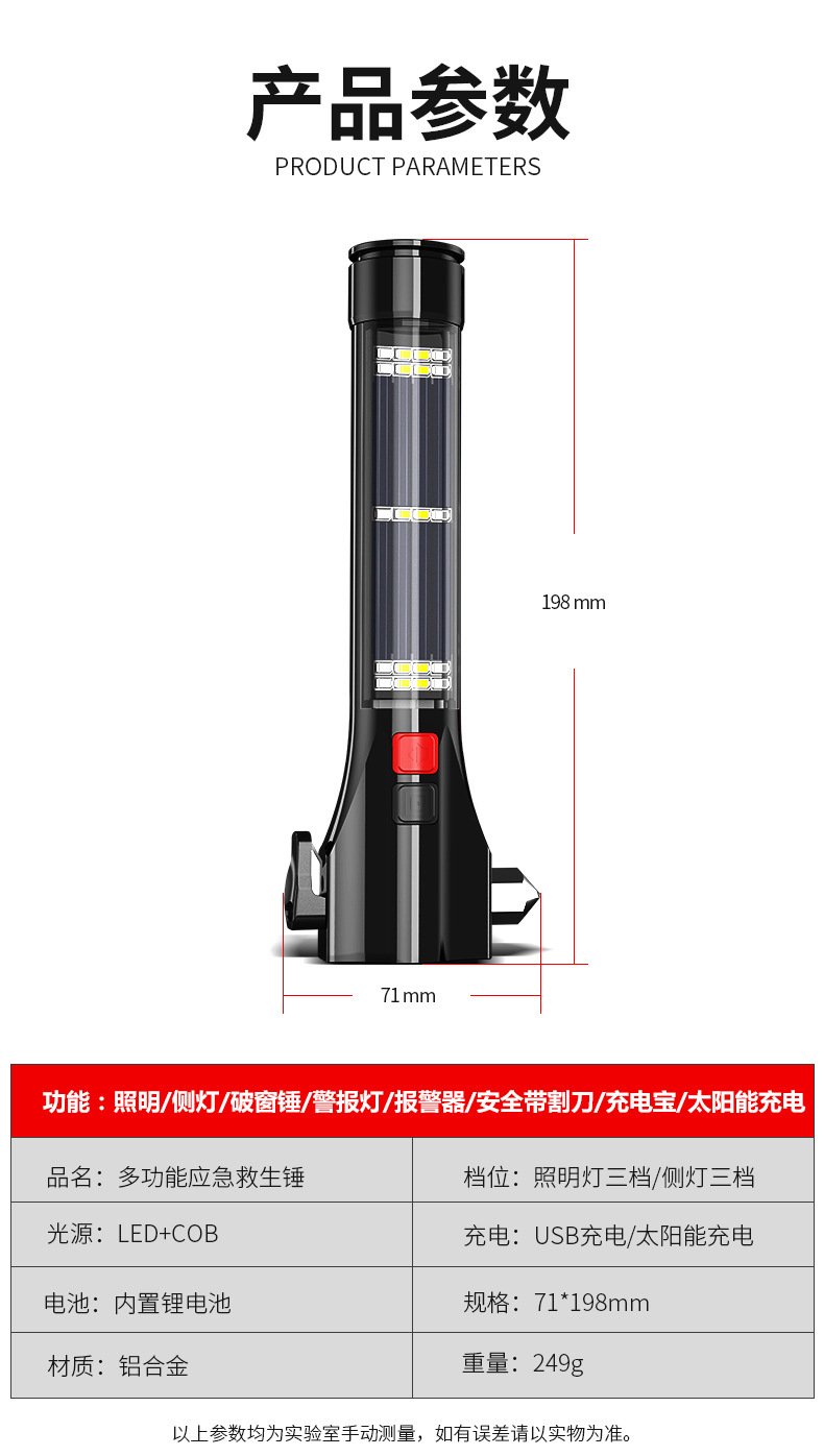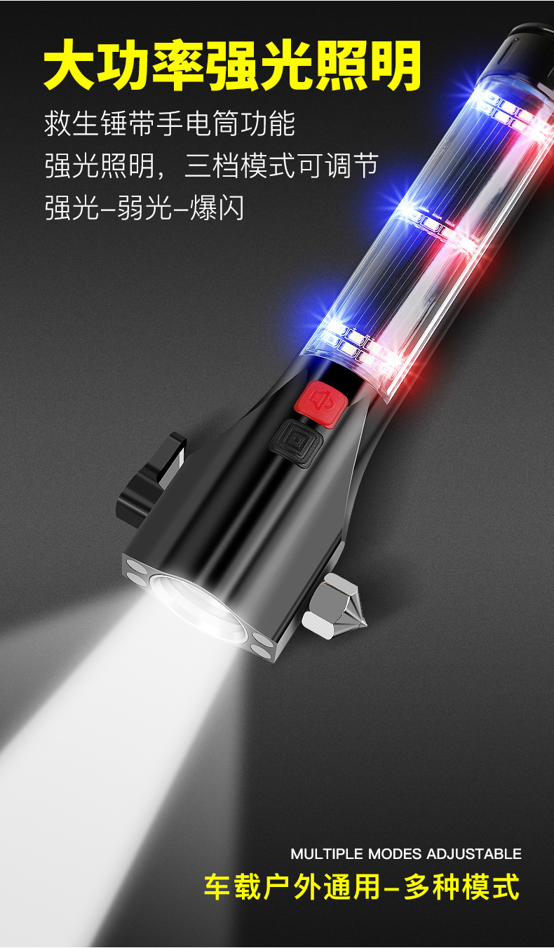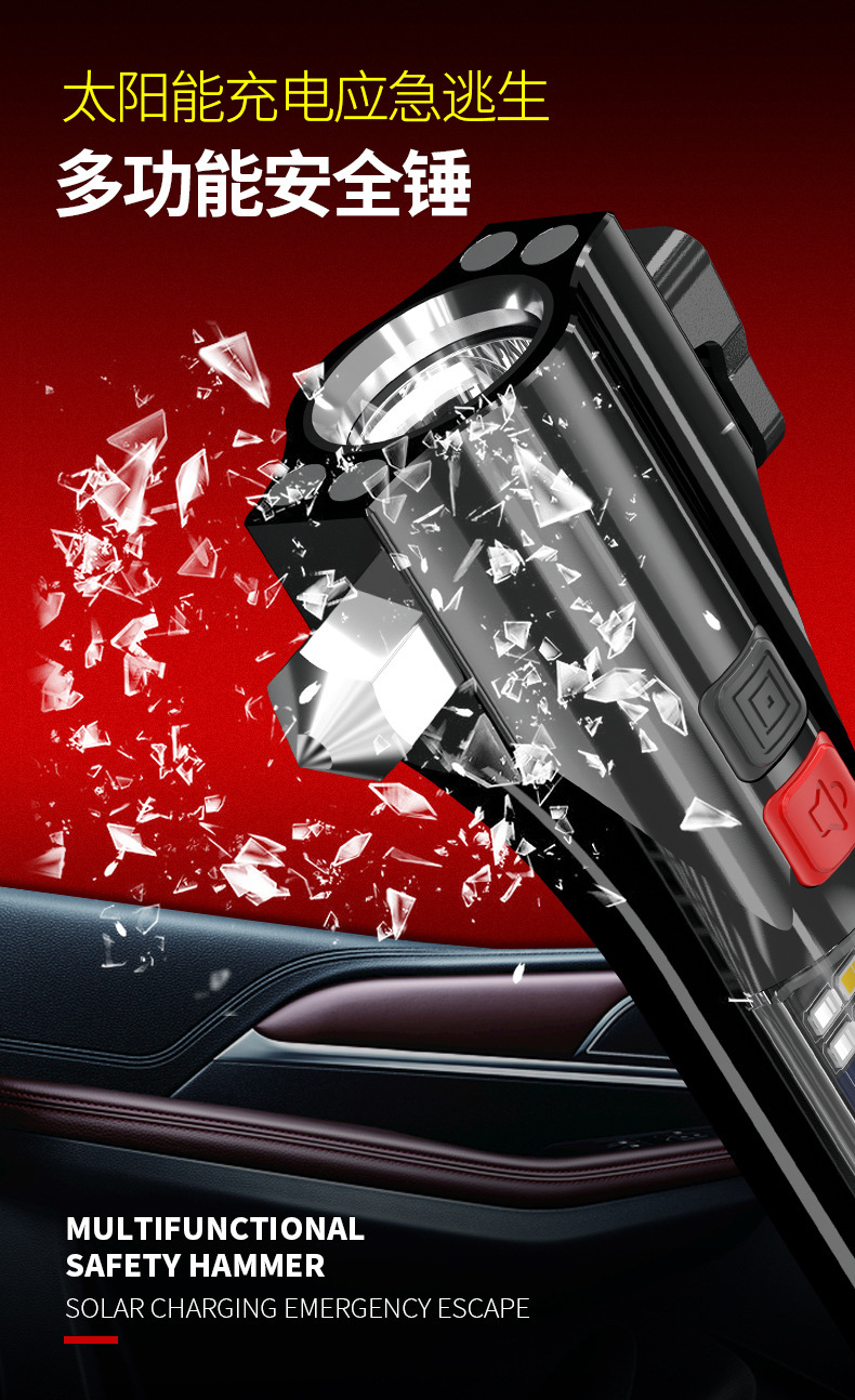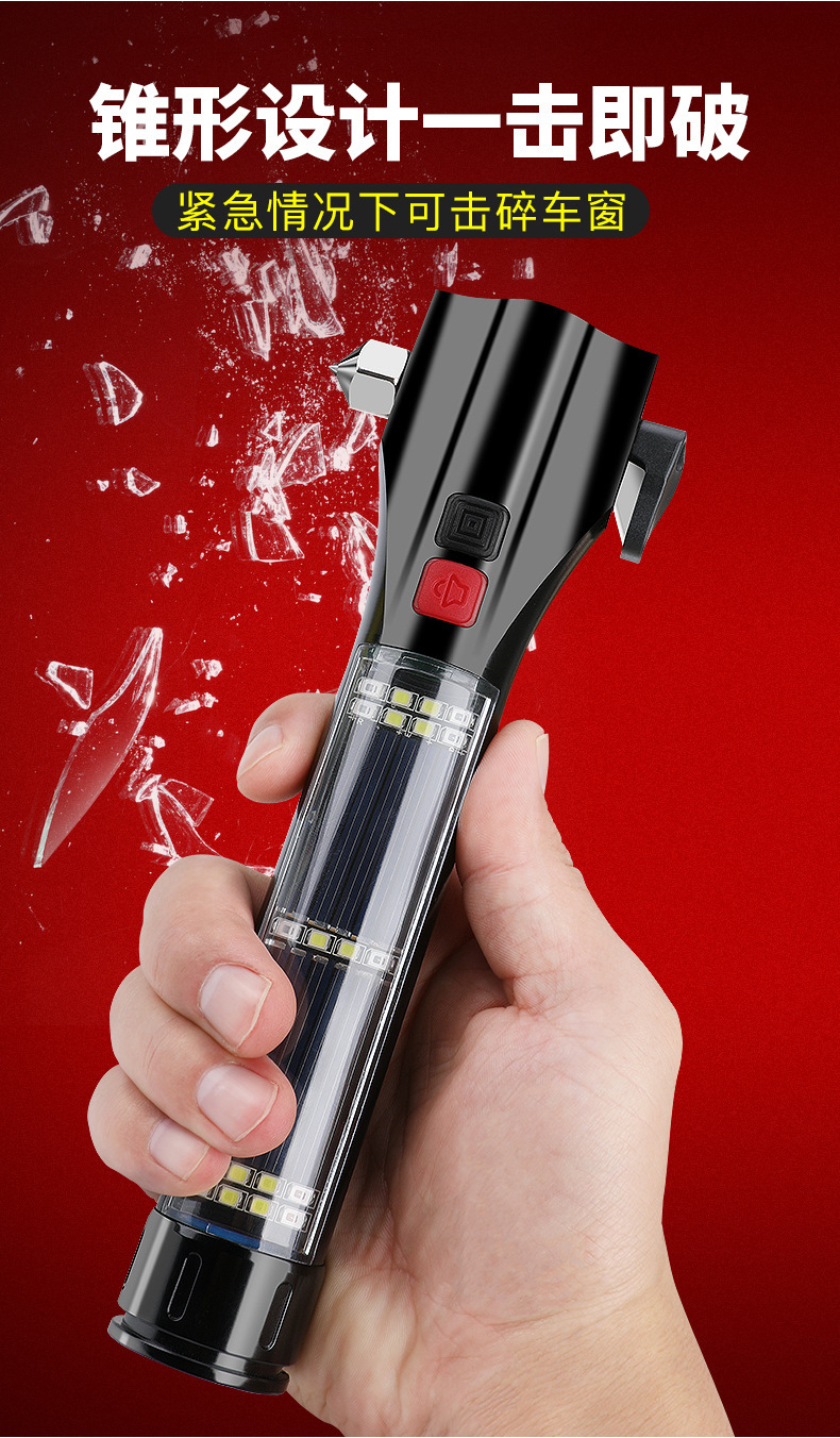 야외 자기 방어 다기능 차량 안전 망치 태양 충전 화재 비상 경보 작업 강한 손전등