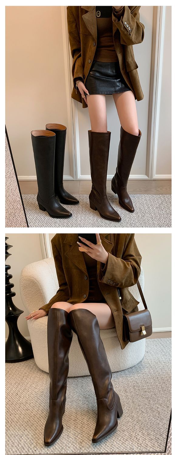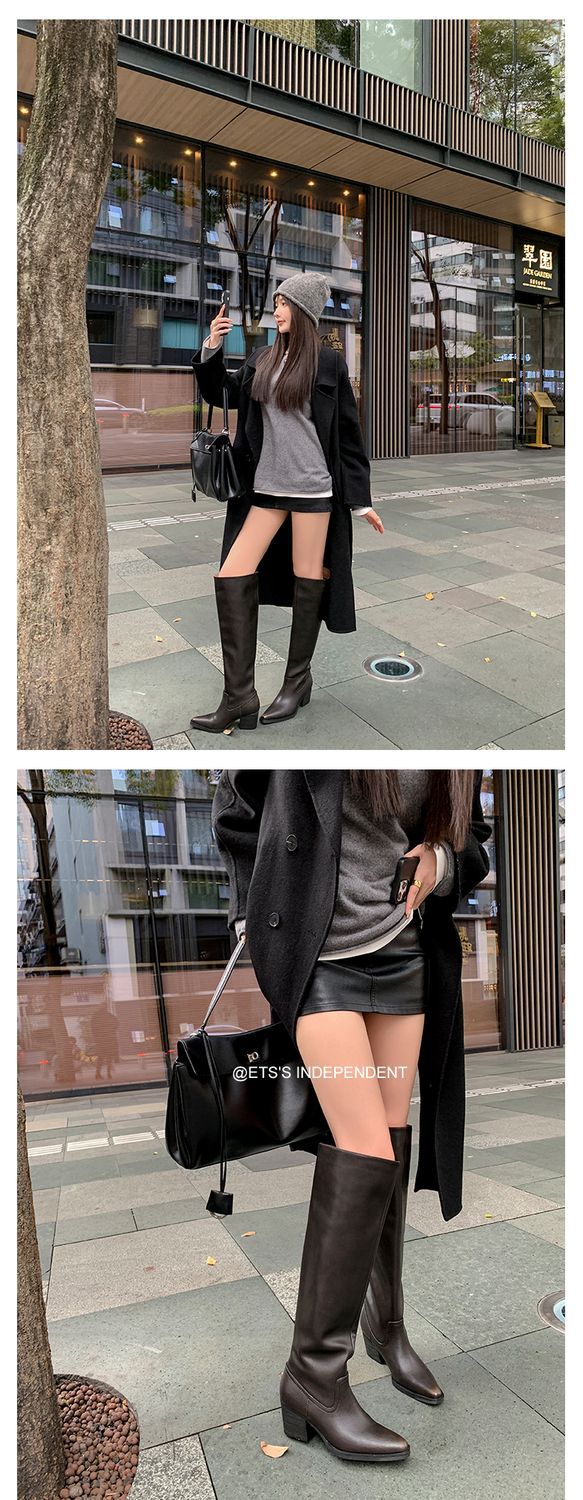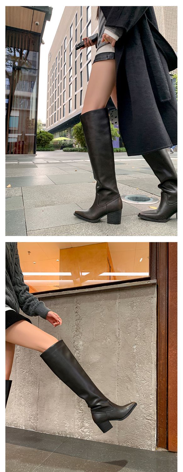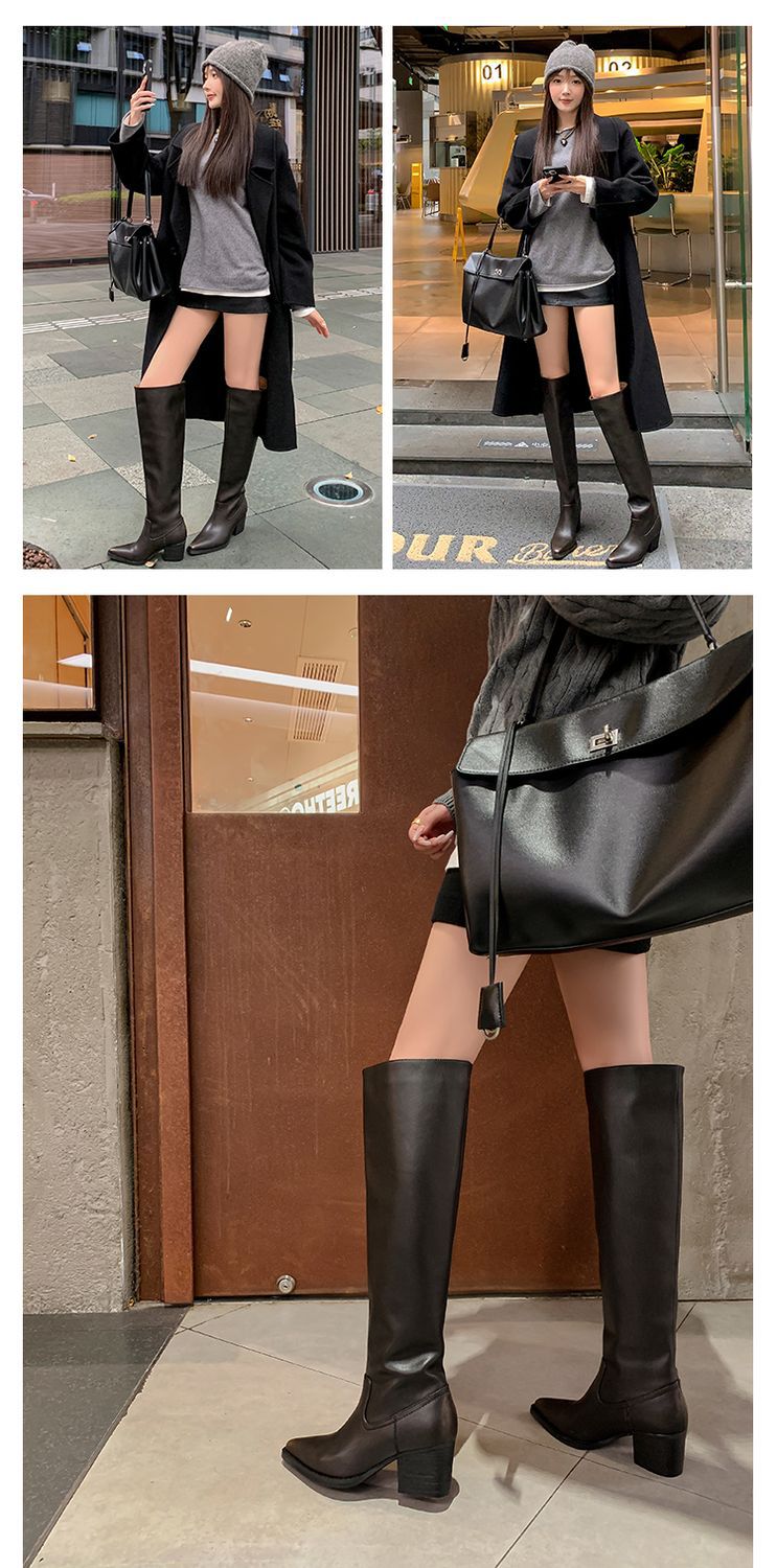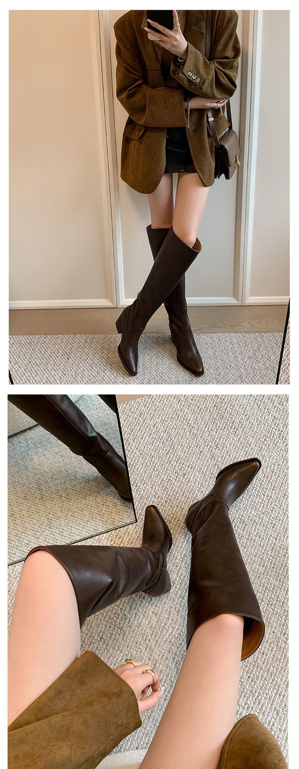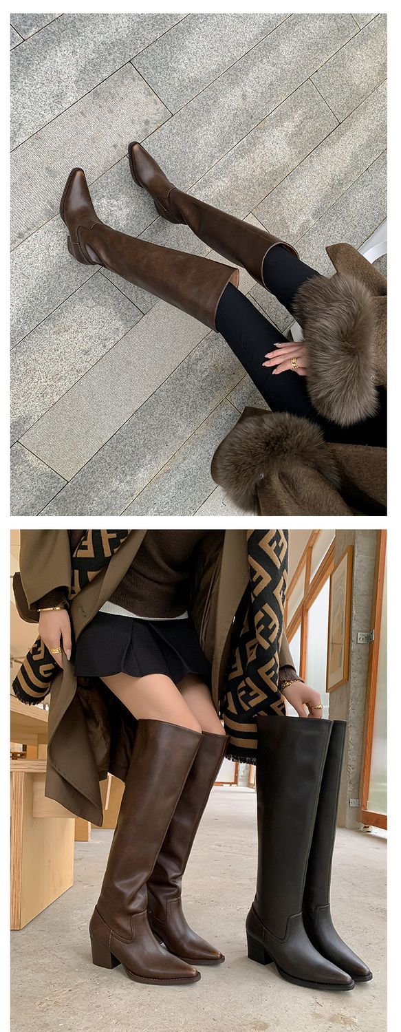 2024 포인트 6cm 두꺼운 힐 높은 부츠 여성 가을 및 겨울 무릎 높이 스트레이트 느슨한 가죽 부츠 작은 기사 부츠스토어 가기