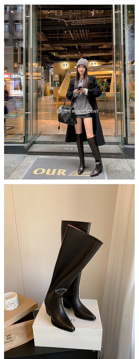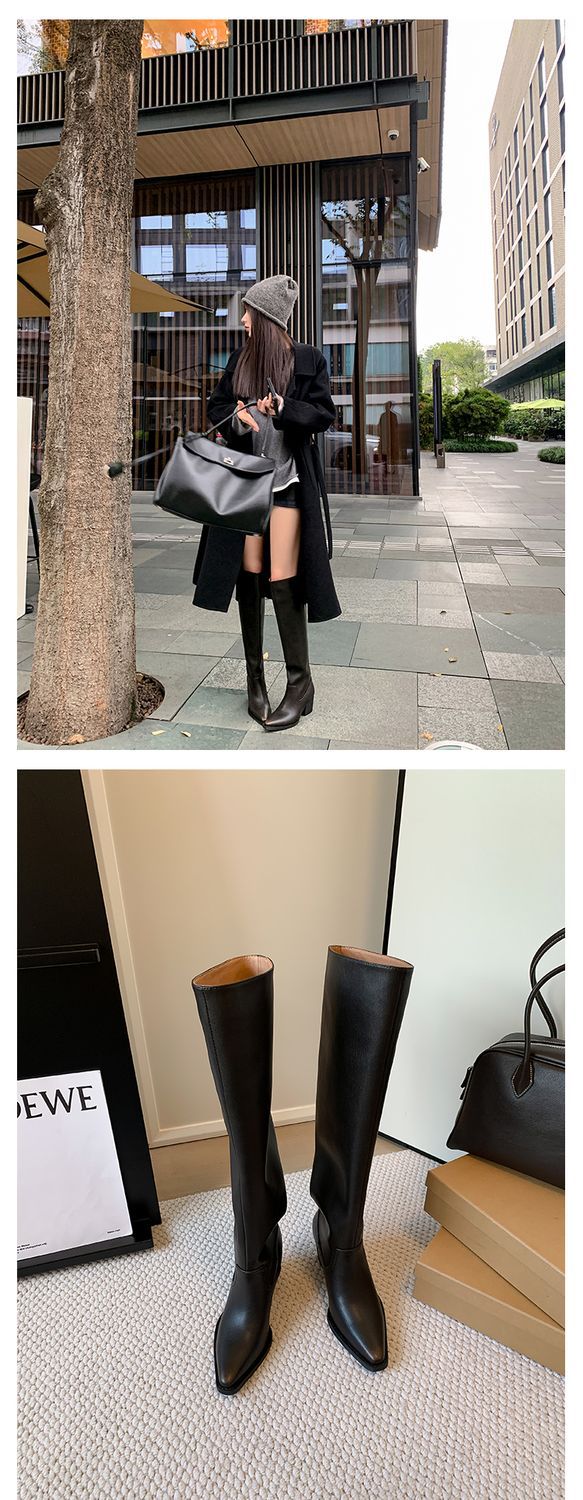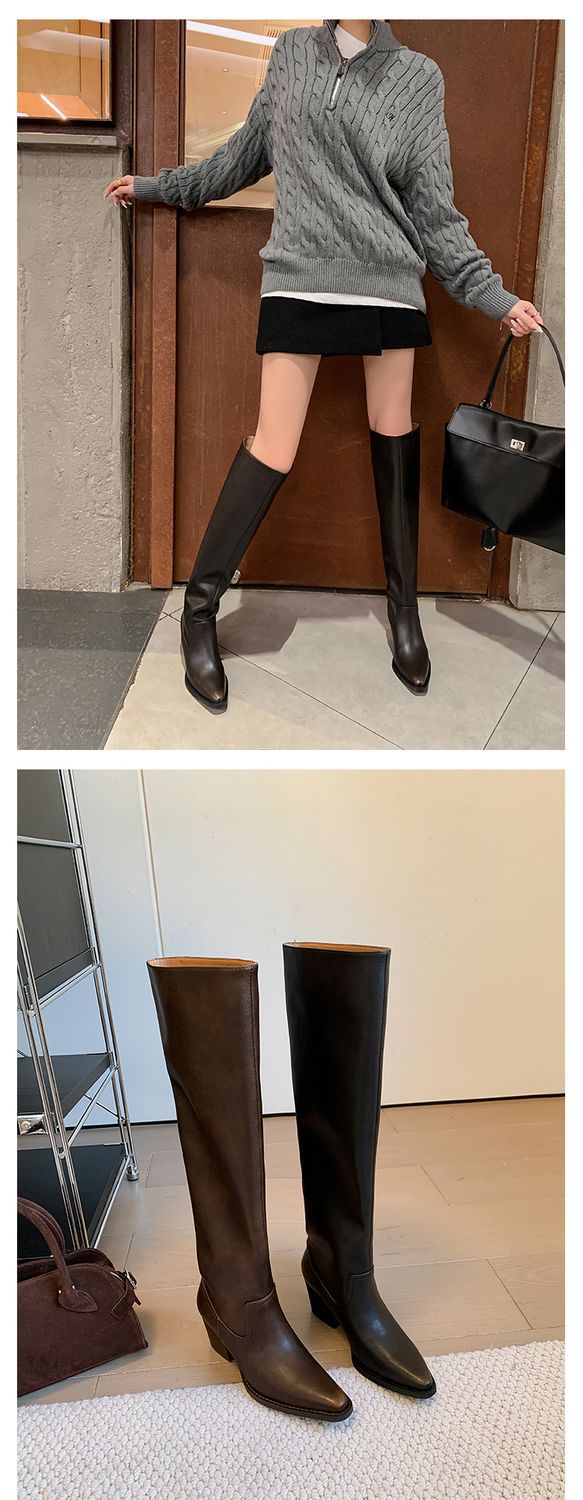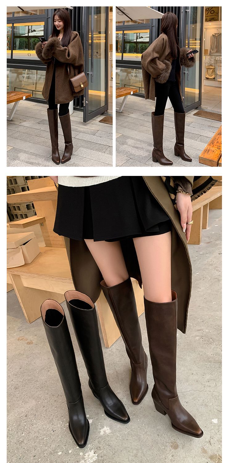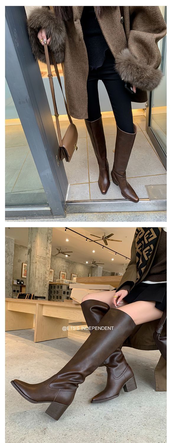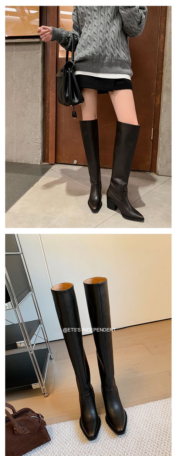 2024 포인트 6cm 두꺼운 힐 높은 부츠 여성 가을 및 겨울 무릎 높이 스트레이트 느슨한 가죽 부츠 작은 기사 부츠스토어 가기