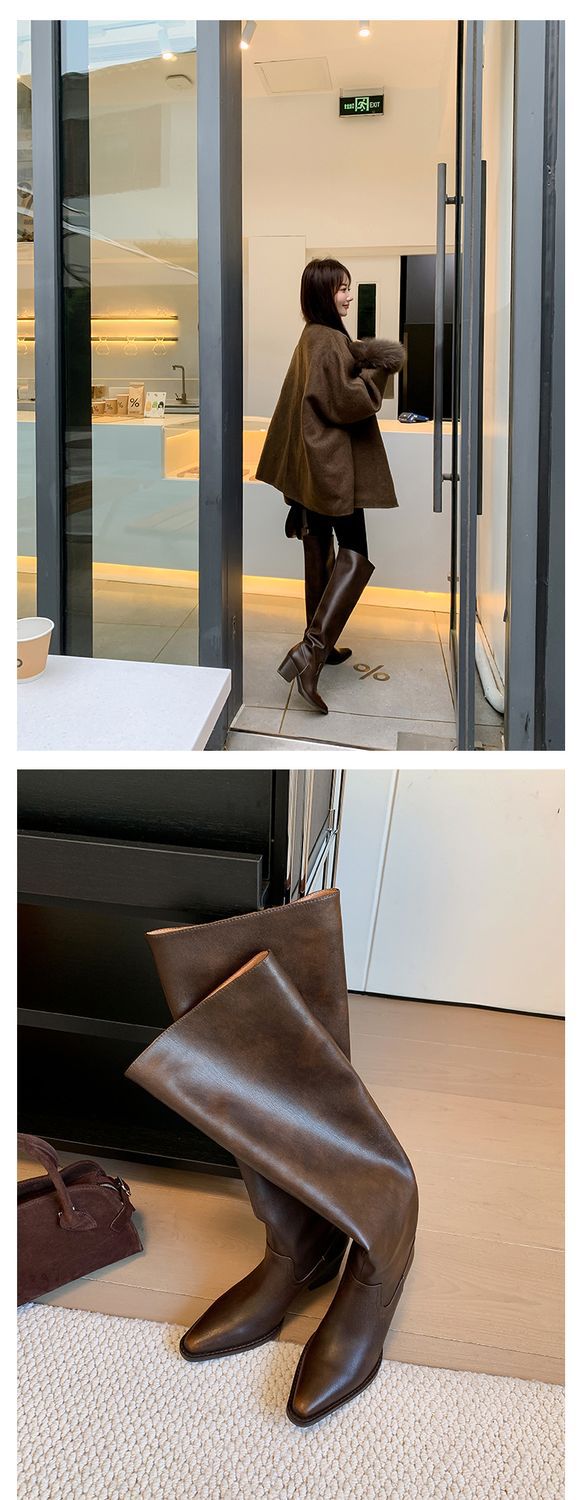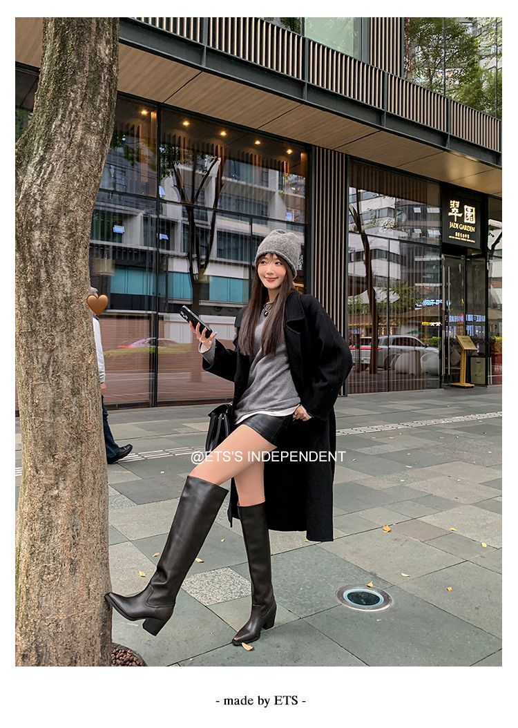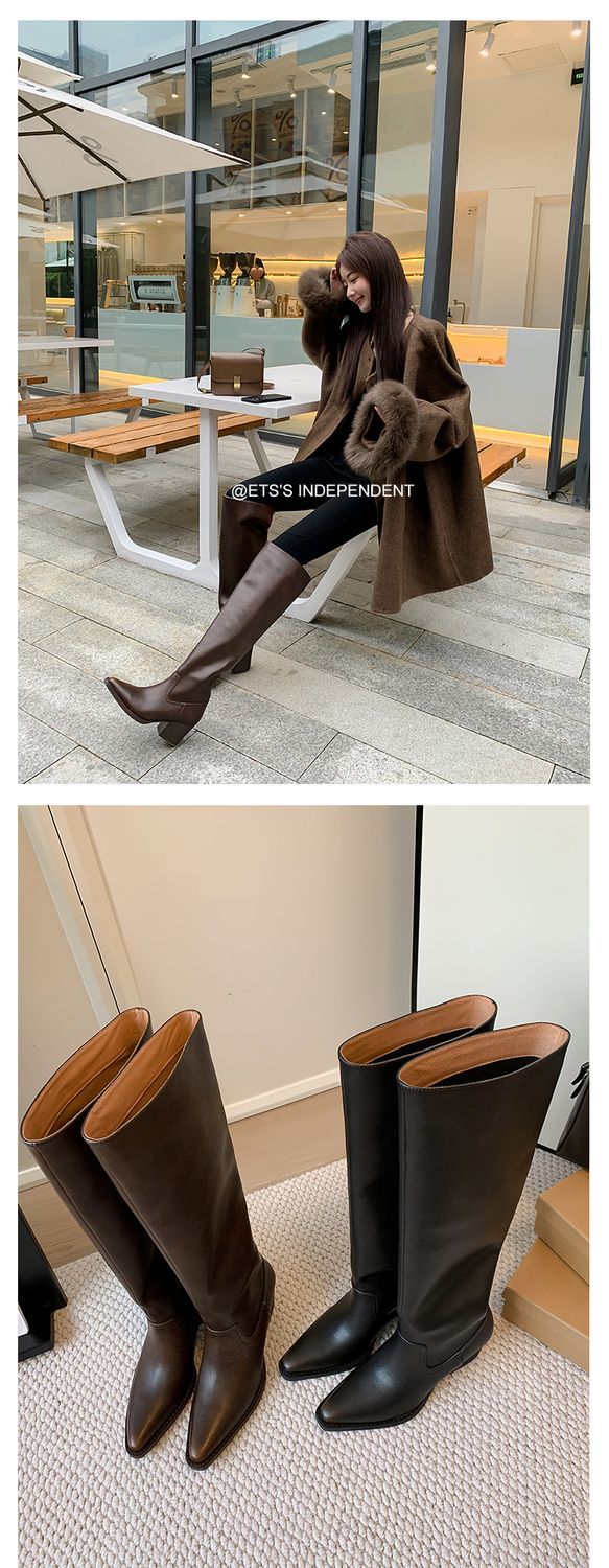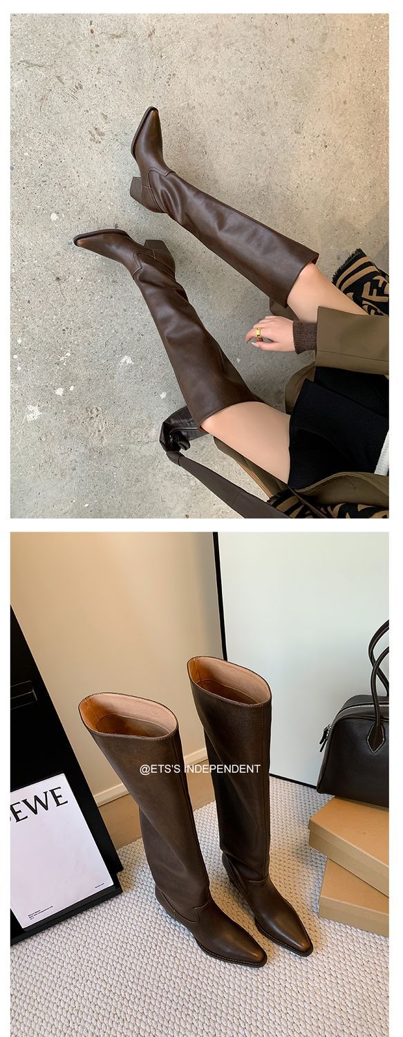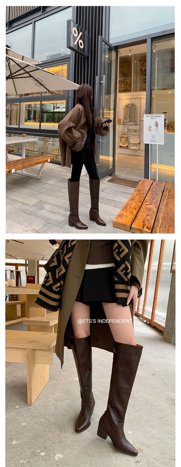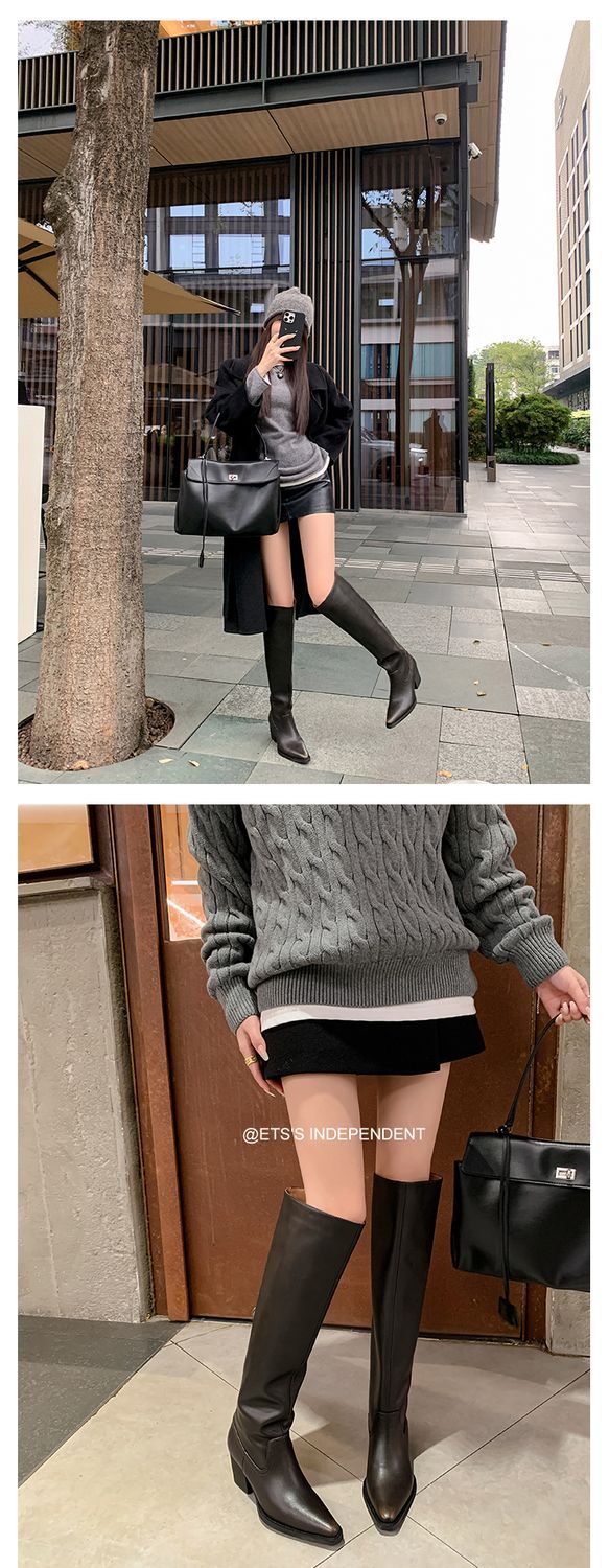 2024 포인트 6cm 두꺼운 힐 높은 부츠 여성 가을 및 겨울 무릎 높이 스트레이트 느슨한 가죽 부츠 작은 기사 부츠스토어 가기