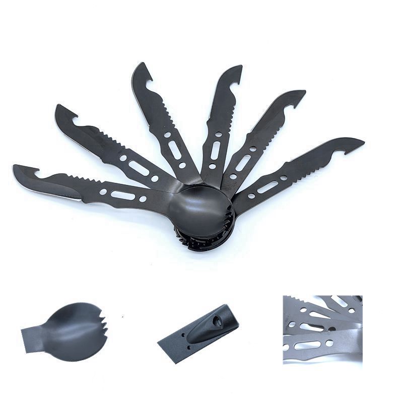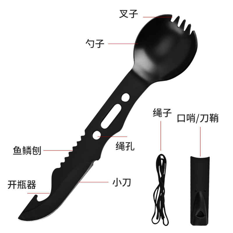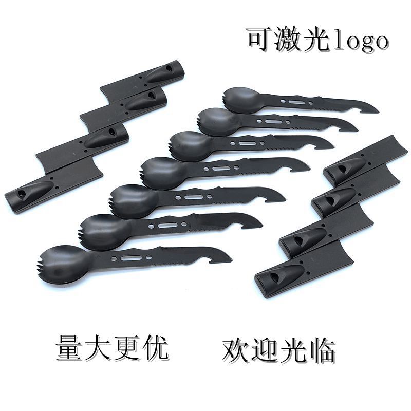 공장 다기능 스테인레스 캠핑 7 대 1 식기 칼, 포크 및 스푼 휘파람 야외 등산 비상 생존 가제트스토어 가기