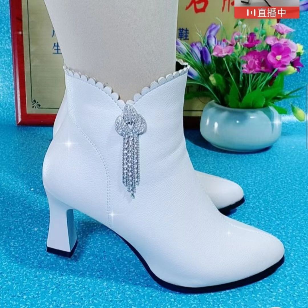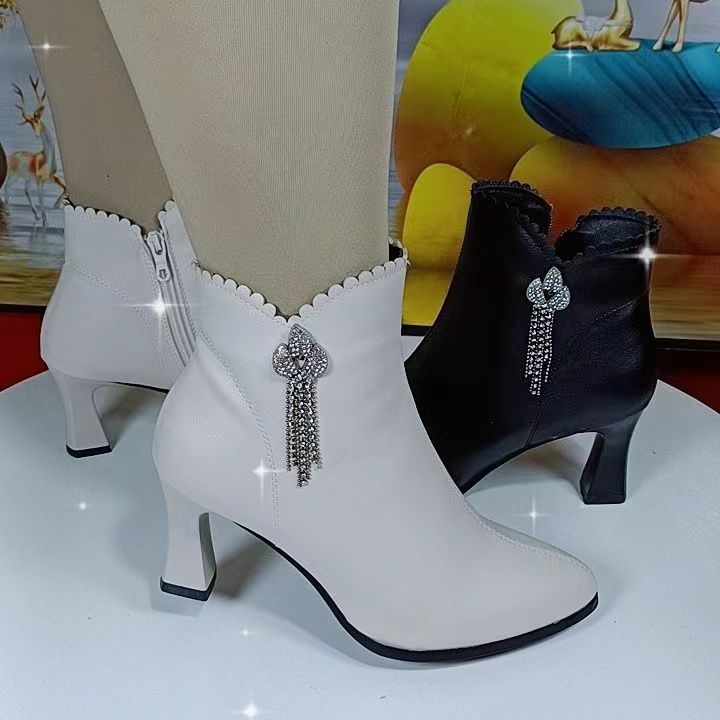 두꺼운 하이힐 포인팅 쇼트 부츠 라인스톤 유럽과 미국 마틴 부츠 2024 겨울 새로운 스타일 중년 및 노인 여성 유행 가죽 부츠스토어 가기