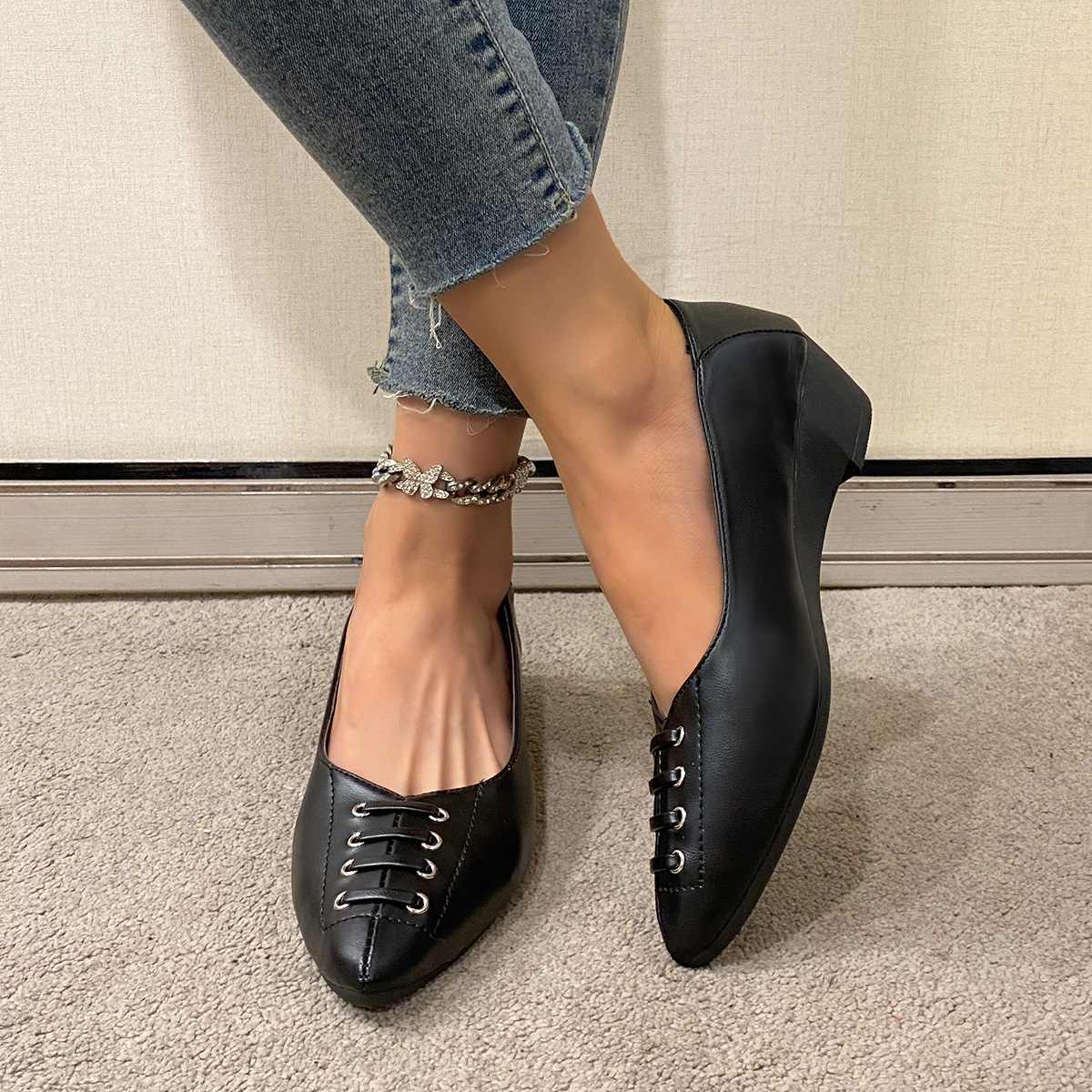 봄과 가을의 새로운 패션 편안한 소프트 솔 긴 서 피곤하지 않은 발 두꺼운 힐 작은 가죽 신발 우아한 우아한 올 매치 캐주얼 싱글 레이어 신발스토어 가기