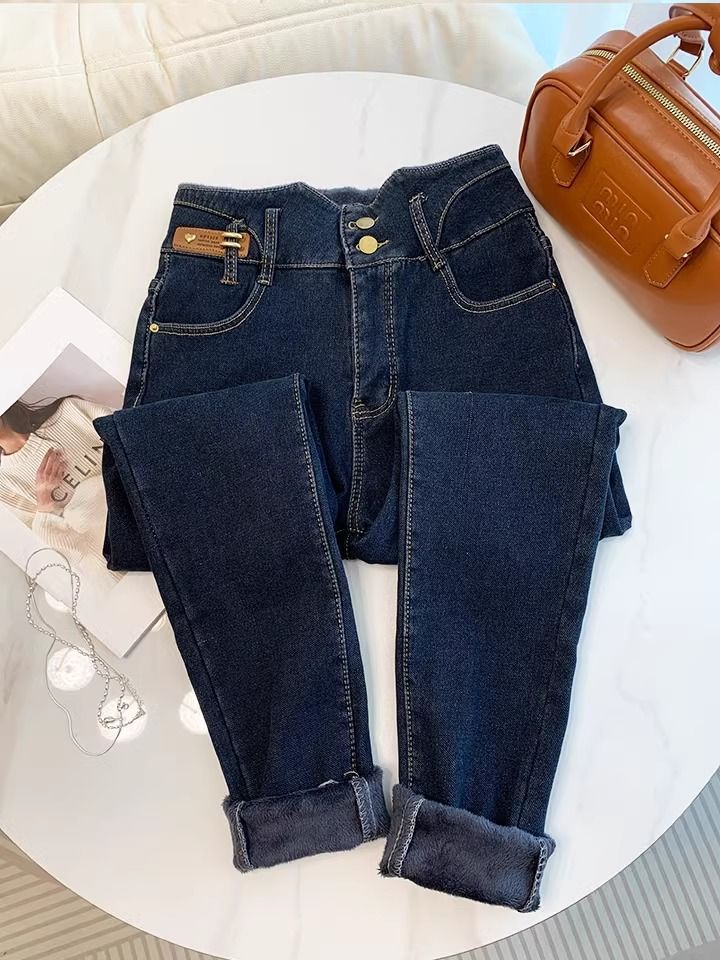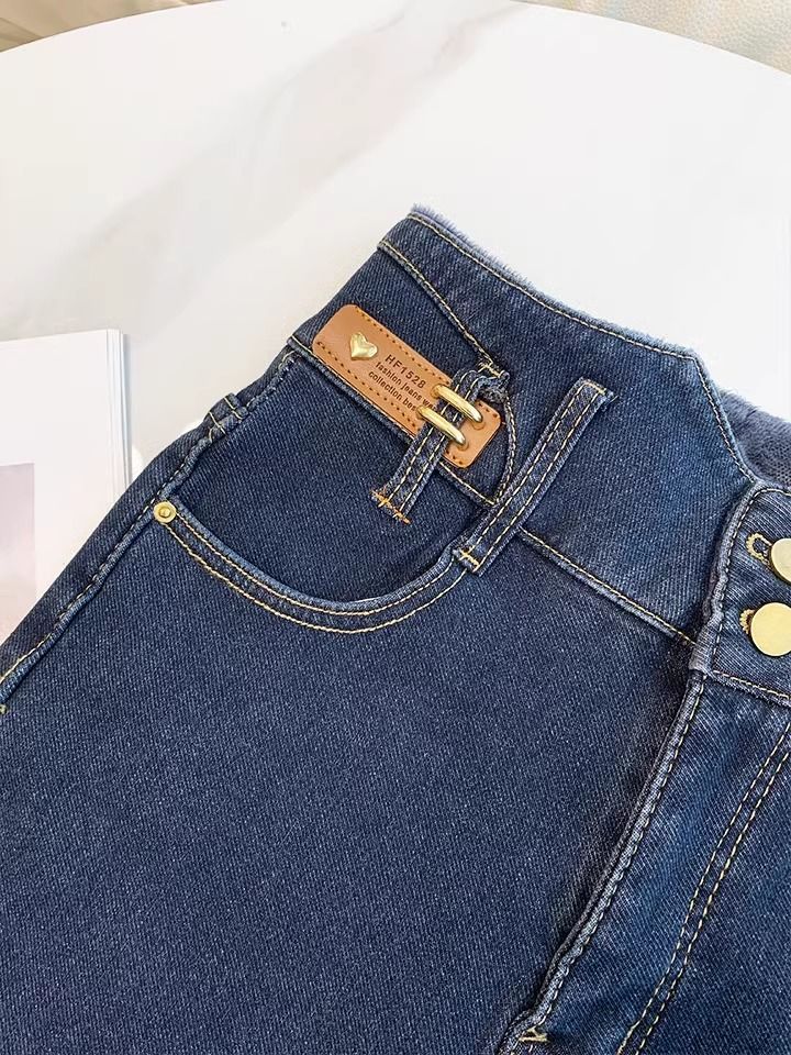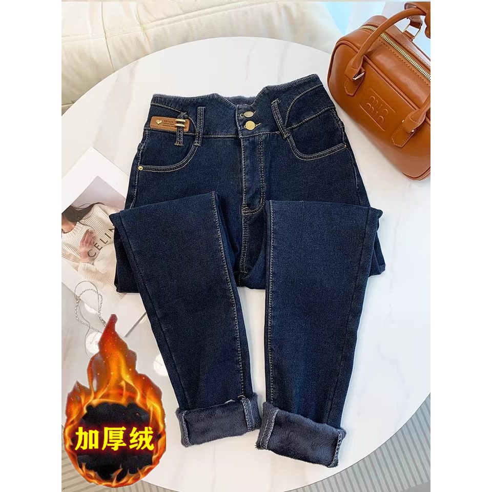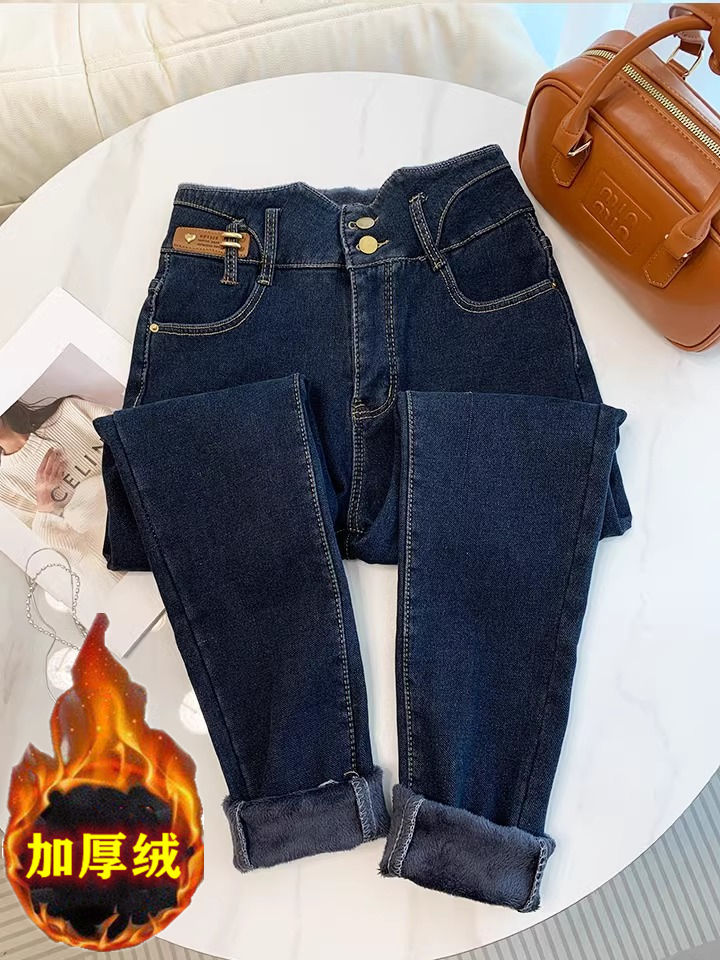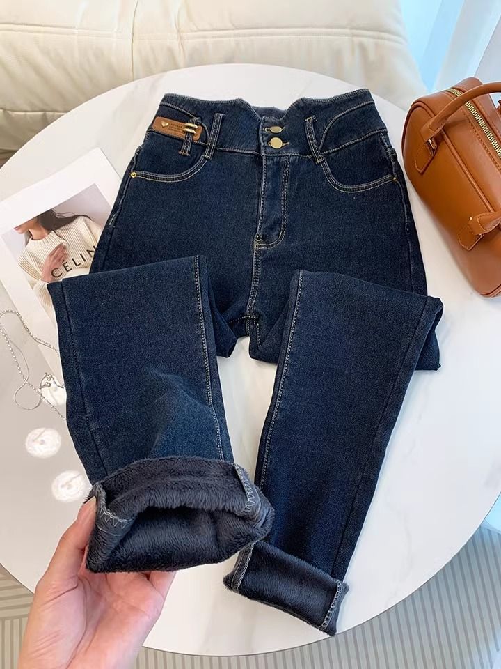 초보온 플러스 벨벳 안감 두꺼운 여성용 청바지 2025 겨울 신상 하이웨이스트 슬림핏 타이트 나인포인트 부츠컷 팬츠