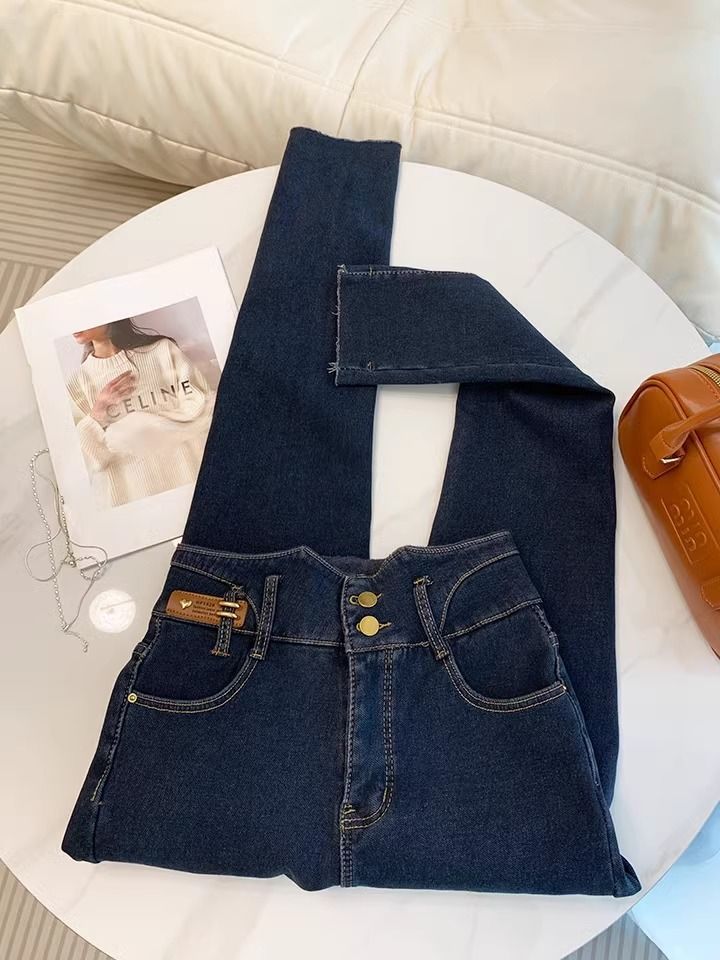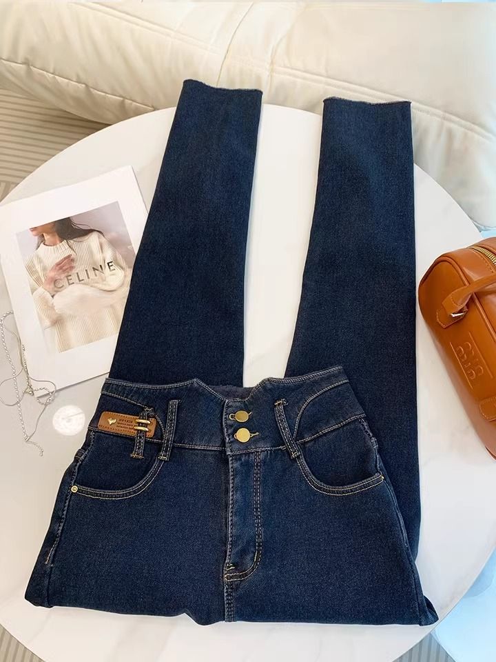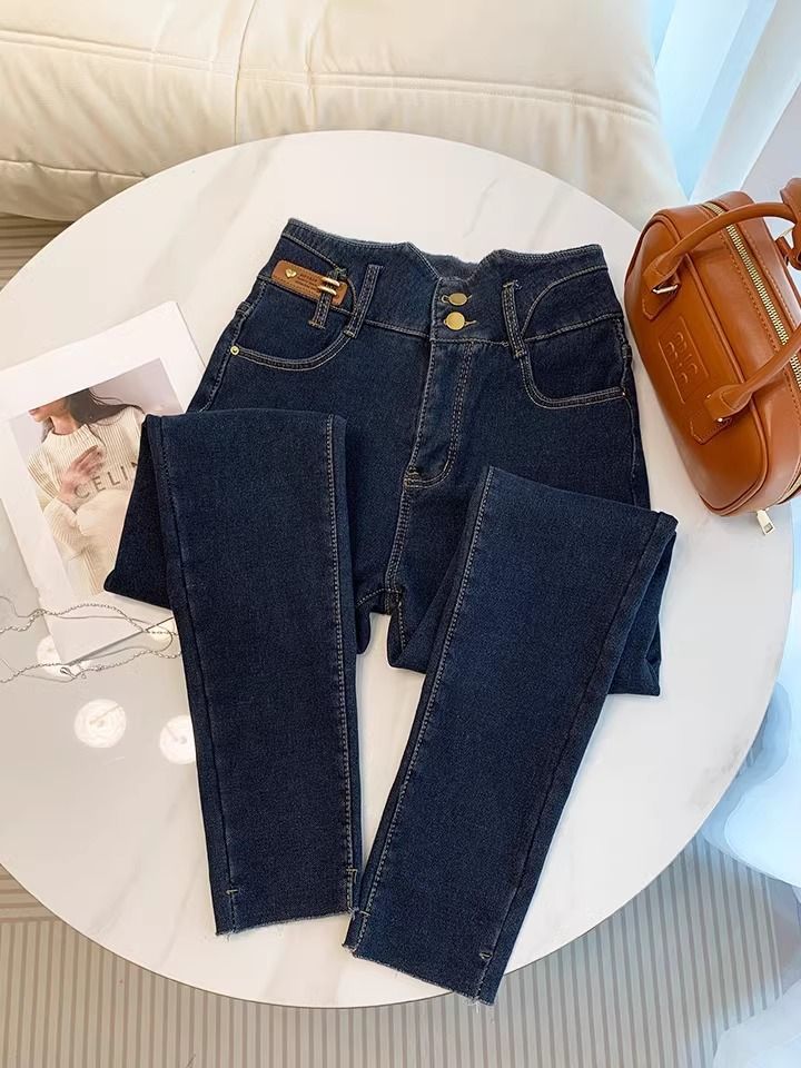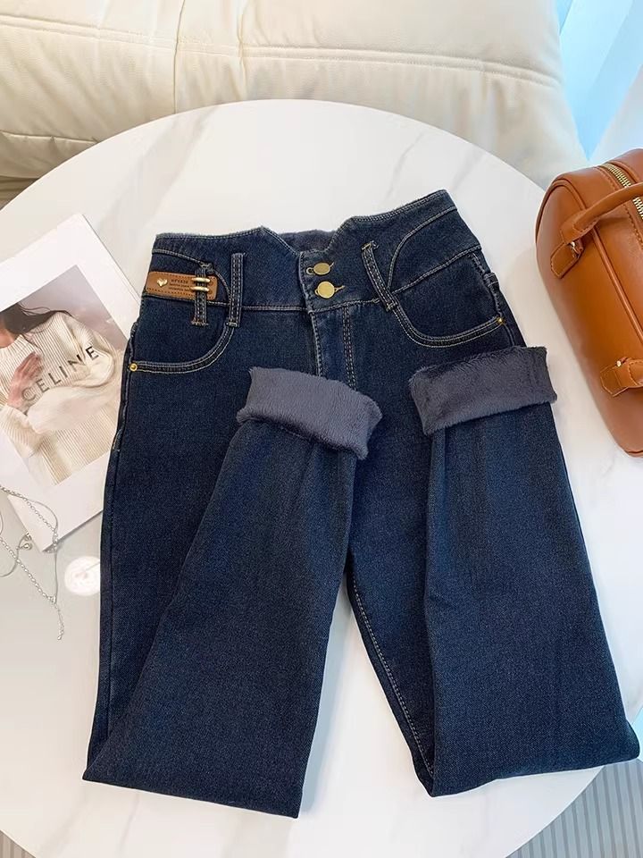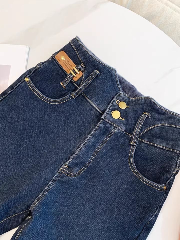 초보온 플러스 벨벳 안감 두꺼운 여성용 청바지 2025 겨울 신상 하이웨이스트 슬림핏 타이트 나인포인트 부츠컷 팬츠
