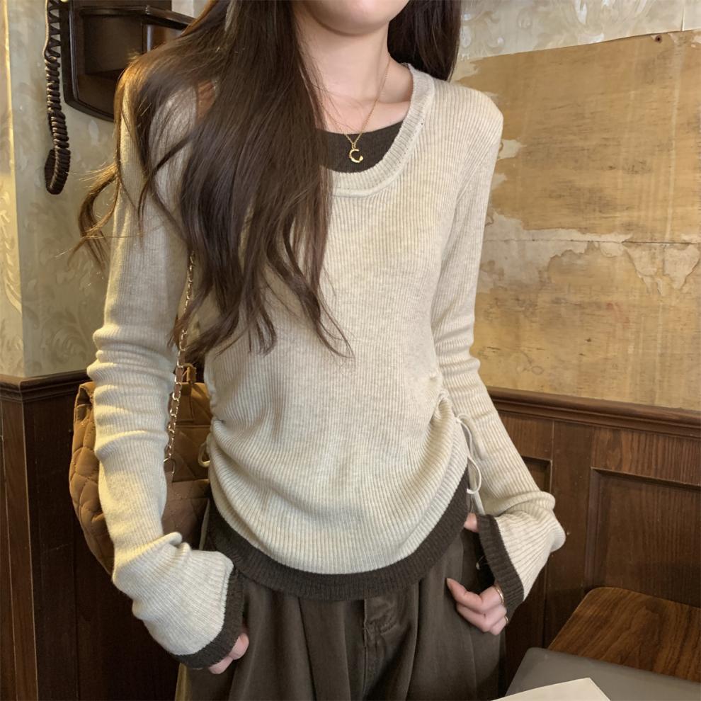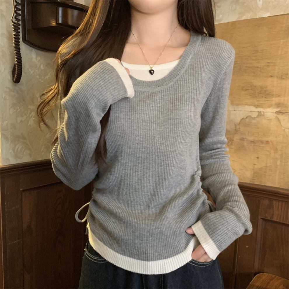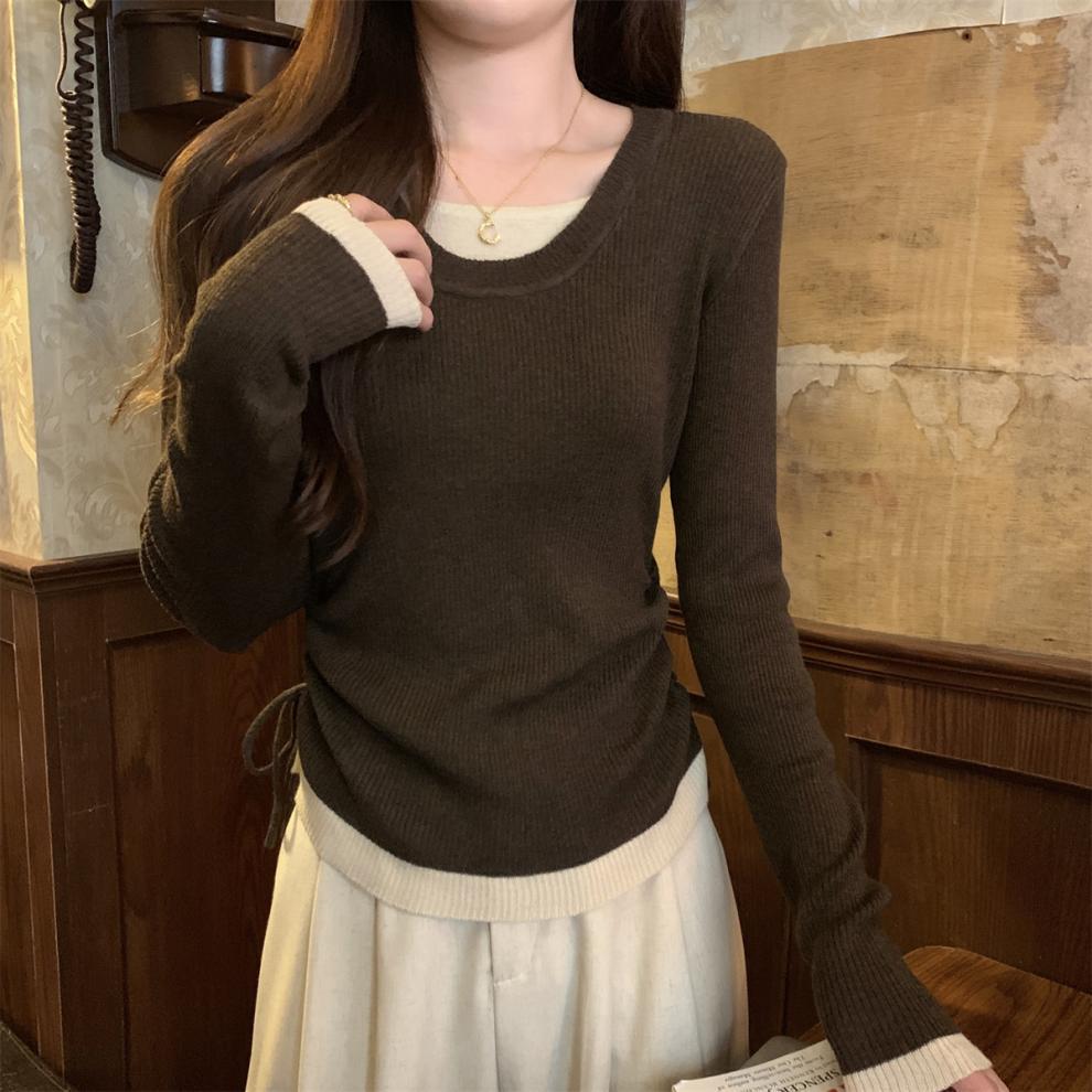 가을과 겨울 2024 한국식 기질 대비 컬러 U-칼라 드로 스트링 가짜 투피스 니트 바닥 내부 긴 소매 재킷