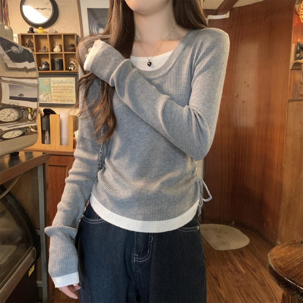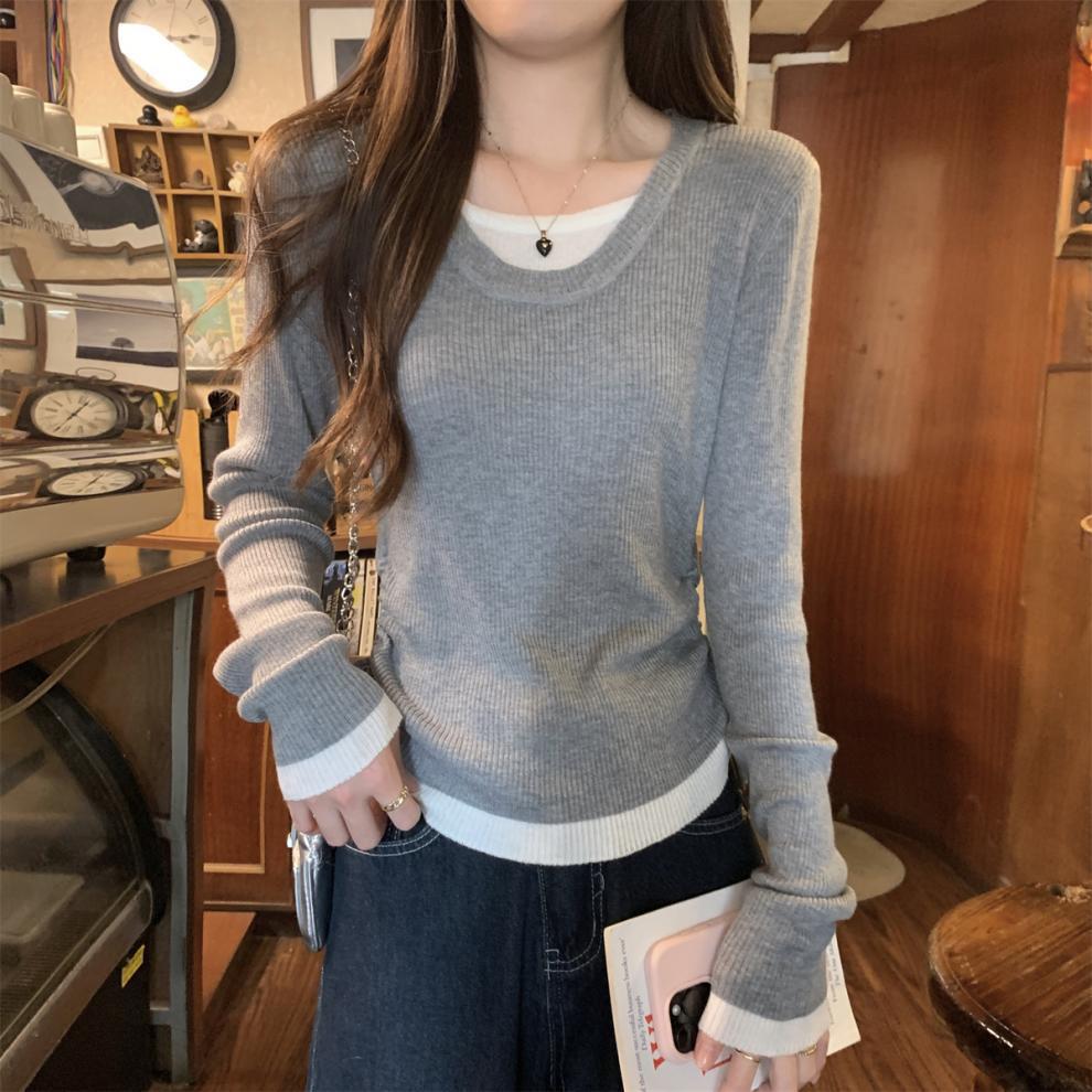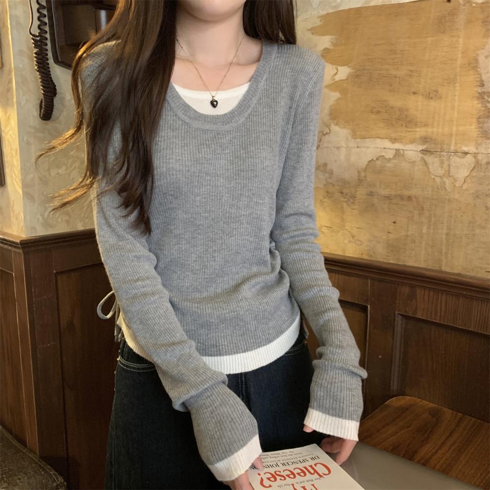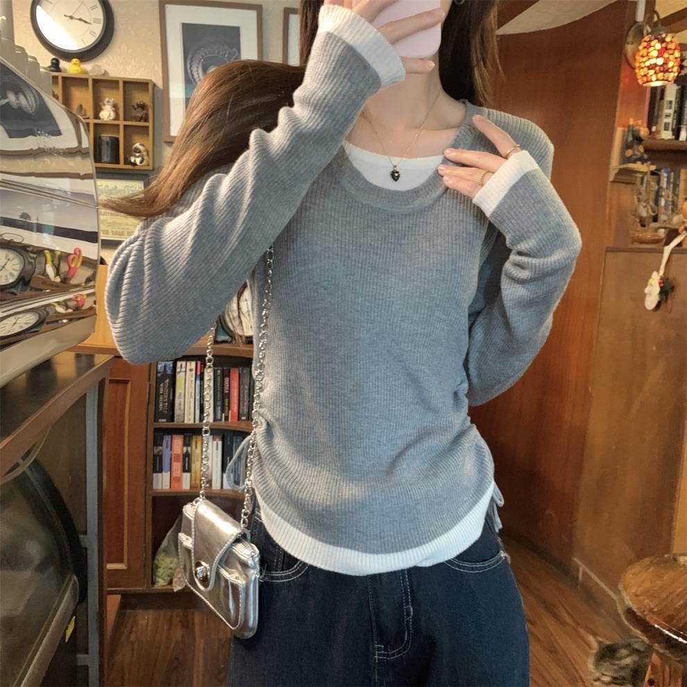 가을과 겨울 2024 한국식 기질 대비 컬러 U-칼라 드로 스트링 가짜 투피스 니트 바닥 내부 긴 소매 재킷