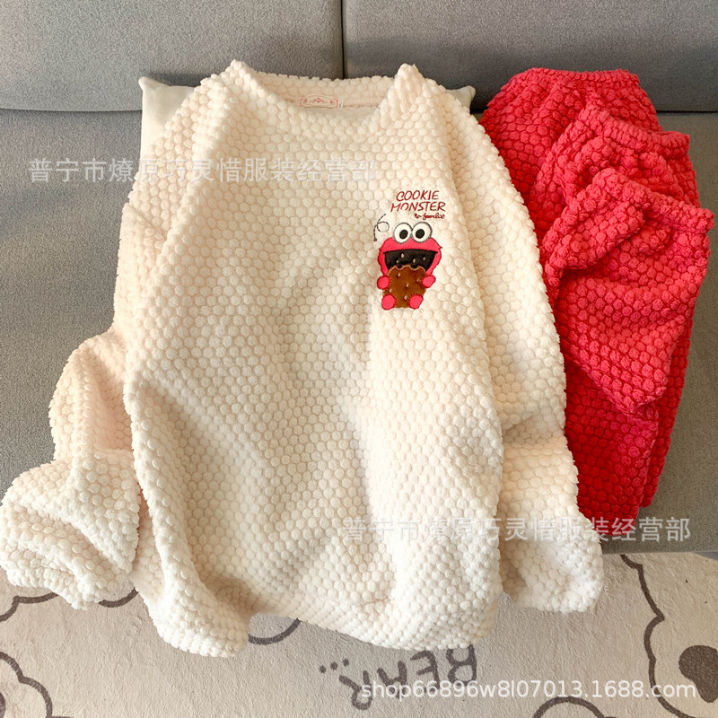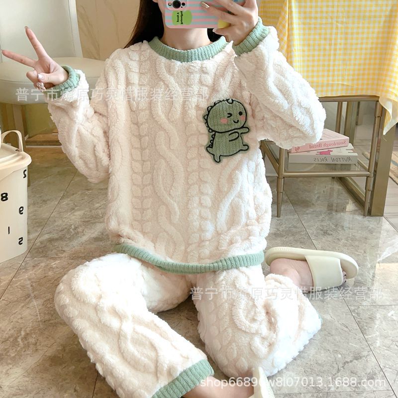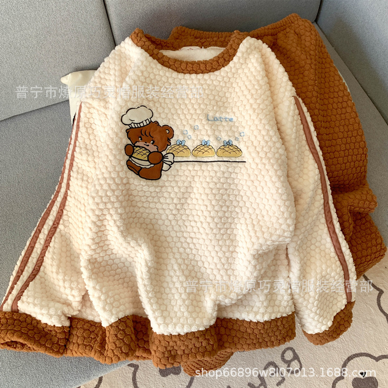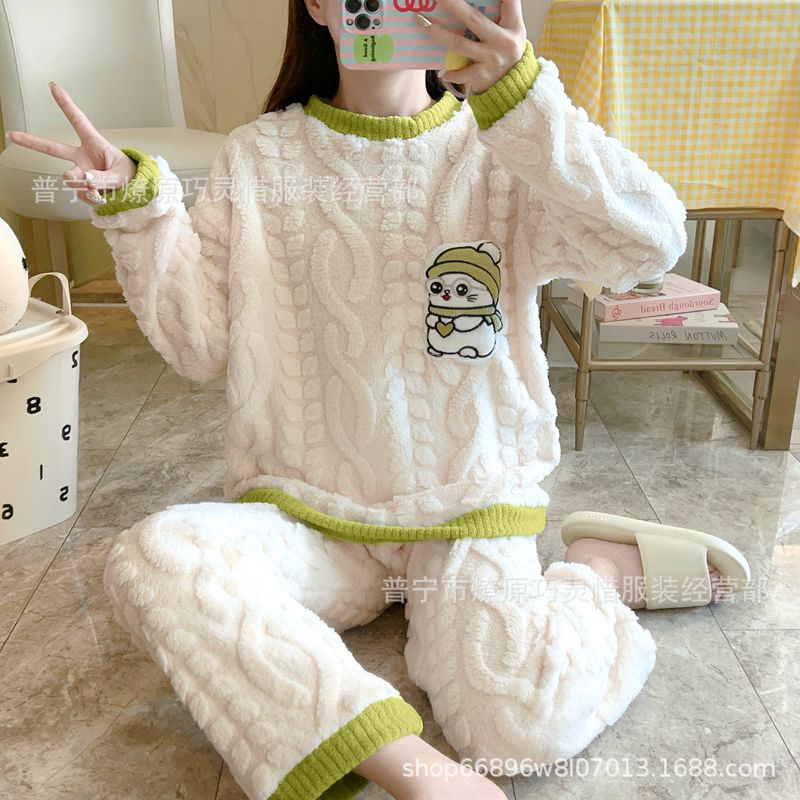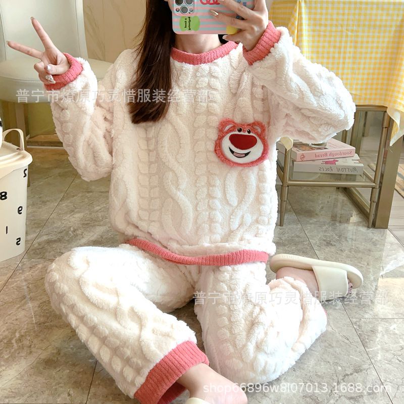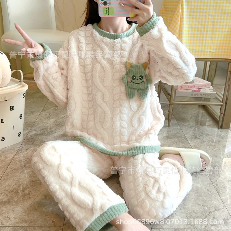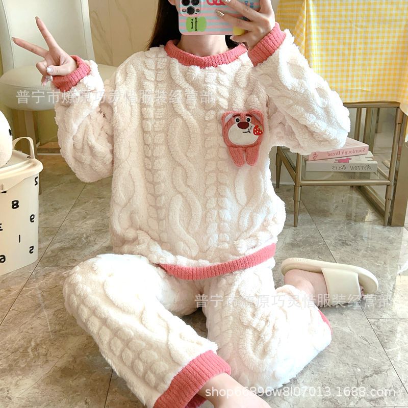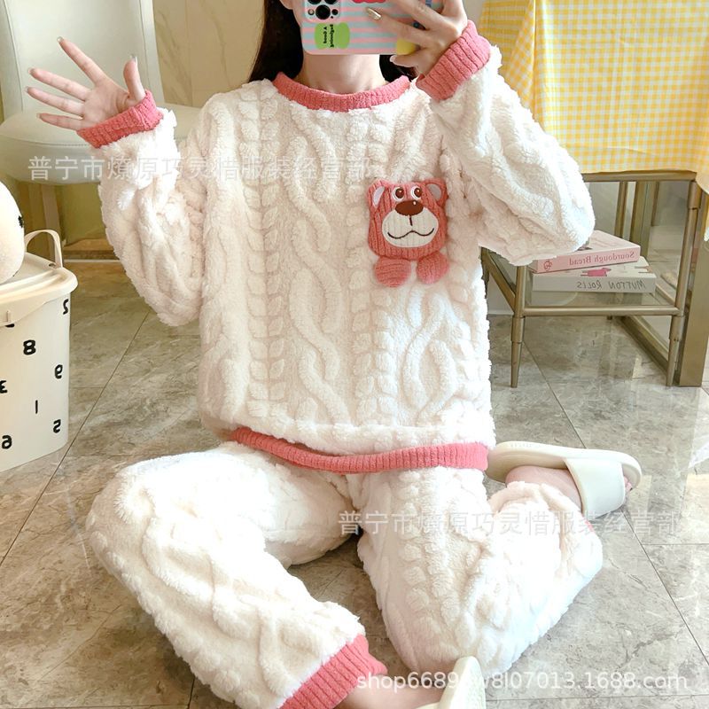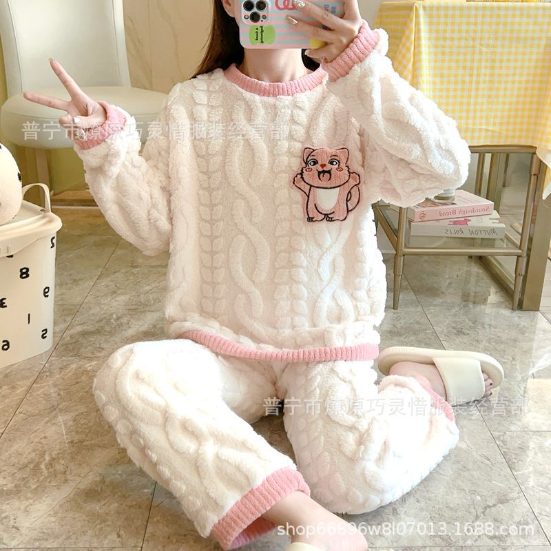 산호 벨벳 파자마 여성의 겨울 기모 두꺼운 따뜻한 플란넬 사이버 연예인 Ins 스타일 2024 새 홈 의류스토어 가기