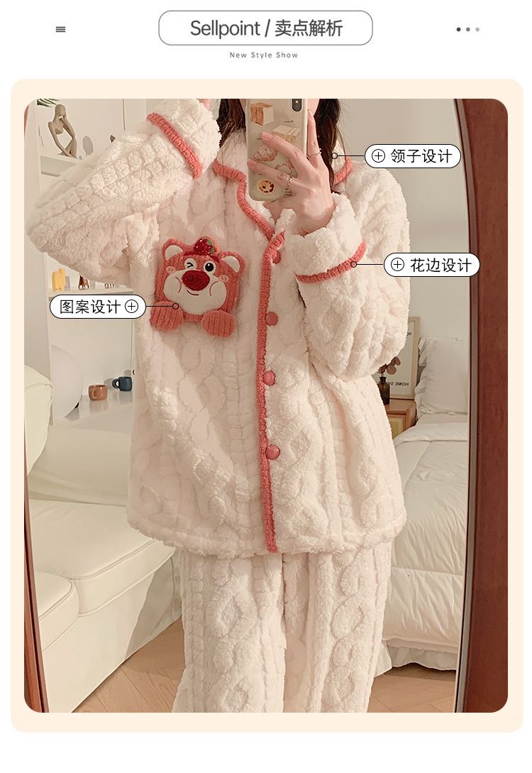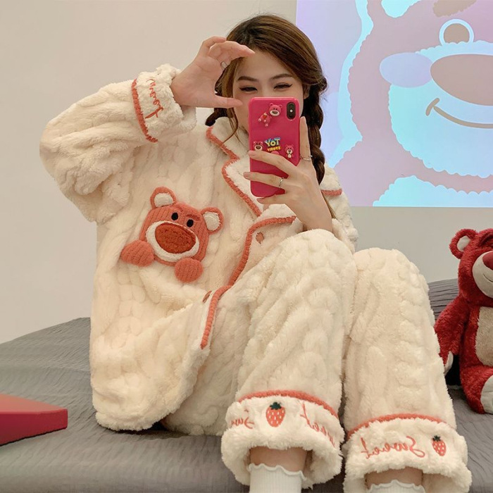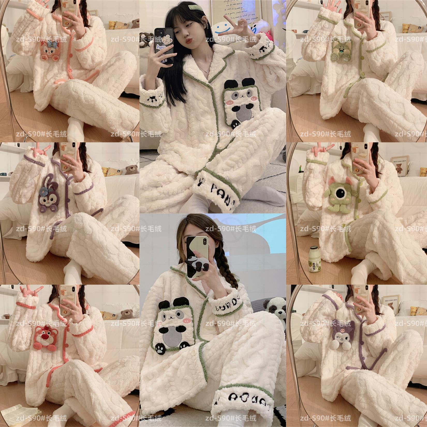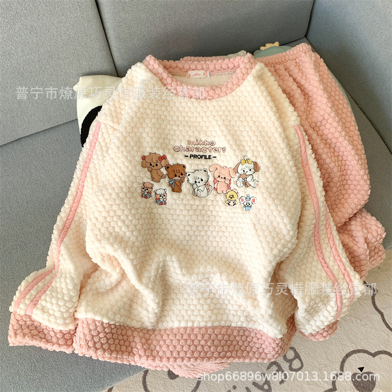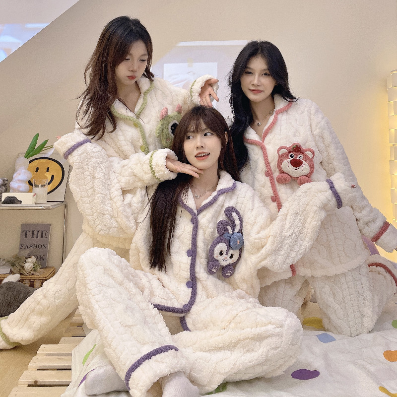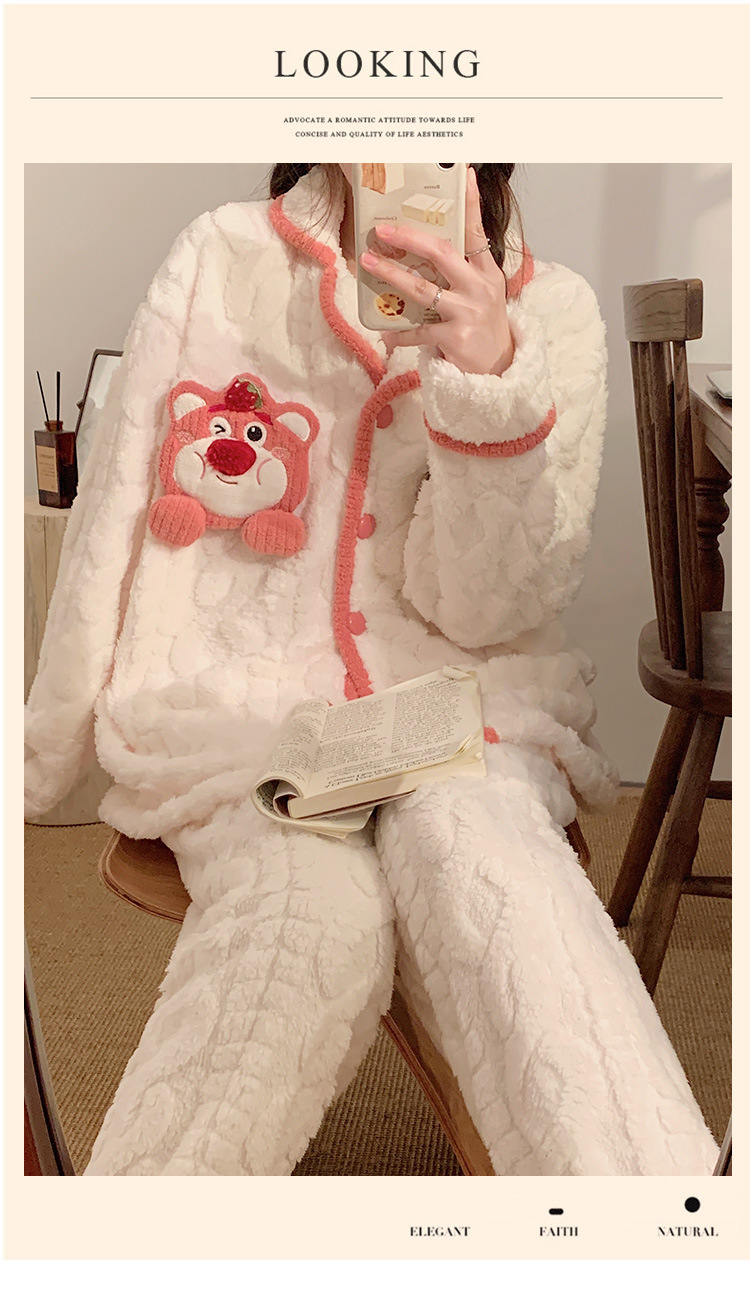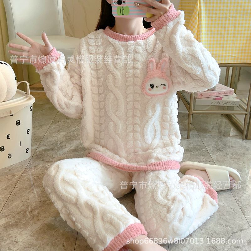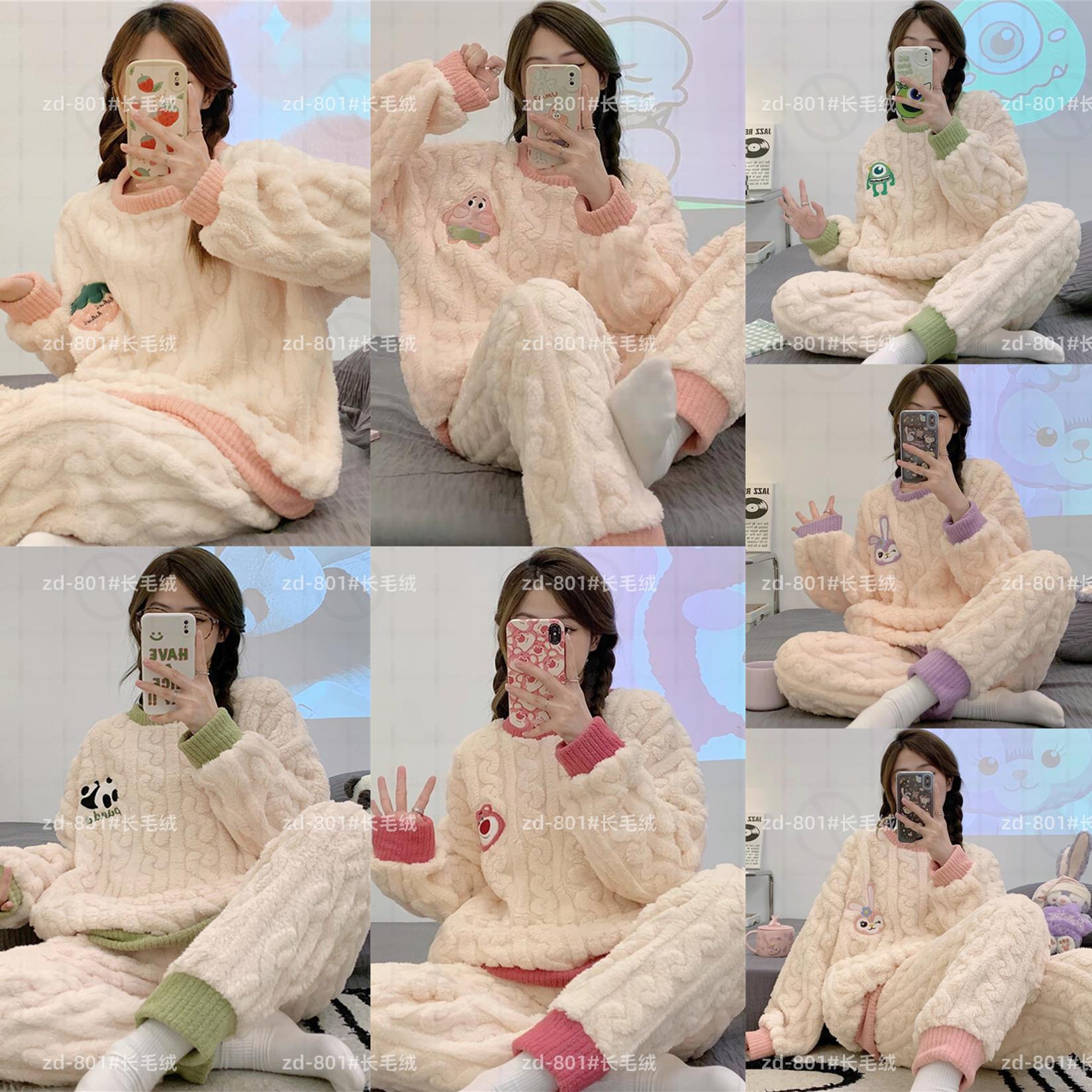 산호 벨벳 파자마 여성의 겨울 기모 두꺼운 따뜻한 플란넬 사이버 연예인 Ins 스타일 2024 새 홈 의류스토어 가기