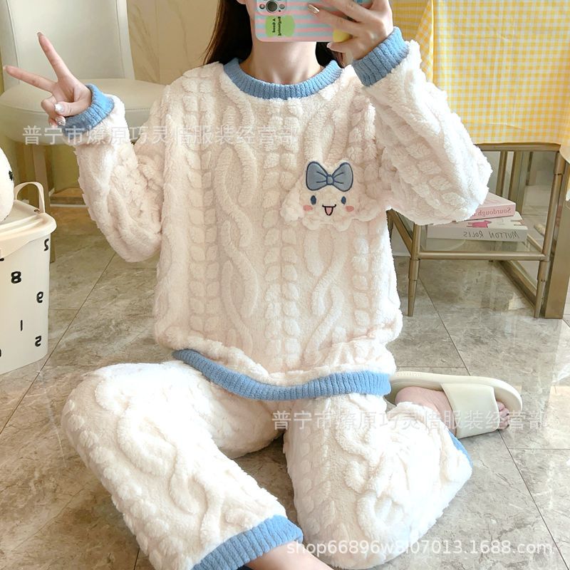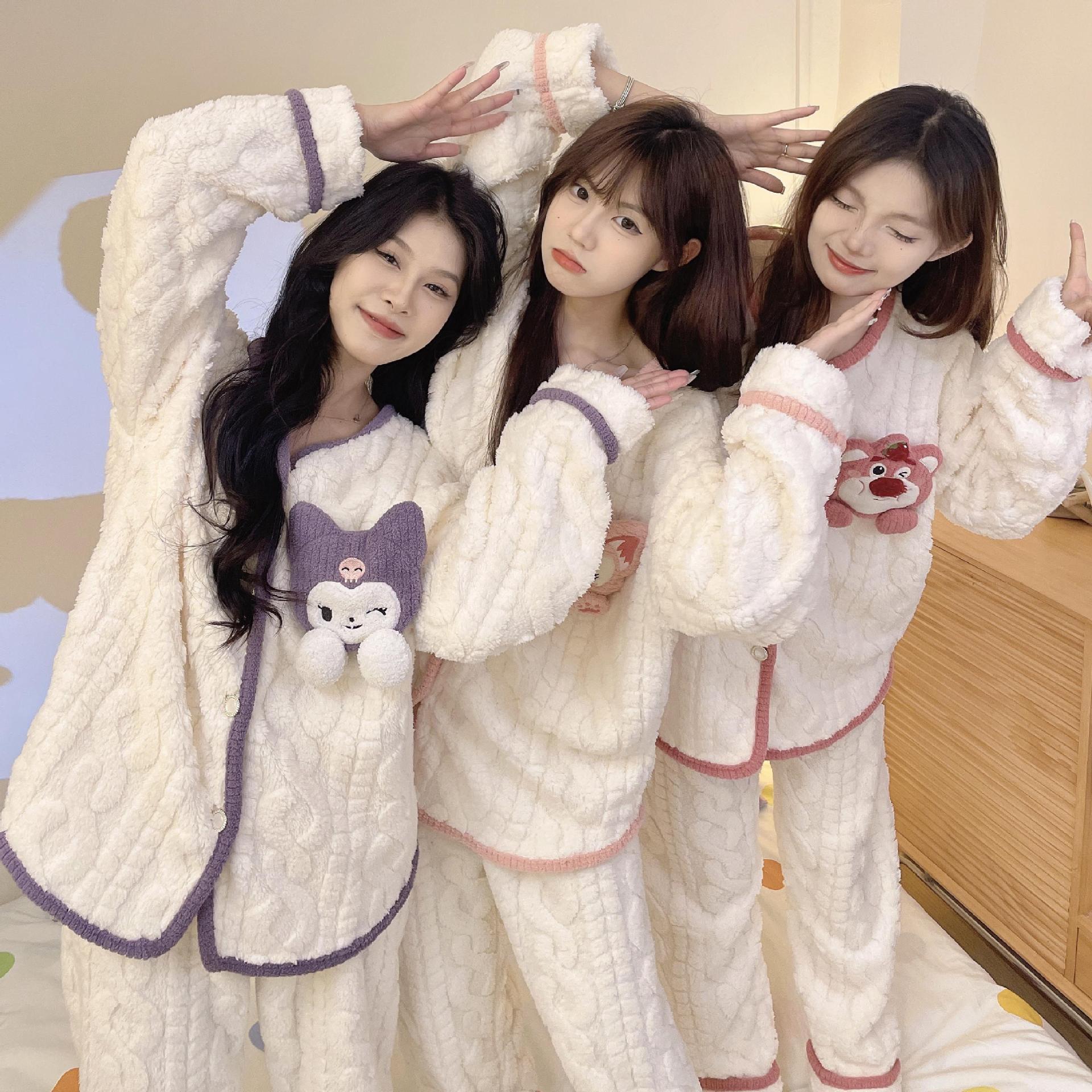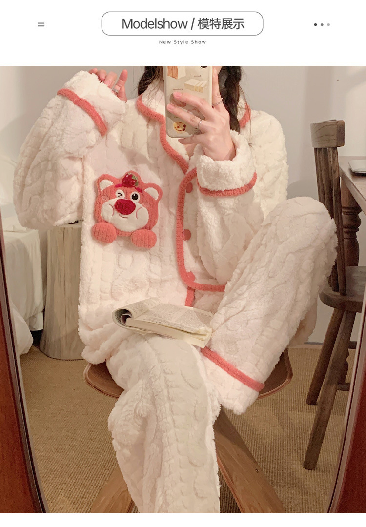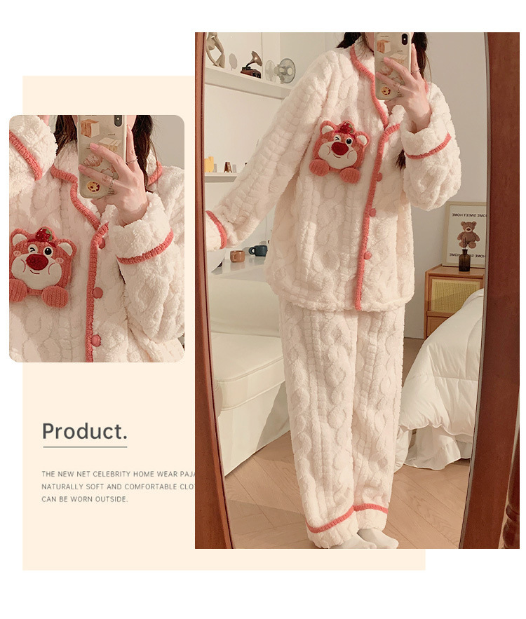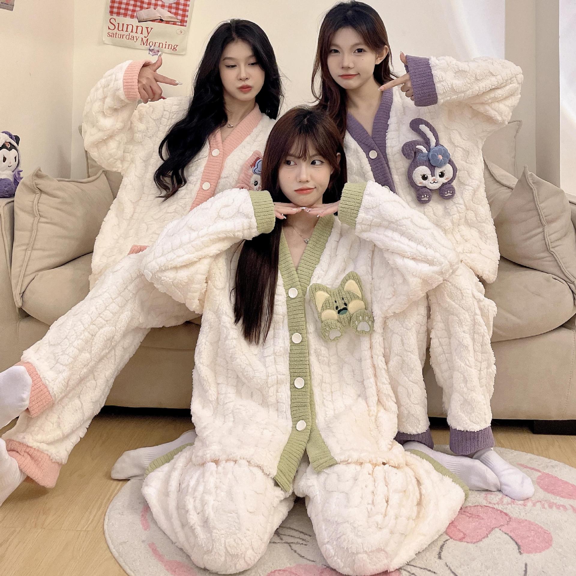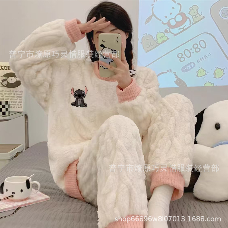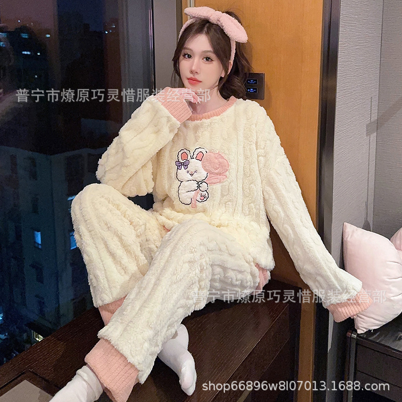 산호 벨벳 파자마 여성의 겨울 기모 두꺼운 따뜻한 플란넬 사이버 연예인 Ins 스타일 2024 새 홈 의류스토어 가기