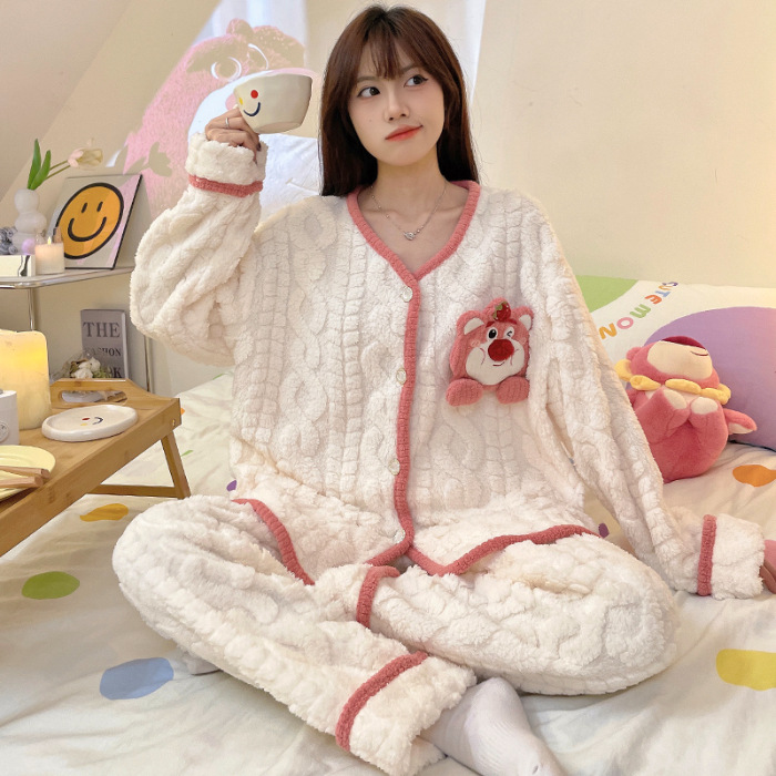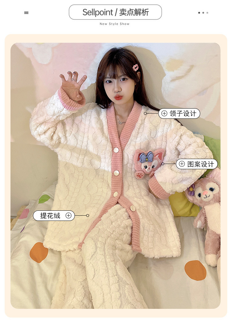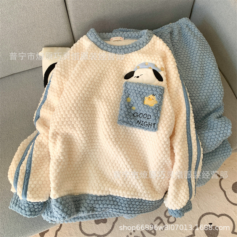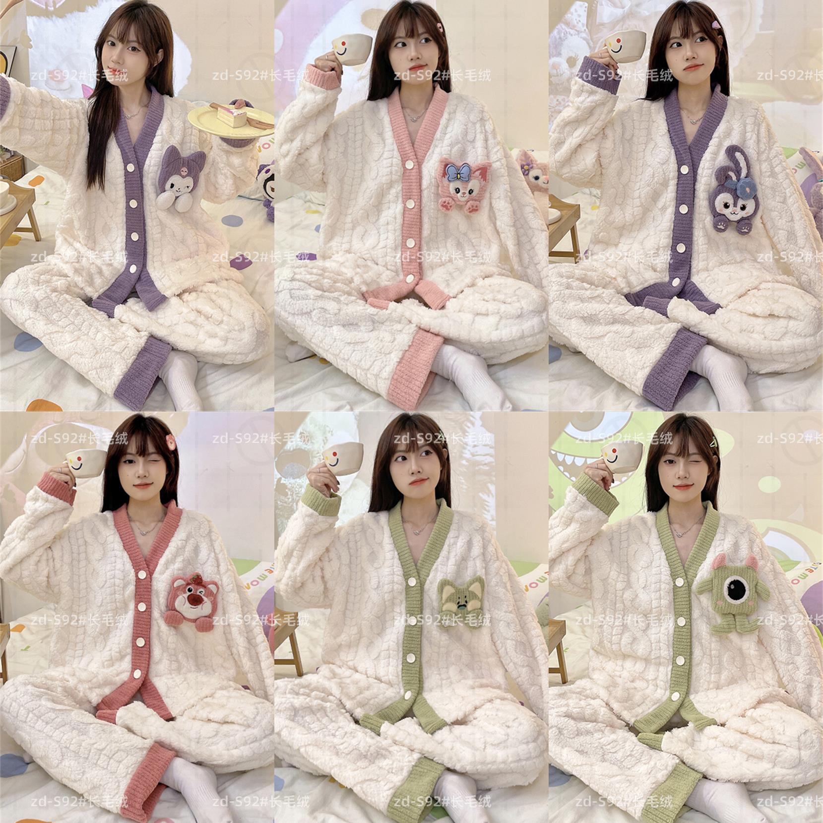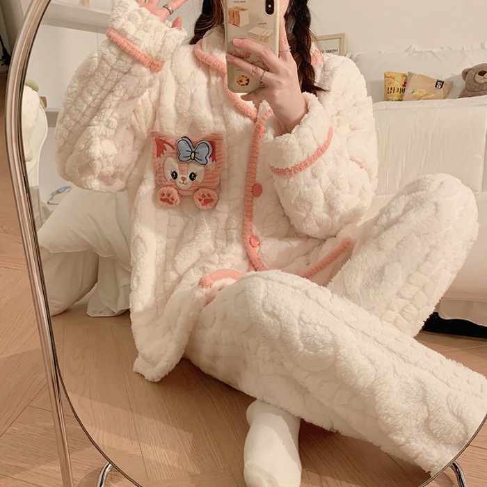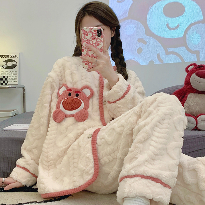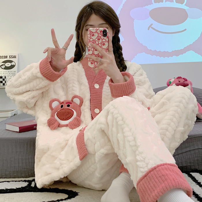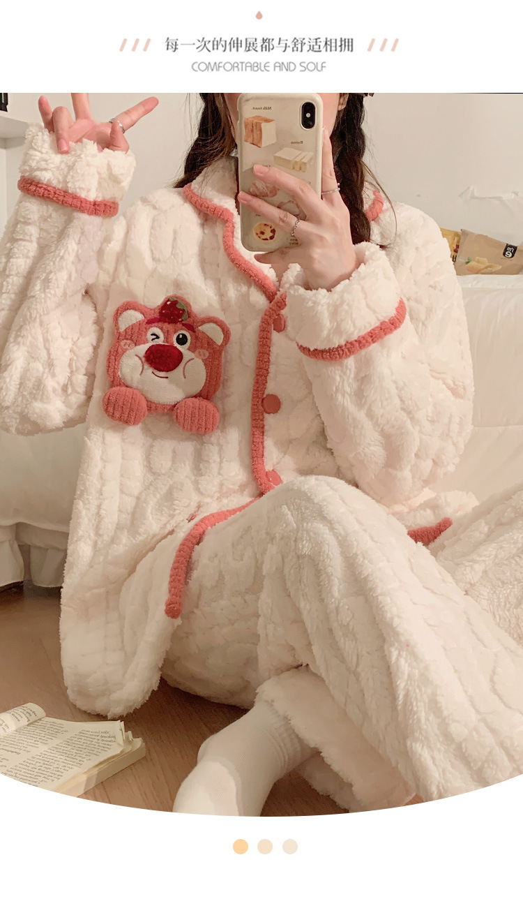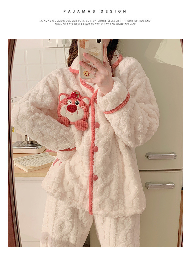 산호 벨벳 파자마 여성의 겨울 기모 두꺼운 따뜻한 플란넬 사이버 연예인 Ins 스타일 2024 새 홈 의류스토어 가기