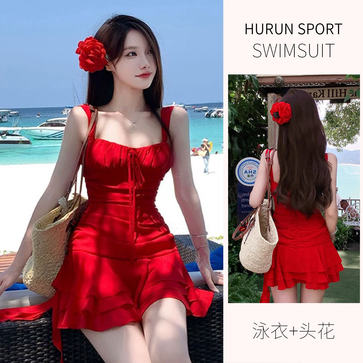 순수한 욕망 스타일 불규칙한 디자인 레드 짧은 스트랩 스커트 우아한 세련된 타이트 허리 슬리밍 수영복 여름
