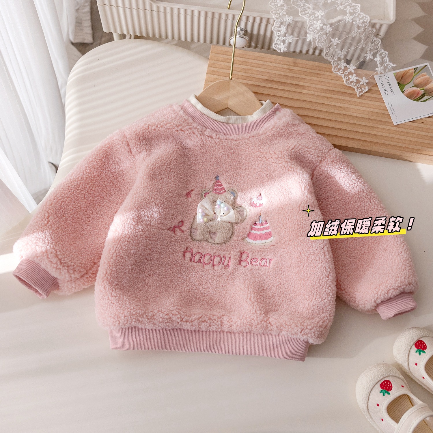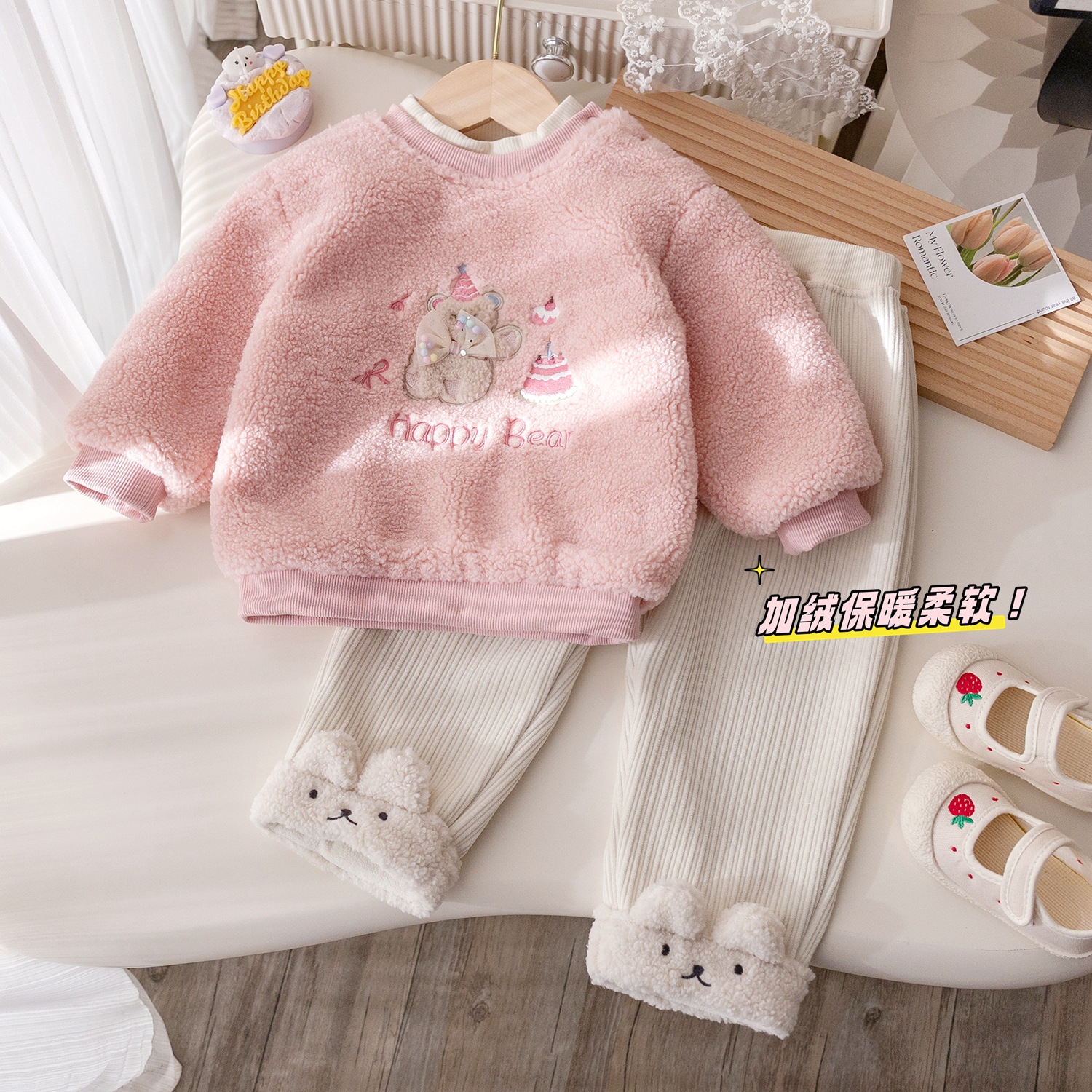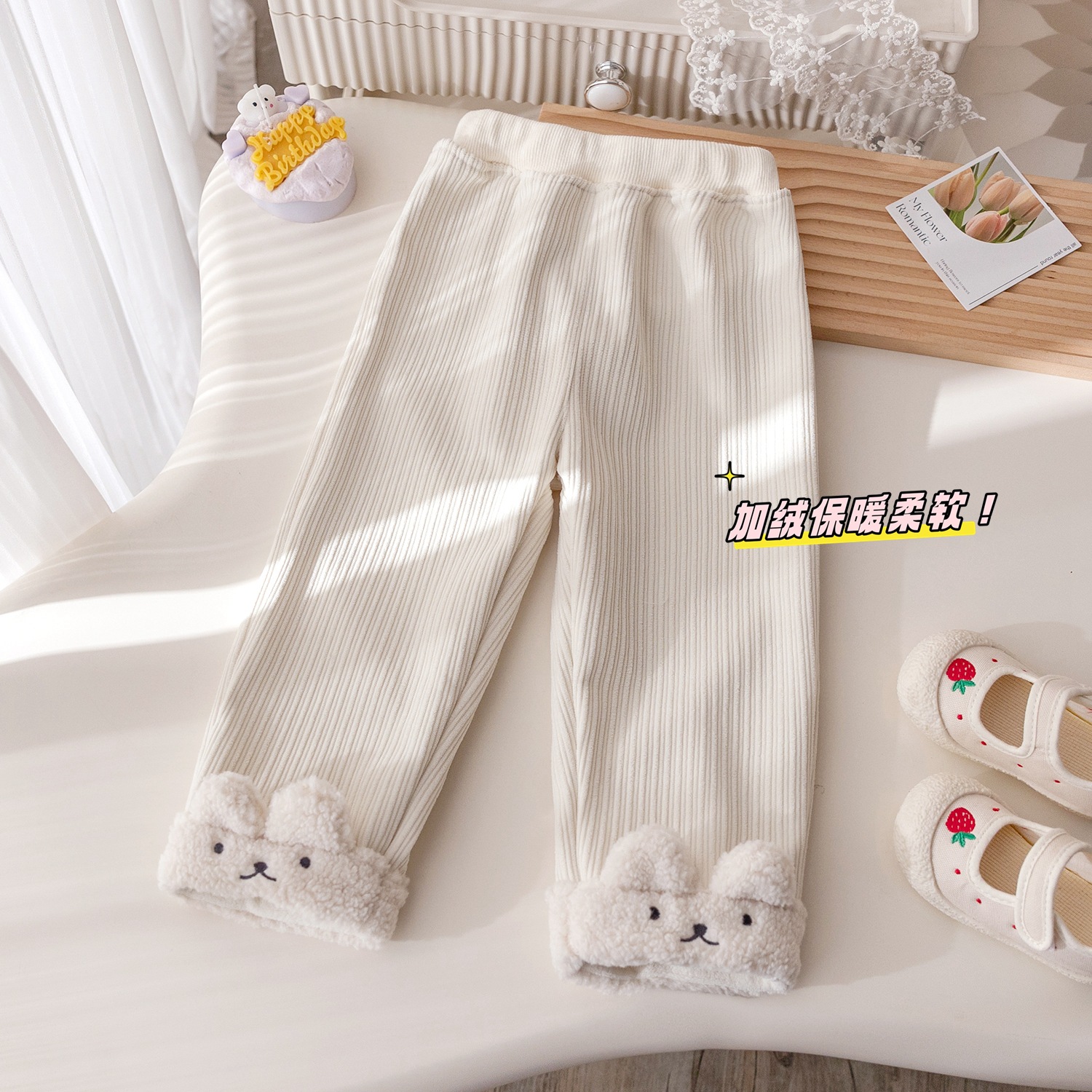 여자 기모 캐주얼 바지 달콤한 귀여운 곰 자수 곧은 바지 아기 소녀 겨울 새로운 원피스 벨벳 바지스토어 가기