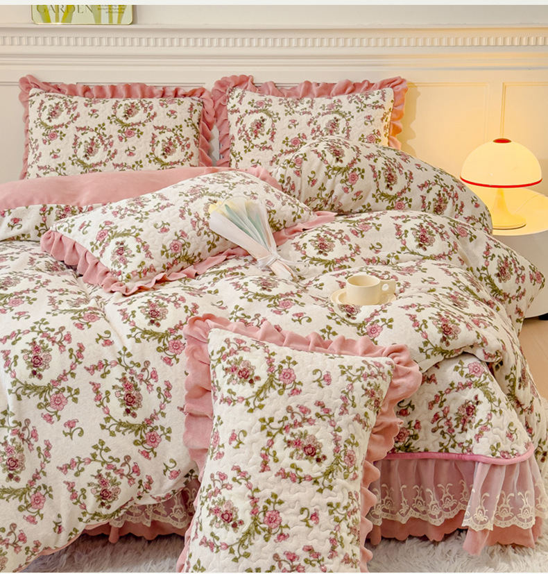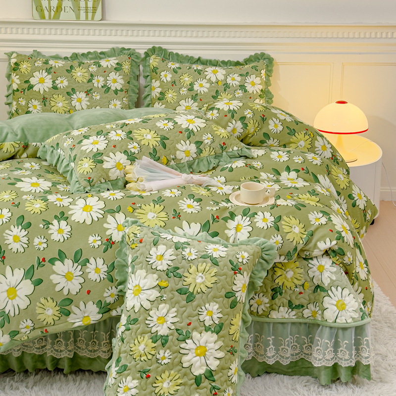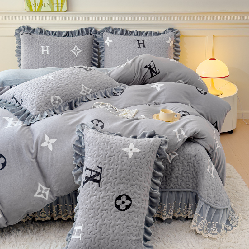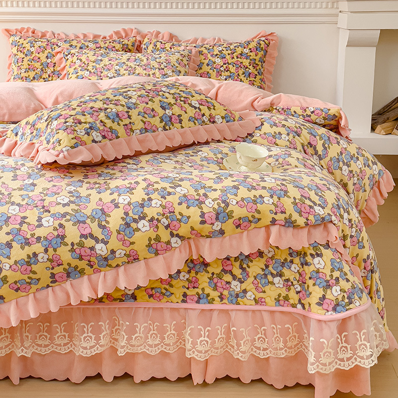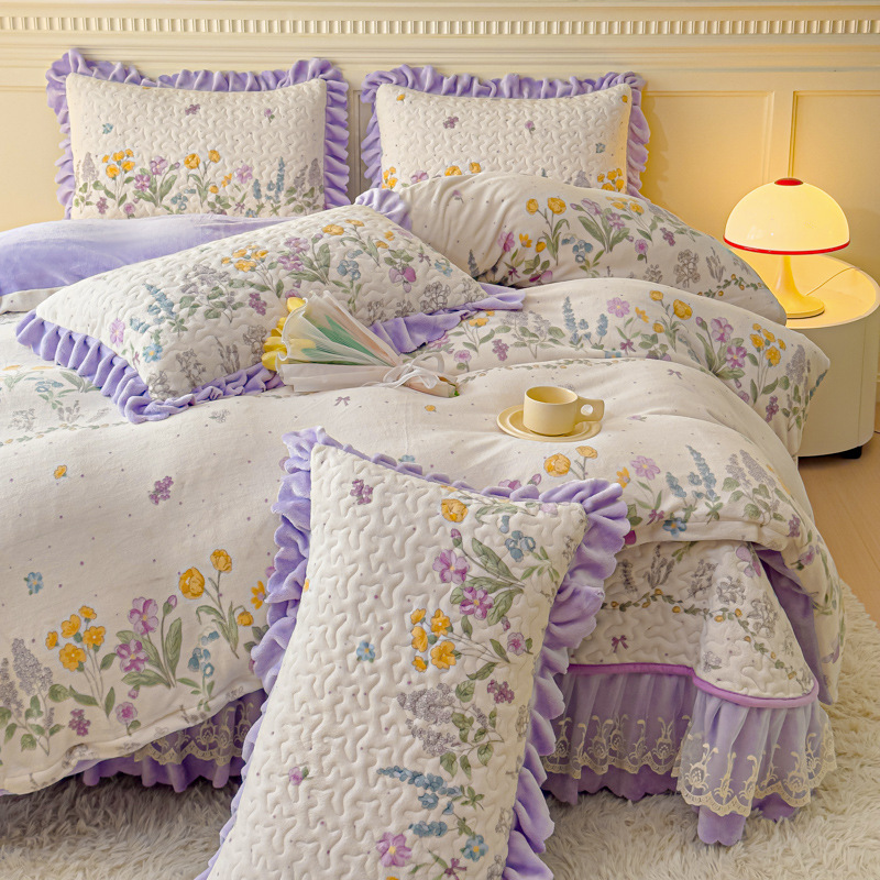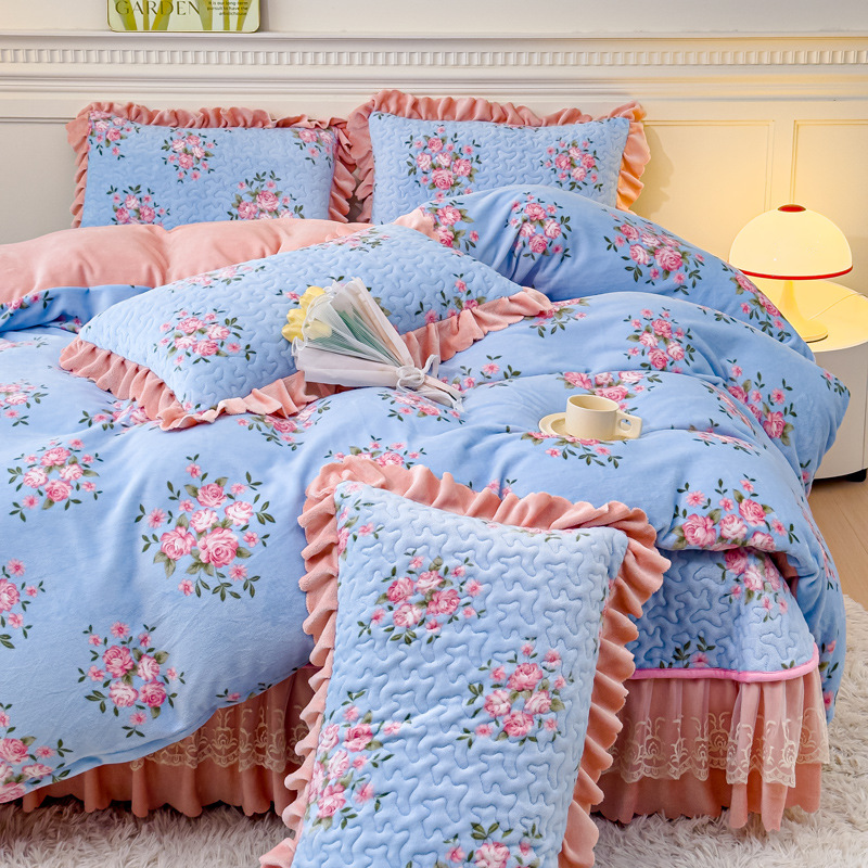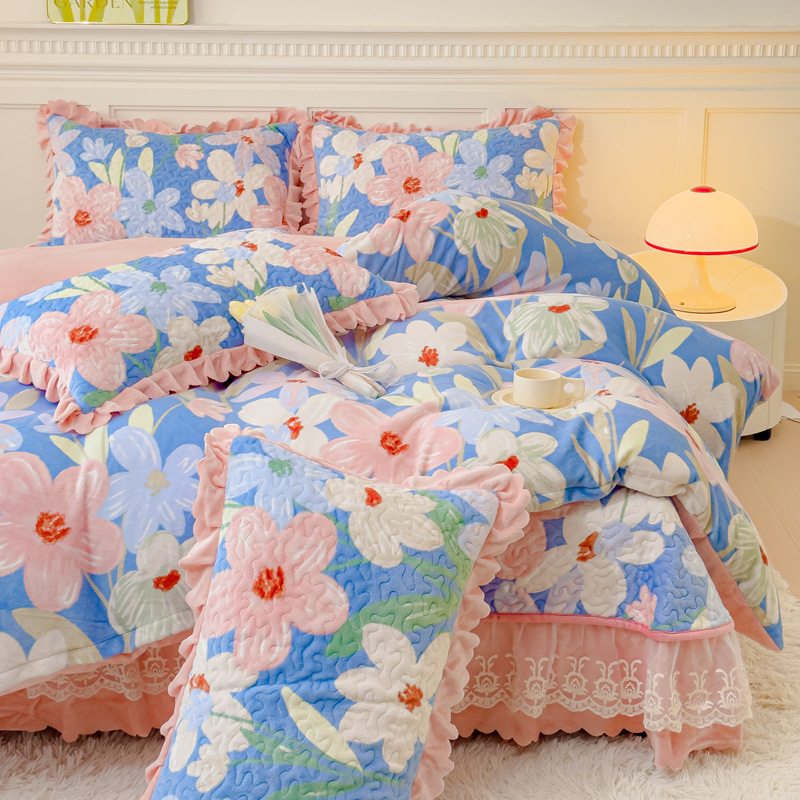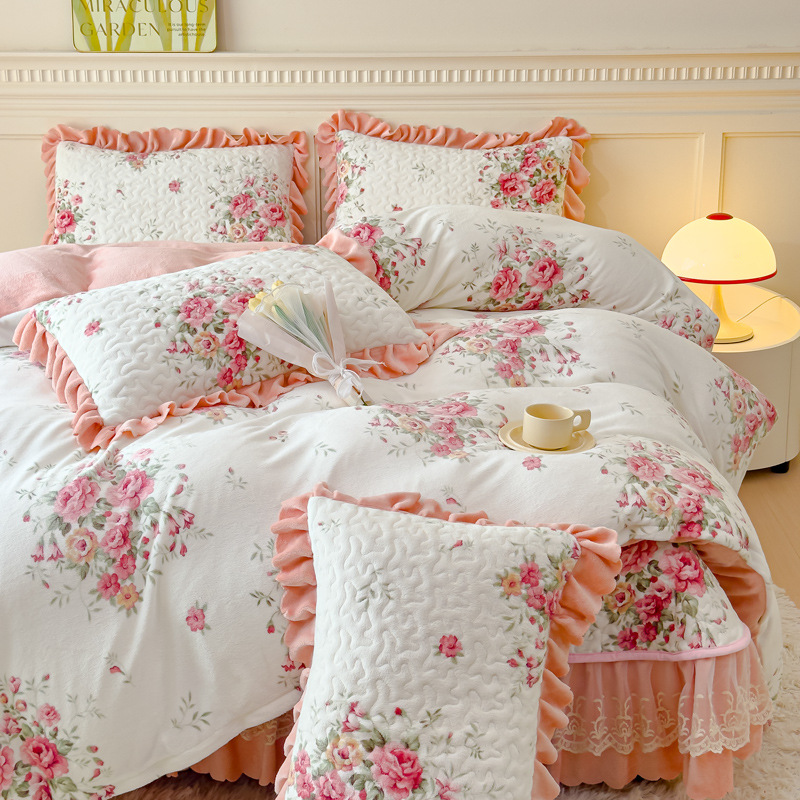 고급 두꺼운 우유 벨벳 침대 커버 4 피스 세트 작은 신선한 레이스 퀼트 커버 아기 벨벳 침대 스커트 침대 커버 공주 바람스토어 가기