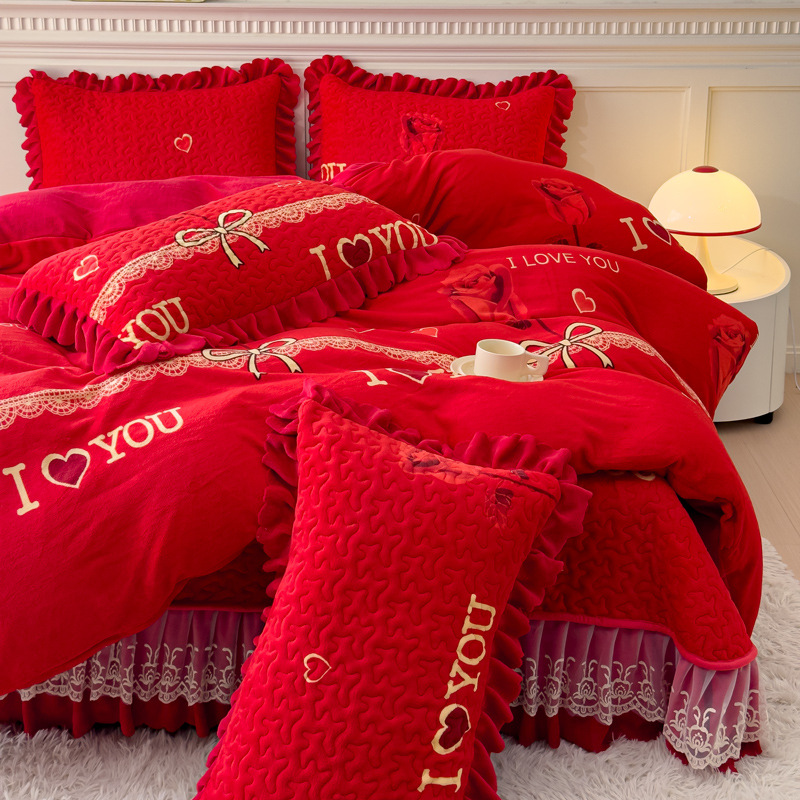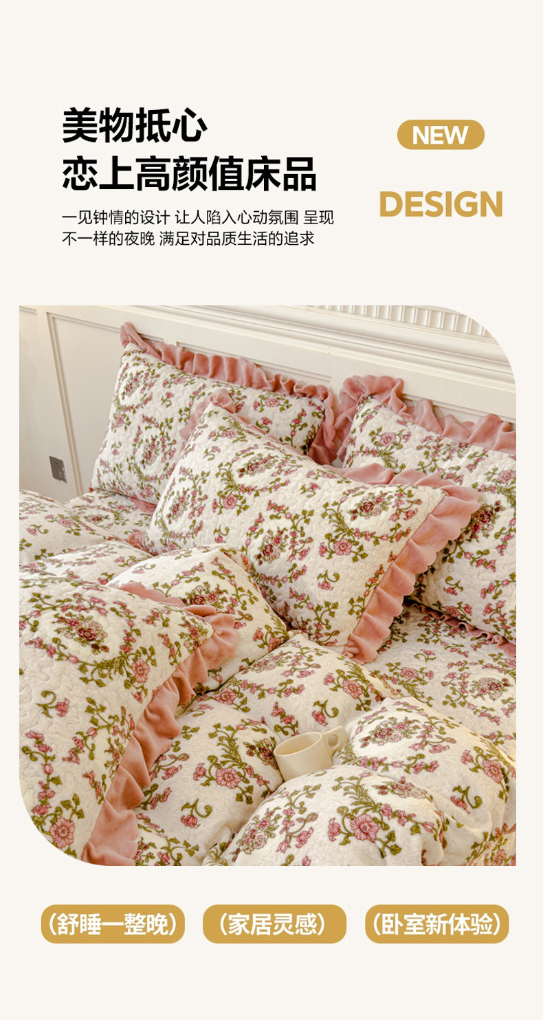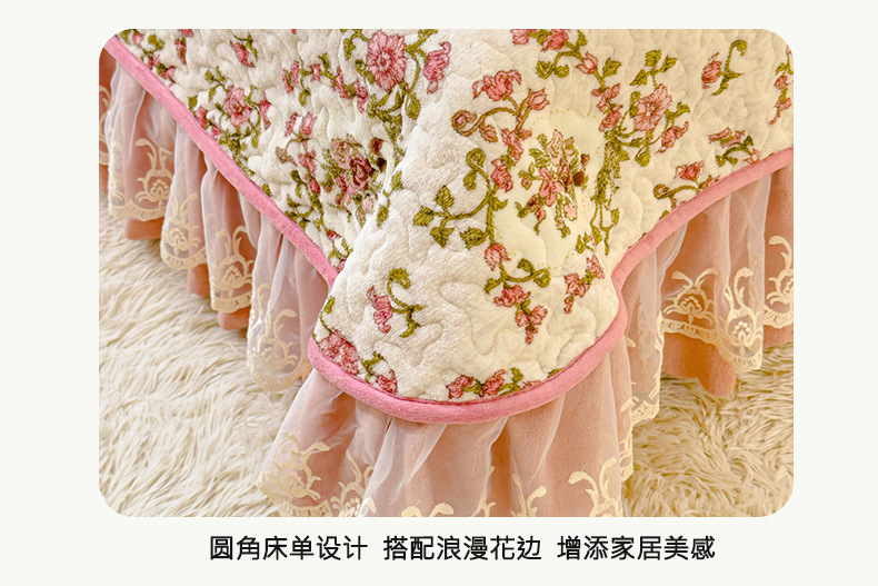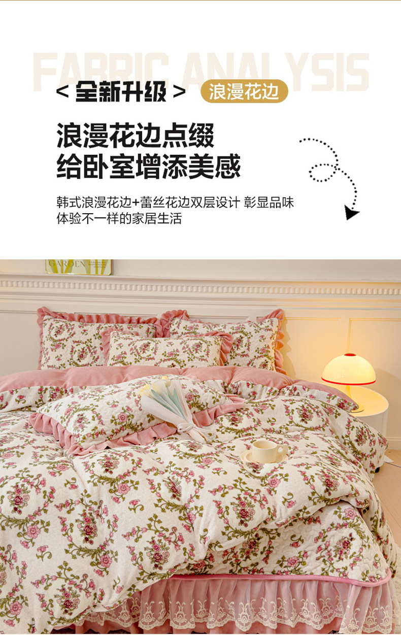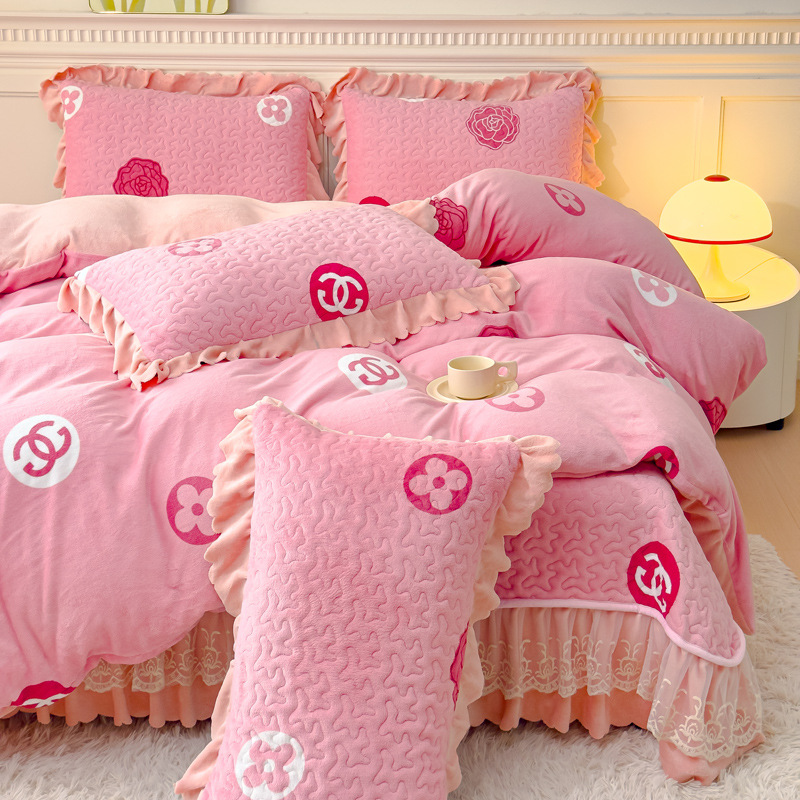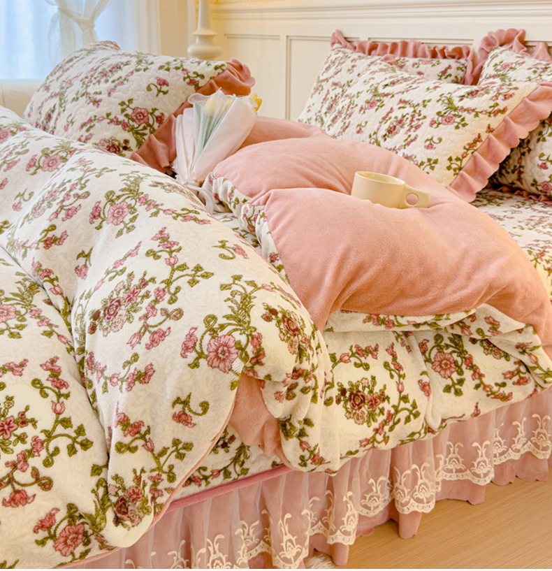 고급 두꺼운 우유 벨벳 침대 커버 4 피스 세트 작은 신선한 레이스 퀼트 커버 아기 벨벳 침대 스커트 침대 커버 공주 바람스토어 가기