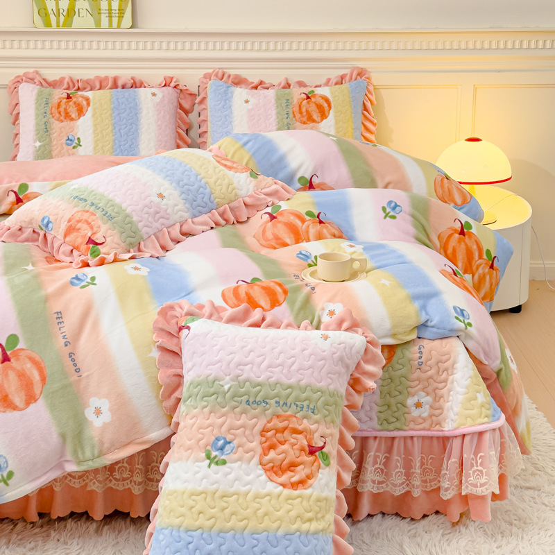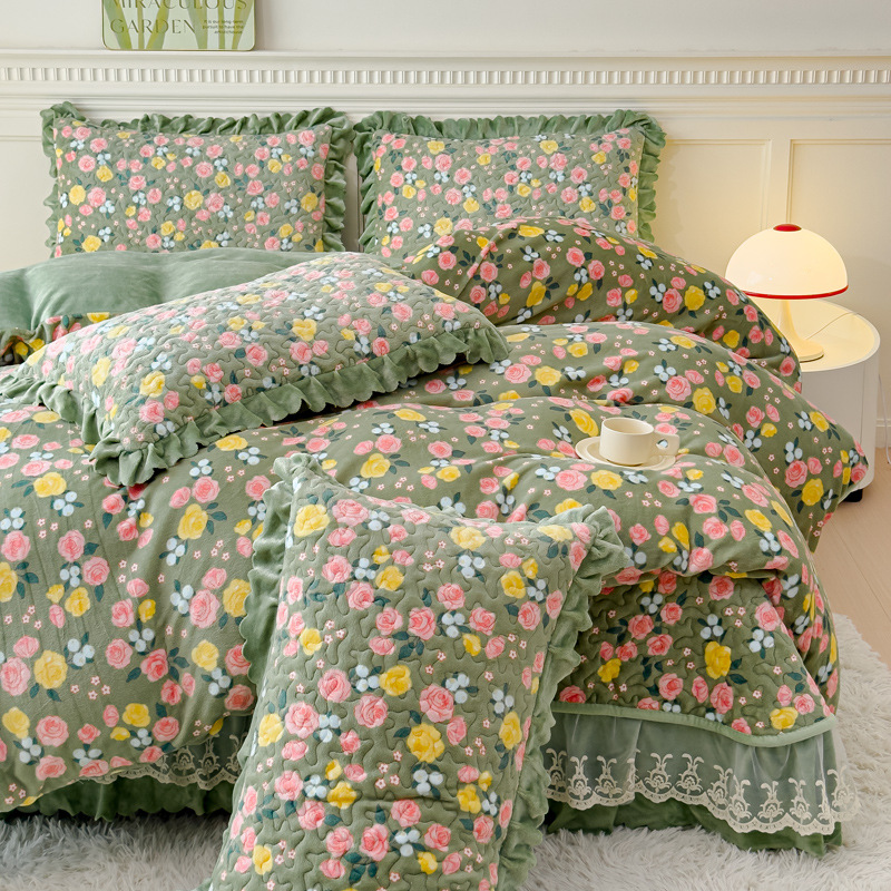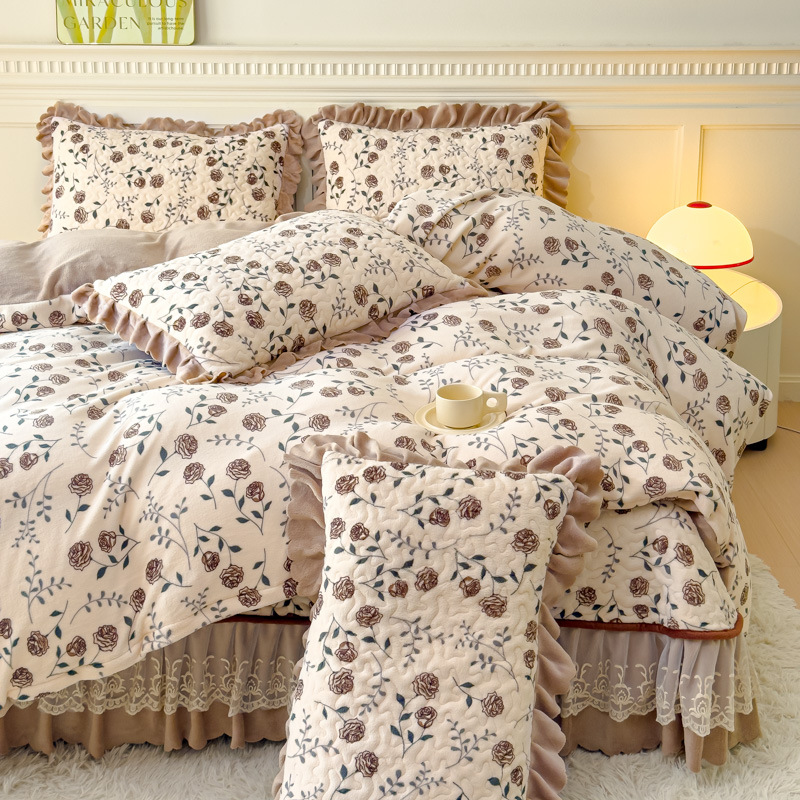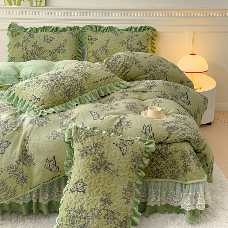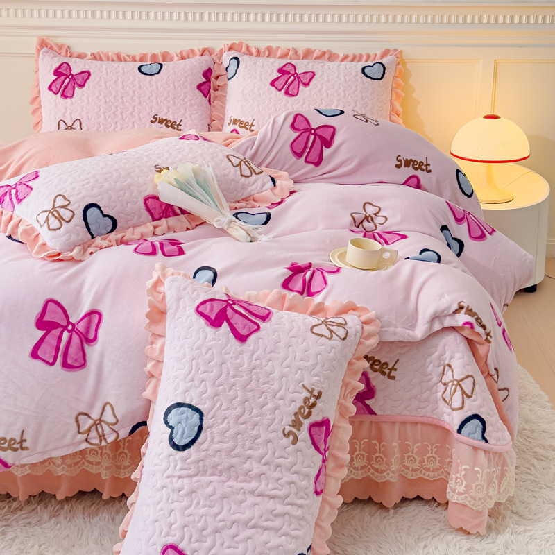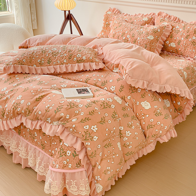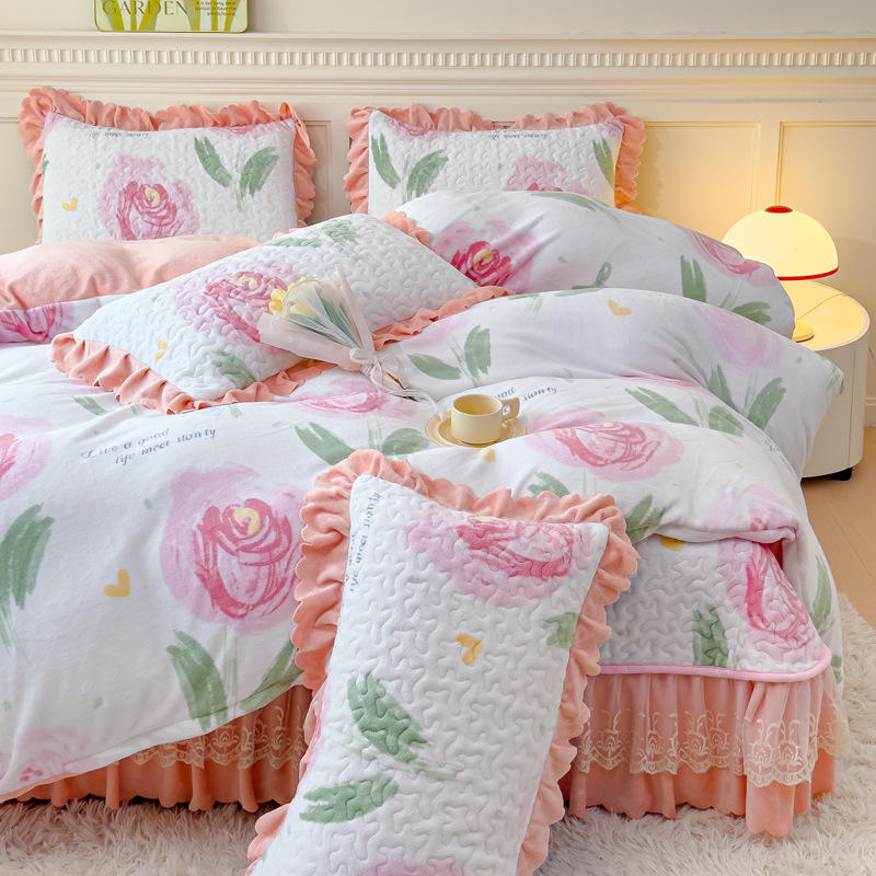 고급 두꺼운 우유 벨벳 침대 커버 4 피스 세트 작은 신선한 레이스 퀼트 커버 아기 벨벳 침대 스커트 침대 커버 공주 바람