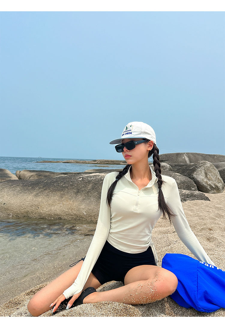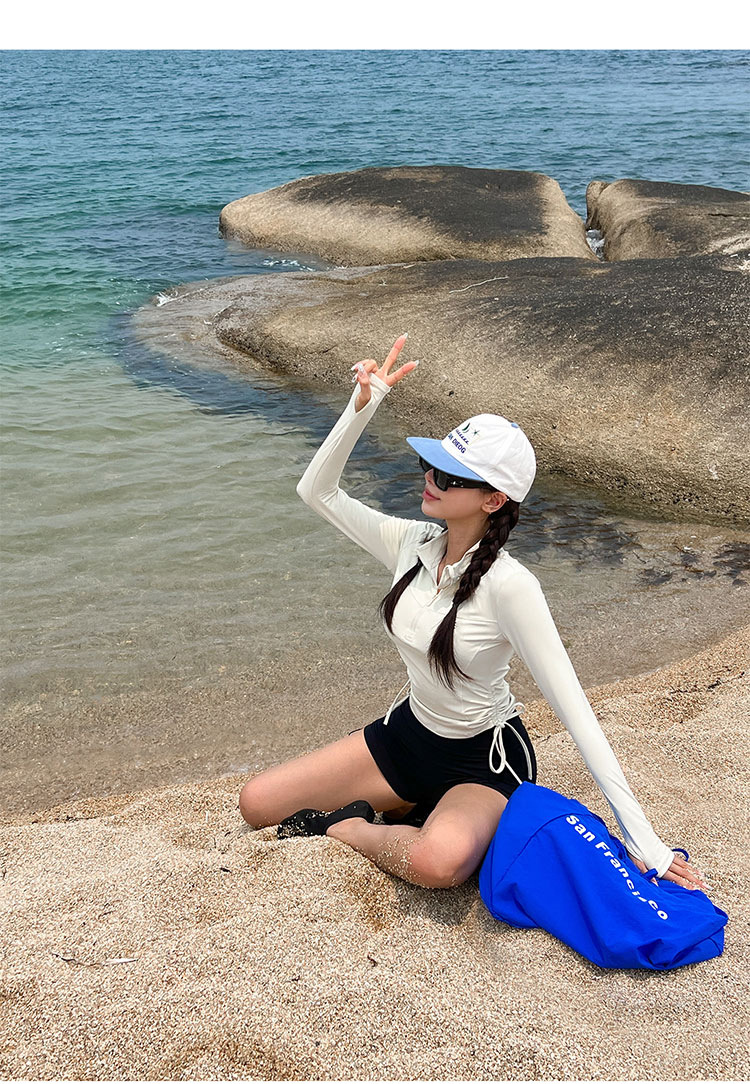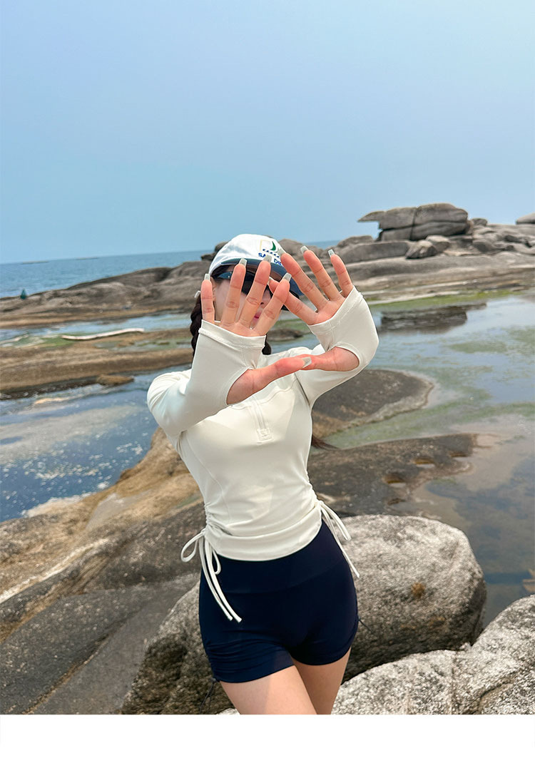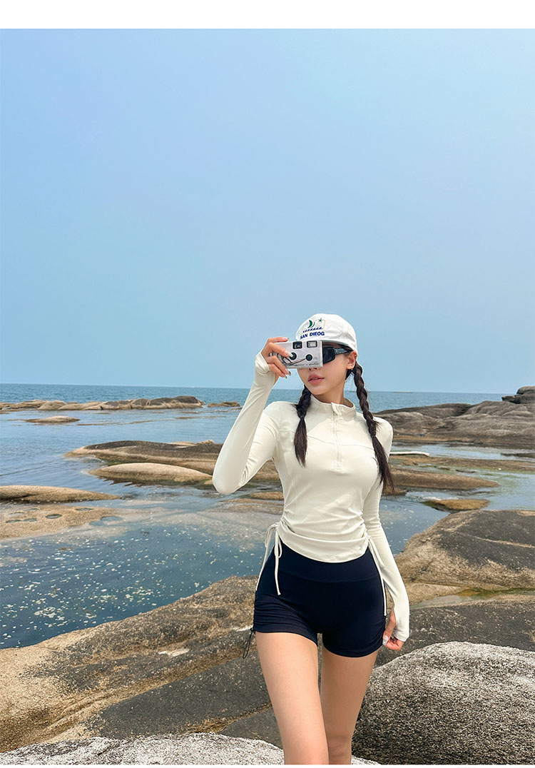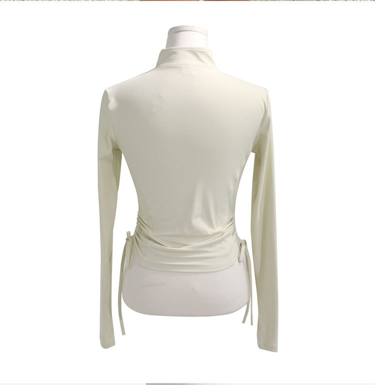 요가 옷 여성용 긴팔 지퍼 무승부 꽉 맞는 필라테스 스포츠 달리기 피트니스 탑 선 스크린 수영복 여성용