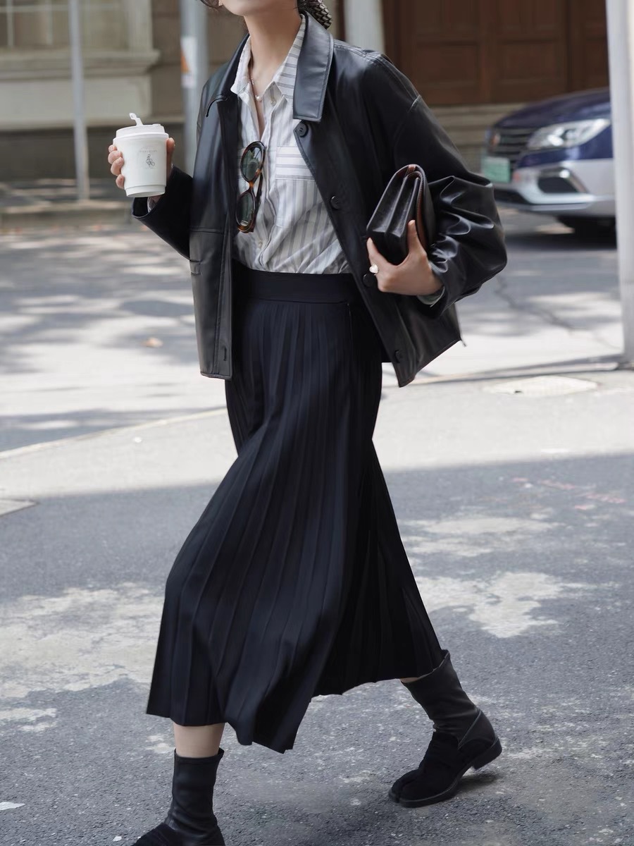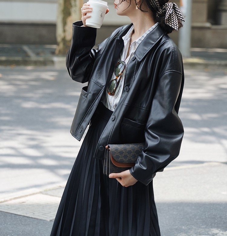 "스케치" 프랑스 레트로 블랙 가죽 여성 느슨한 짧은 가죽 재킷 코트 여성의 가을과 겨울